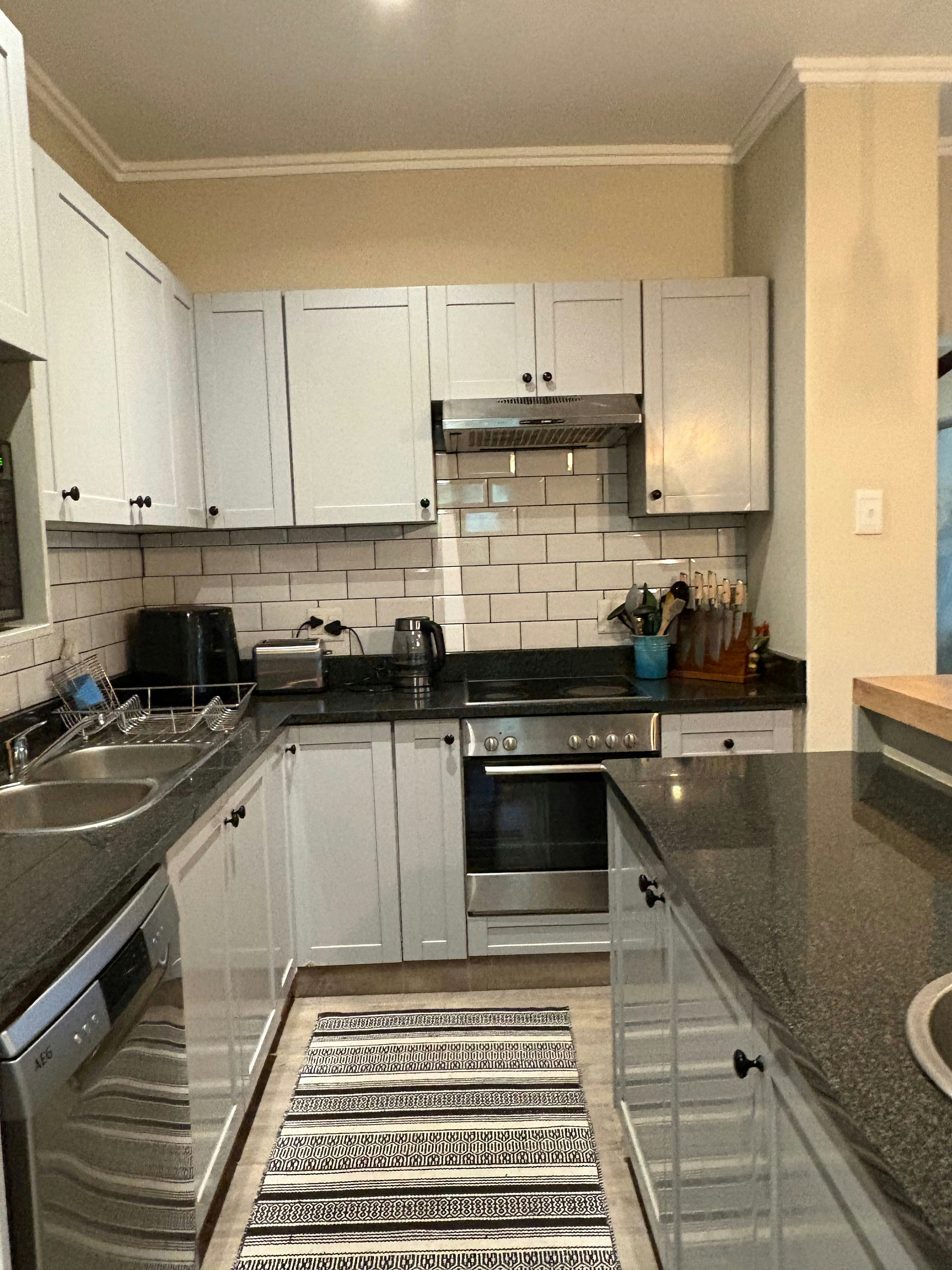The fully equipped kitchen includes a stove, oven, fridge-freezer, microwave, cutlery, and crockery. The living area offers a dining table, comfortable seating, and a TV. The house is fitted with solar panels, which runs all plug points off of it. It does not run the aircon, geyser, stove, or oven.