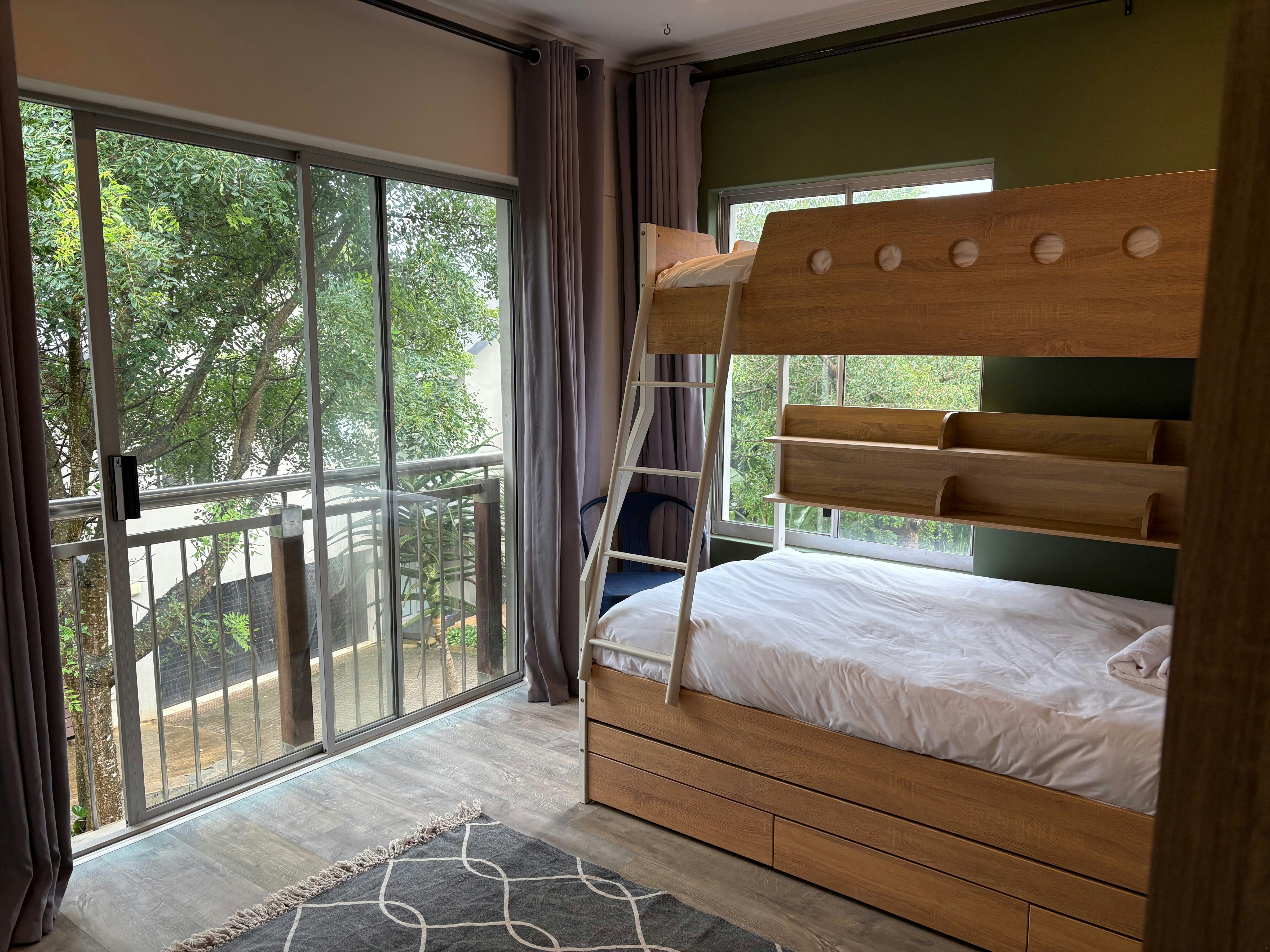 The townhouse features 3 bedrooms, 2 bathrooms, and a guest toilet. The main bedroom is furnished with a king-size bed and has an en-suite bathroom fitted with a bath and shower. The second bedroom has a double bed, while the third bedroom includes a bunk bed- single on top and euro size at the bottom with an extra pull-out single mattress. This bedroom is suitable for 3 children only. The second bathroom is small and fitted with a shower.