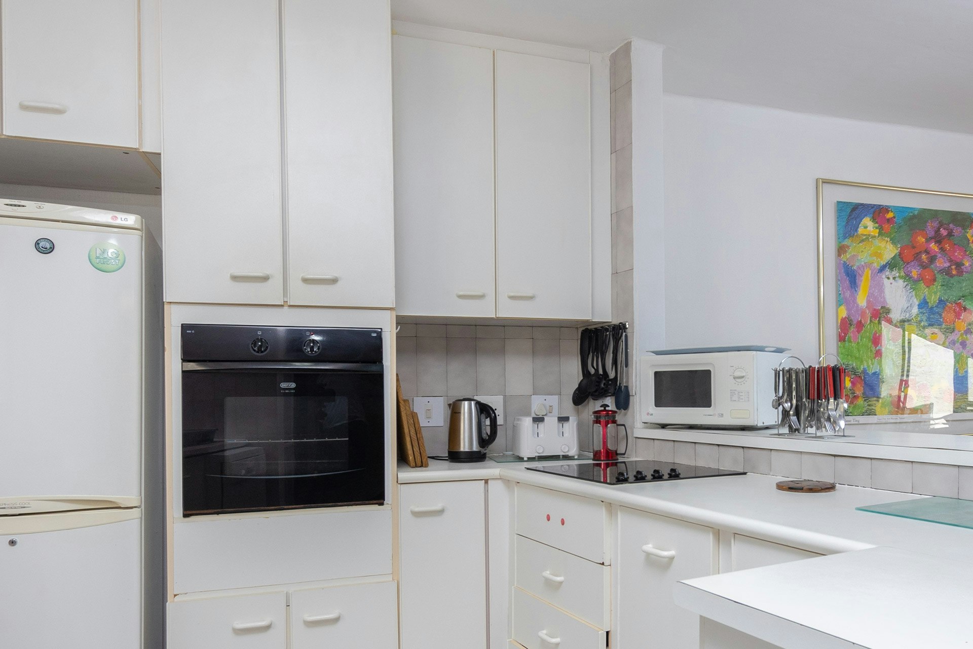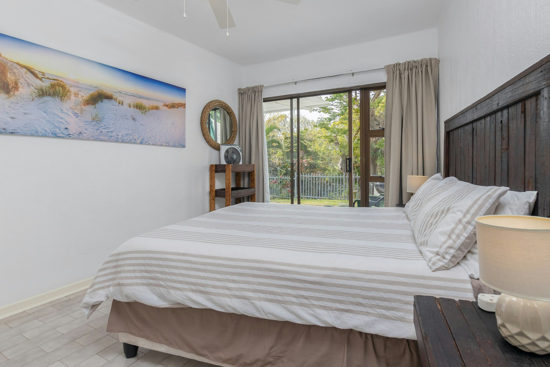 Bedroom 1 is downstairs and has a queen-size bed, while the downstairs bathroom features a basin, toilet, and shower. Bedrooms 2, 3 and 4 are upstairs with a queen-size bed, a double, and 2 bunk beds. There are 2 upstairs bathrooms, the first with a shower, toilet, and basin, and the second with a bath, toilet, and basin. All upstairs bedrooms open onto a balcony overlooking the pool. All linen, towels, and beach towels are provided. All bedrooms have large built-in cupboards, hangers, and ceiling fans.