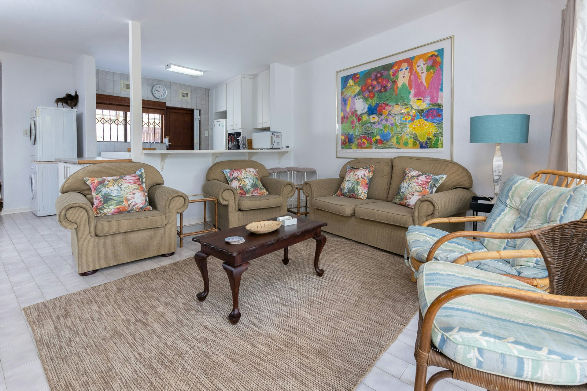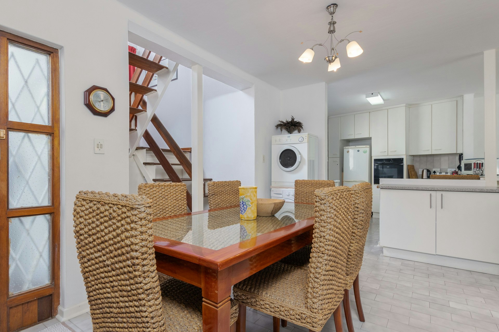 The kitchen is fully equipped for self-catering and includes a stove, oven, fridge-freezer, washing machine, tumble dryer, microwave, dishwasher, cutlery, and crockery. The living area features a dining table, comfortable seating, and a TV with DSTV, streaming from your own account. Wi-Fi access is provided.