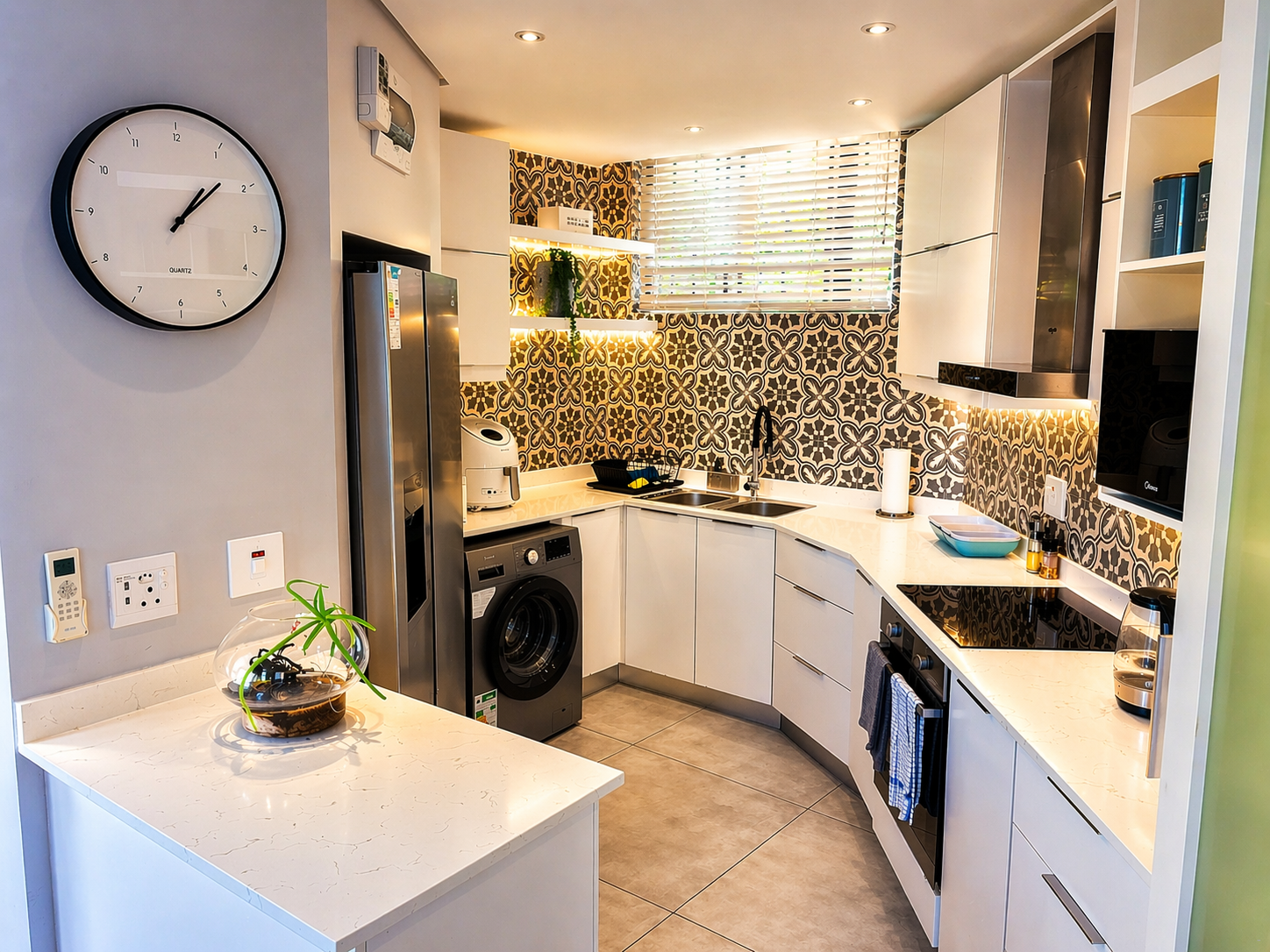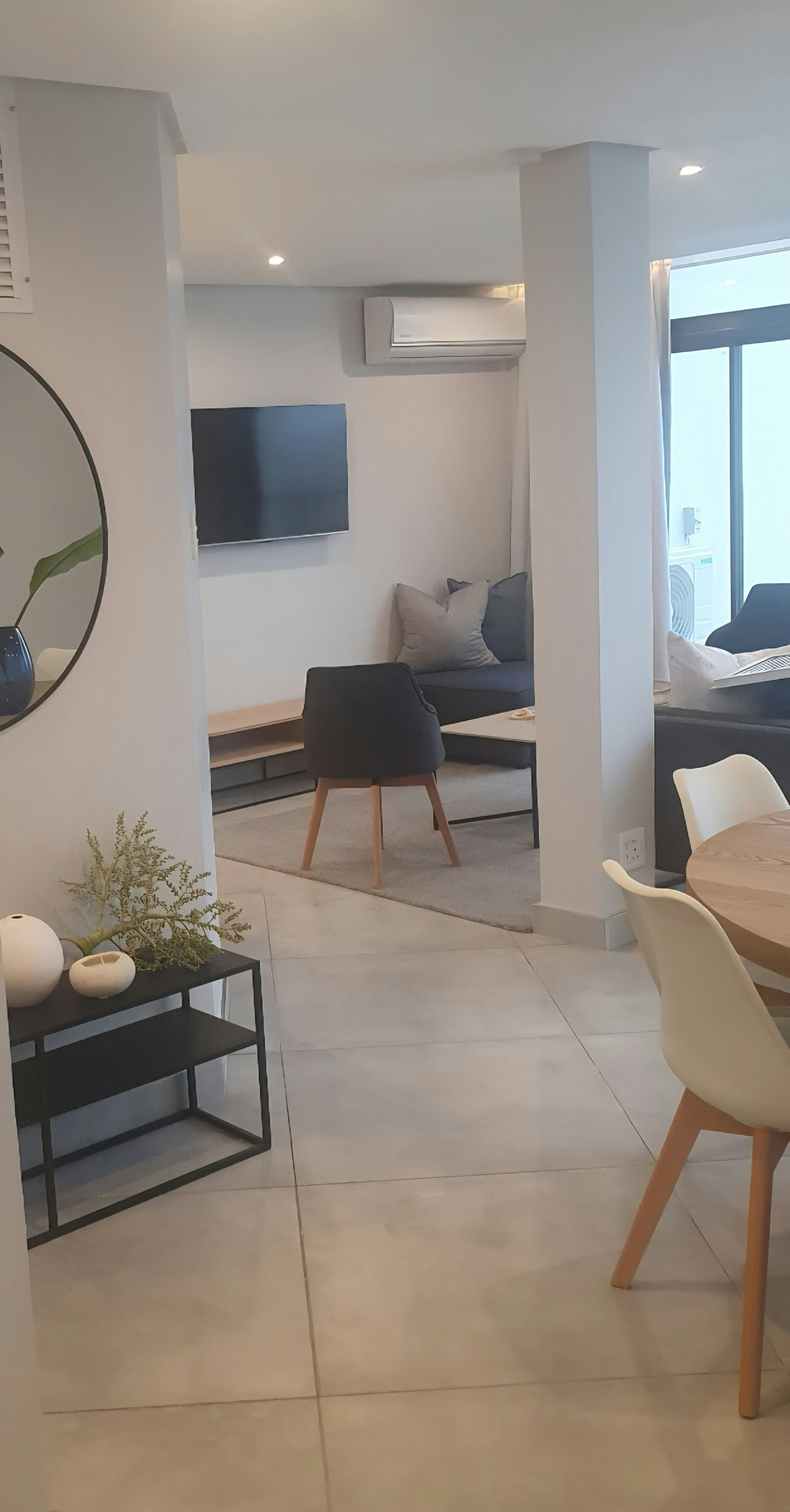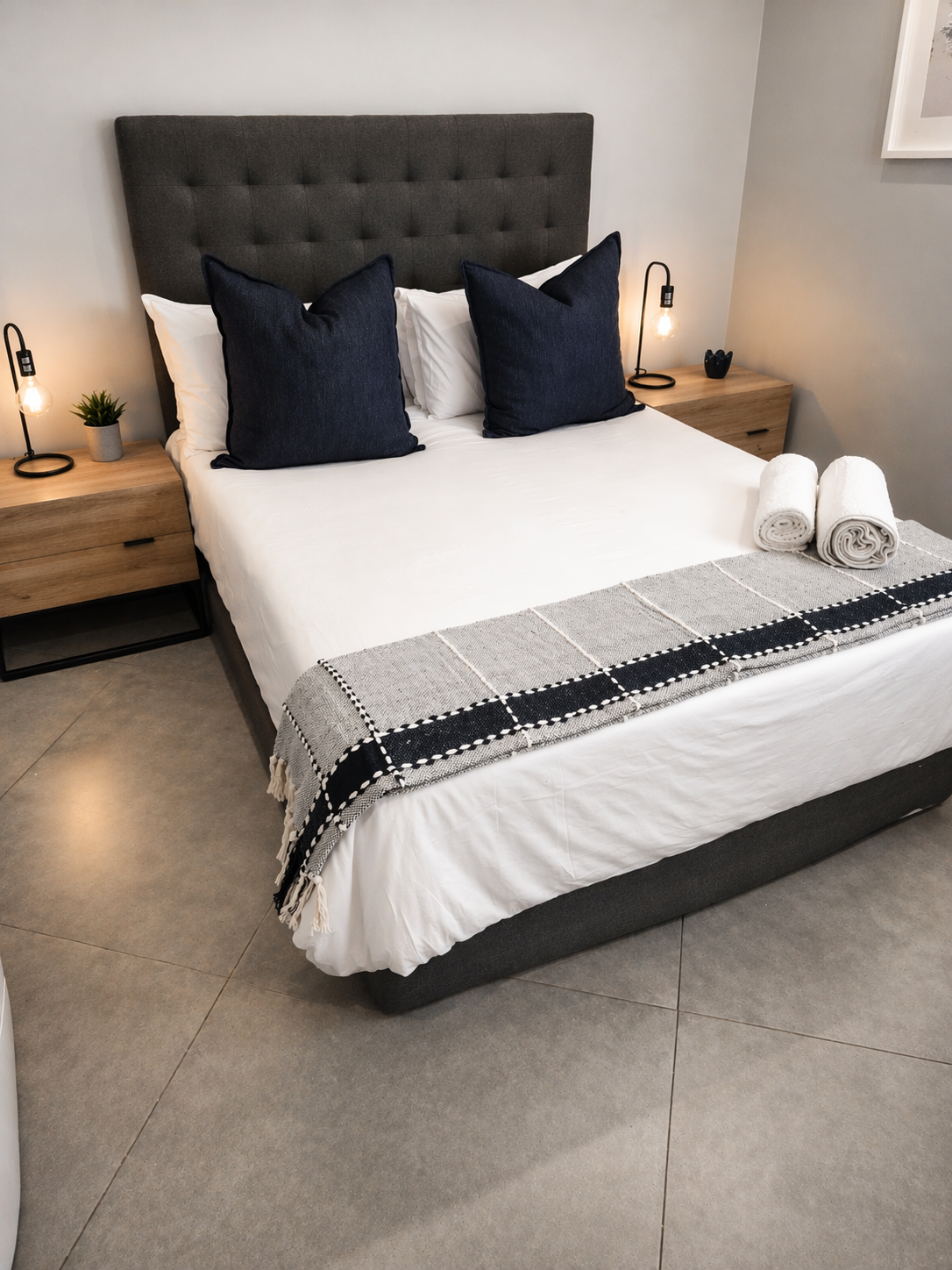 The open-plan living area includes a modern kitchen equipped with a fridge-freezer, stove, oven, microwave, air fryer, cutlery and crockery, and tea- and coffee-making facilities. A washing machine is also available for added convenience. Adjacent to the kitchen, the air-conditioned lounge offers ample comfortable seating, a wall-mounted smart TV with streaming services, and complimentary Wi-Fi access.