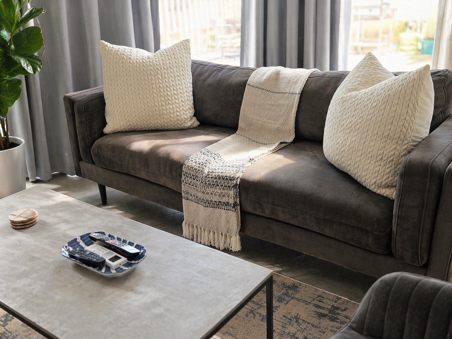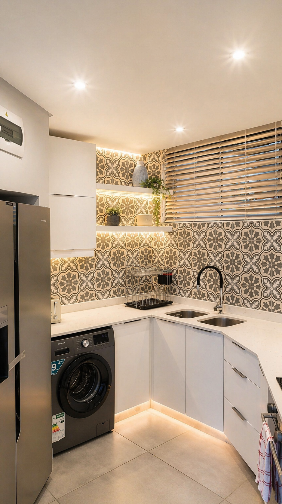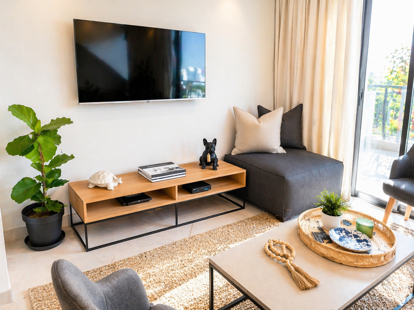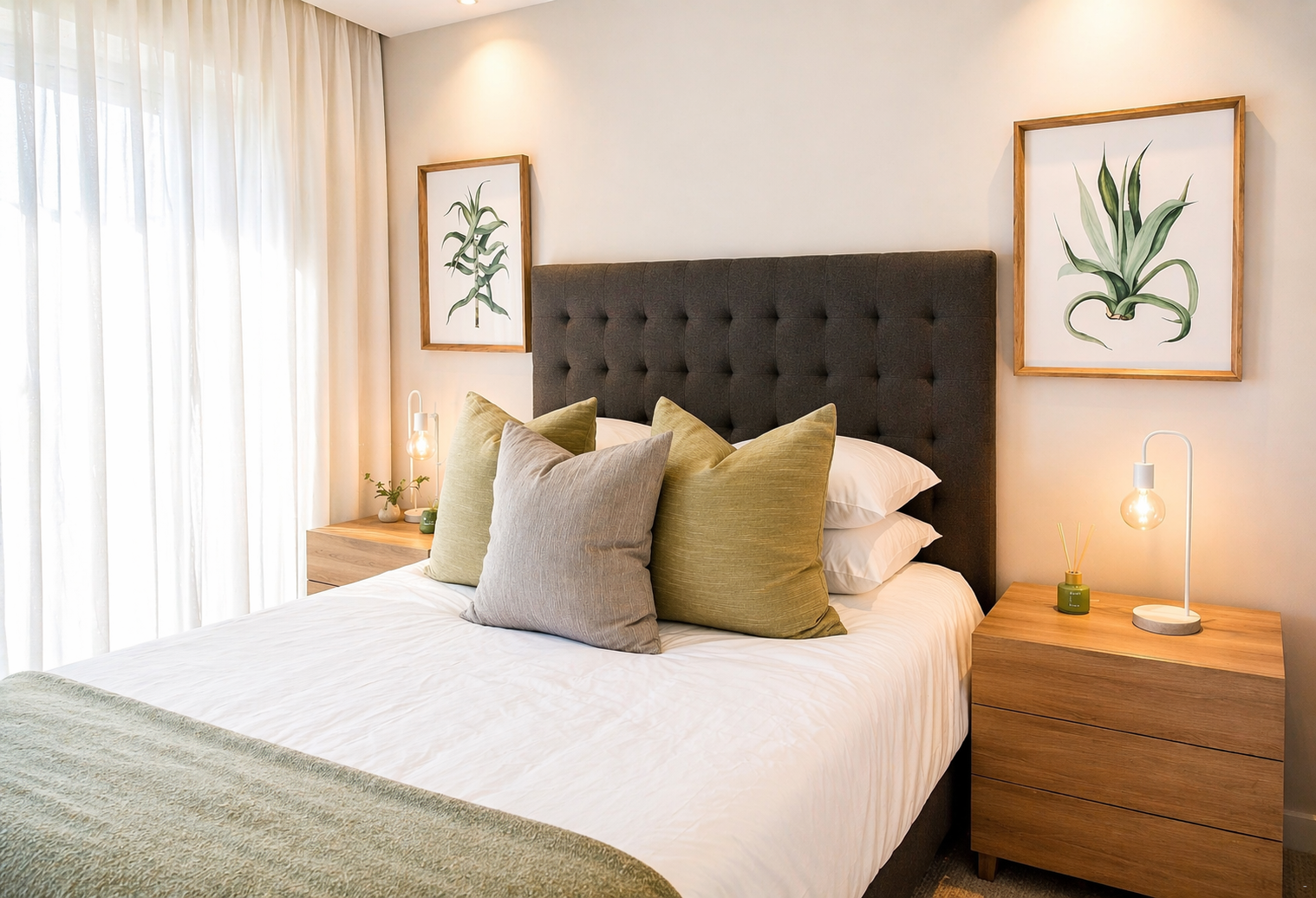 The open-plan living area includes a modern kitchen equipped with a fridge-freezer, stove, oven, microwave, air fryer, cutlery and crockery, and tea- and coffee-making facilities. A washing machine is also available for added convenience. Adjacent to the kitchen, the air-conditioned lounge offers ample comfortable seating, a wall-mounted smart TV with streaming services, and complimentary Wi-Fi access.