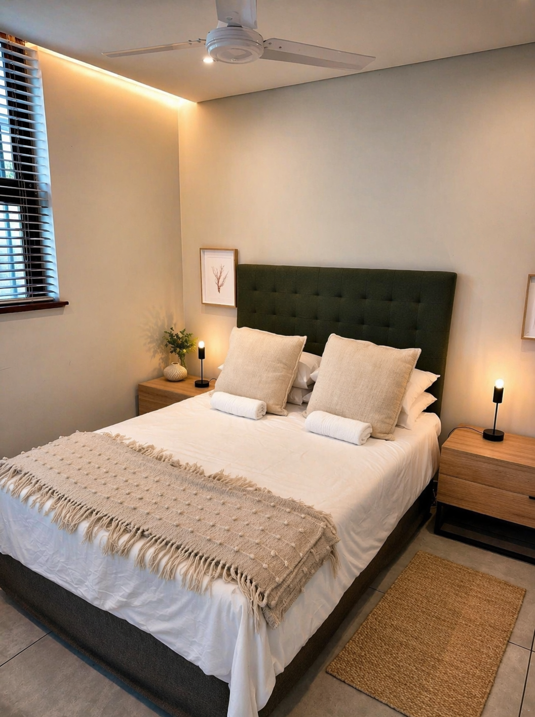 The unit can accommodate up to 6 guests and comprises 3 bedrooms and 2 bathrooms. The air-conditioned main bedroom is furnished with a queen-size bed, and the en-suite bathroom is fitted with a shower, washbasin, and toilet. Bedrooms two and three each contain a queen-size bed and share a bathroom fitted with a shower, washbasin, and toilet. Crisp white linen and bath towels are provided; however, guests are required to bring their own beach towels.