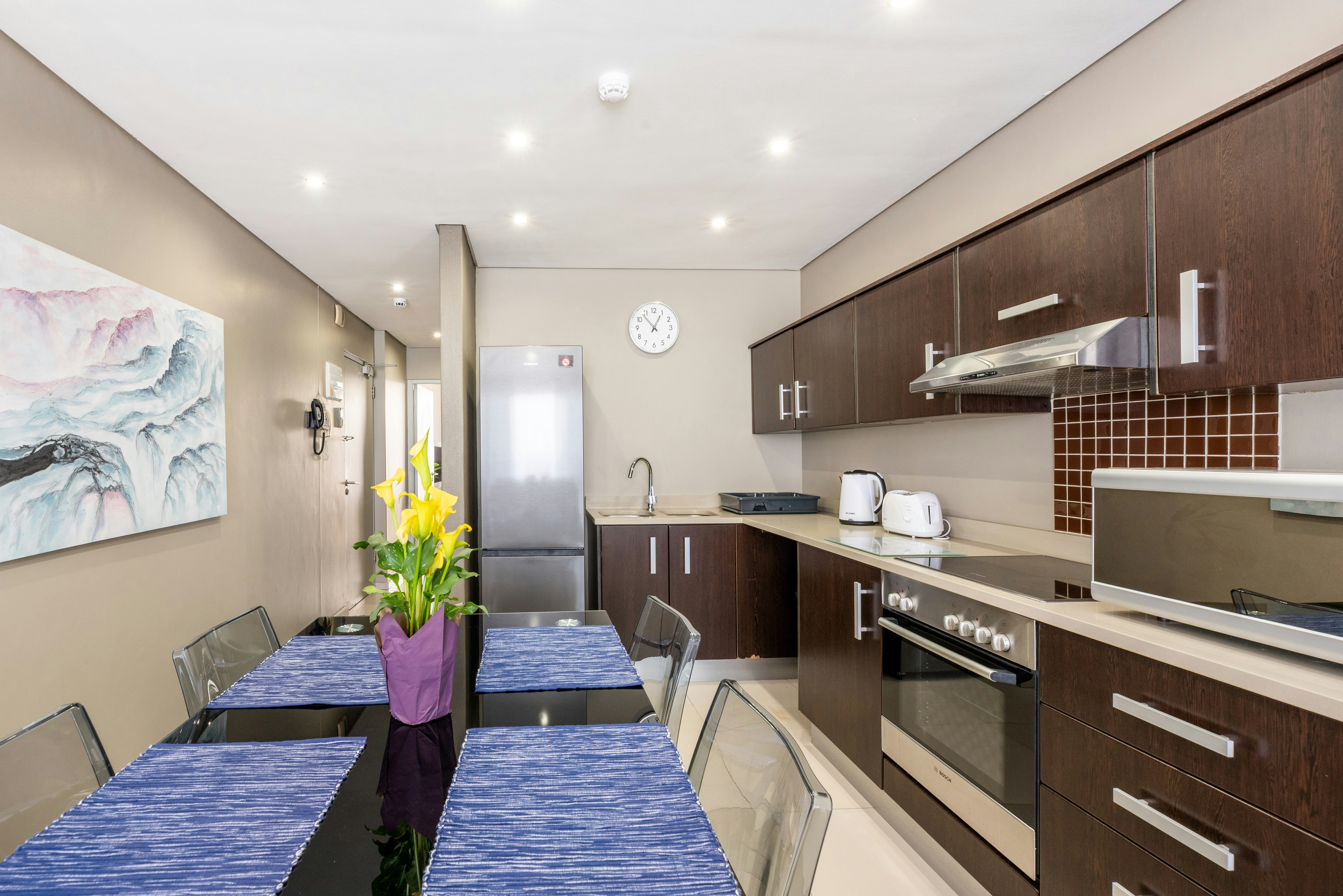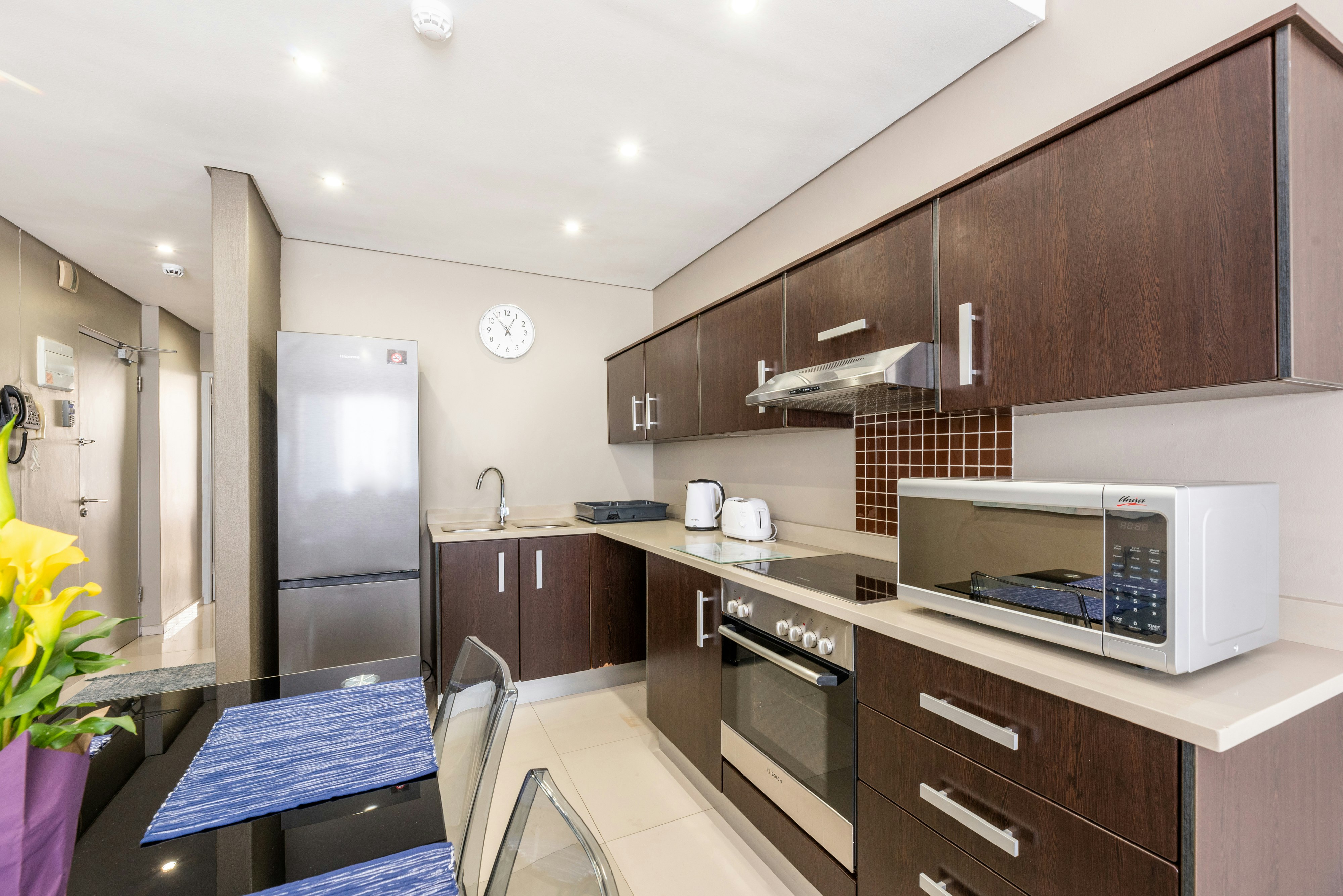 The kitchen is equipped for self-catering with a fridge-freezer, oven, stove, and microwave, as well as tea- and coffee-making facilities, and features a 4-seater dining table and chairs. The living area contains a TV with Netflix and comfy couches and leads out onto a balcony where guests can enjoy views of Table Mountain whilst enjoying a morning coffee, or an evening sunset. Wi-Fi is available throughout the apartment.