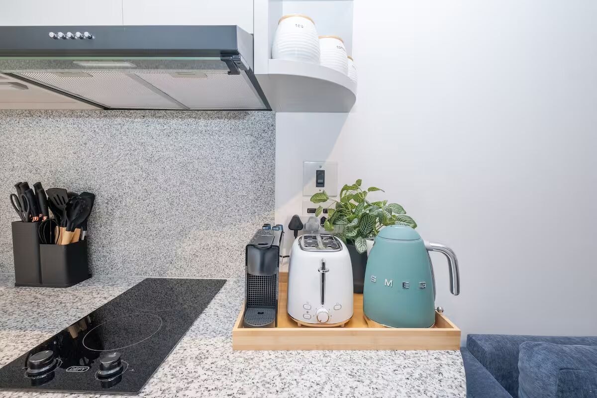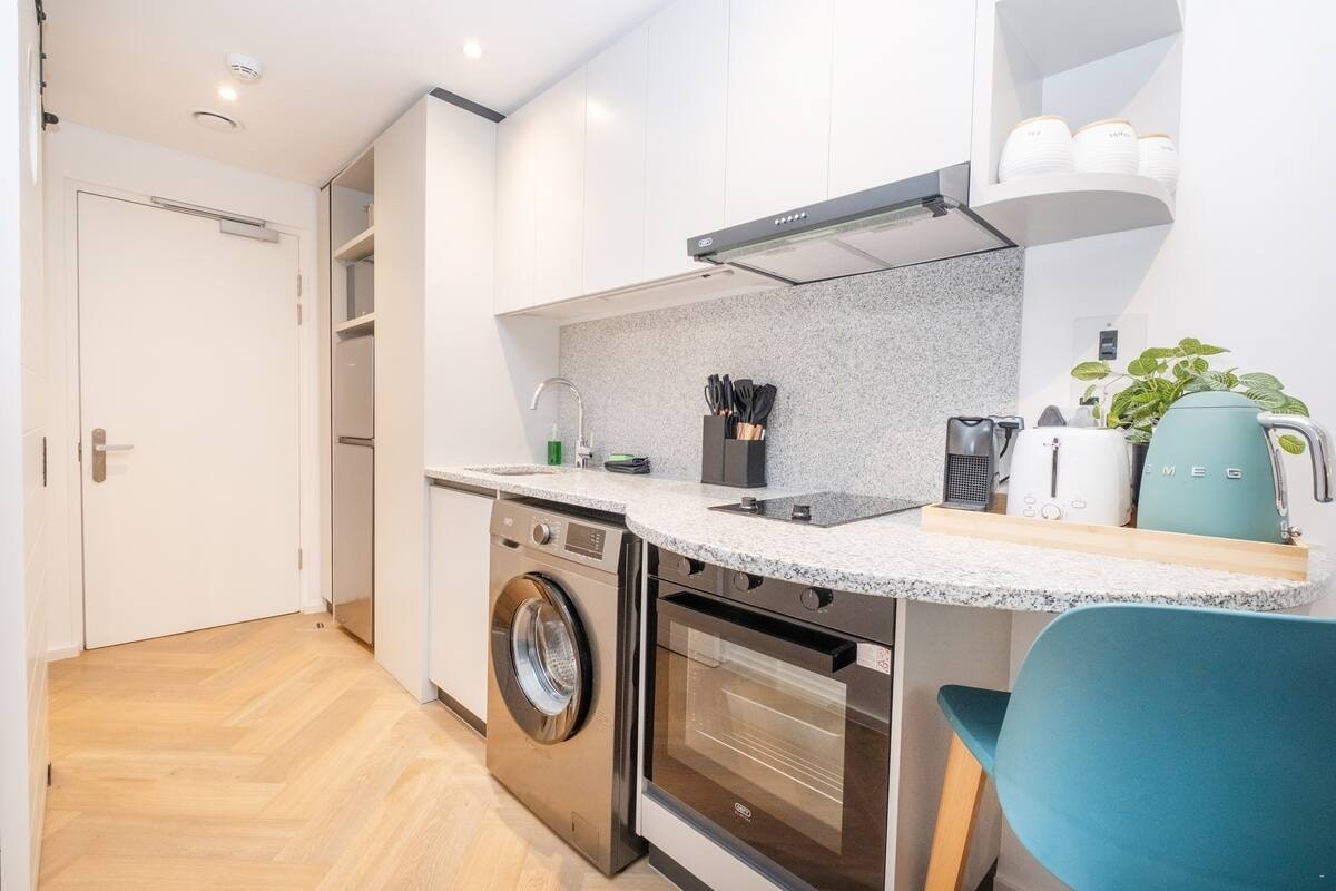 The well-equipped kitchenette is equipped with a fridge-freezer, stove, oven, microwave, kettle, cutlery, crockery, and tea- and coffee-making facilities. A washing machine is available for added convenience. The lounge and dining area offer comfortable seating, and for entertainment, a smart TV and free Wi-Fi are available.