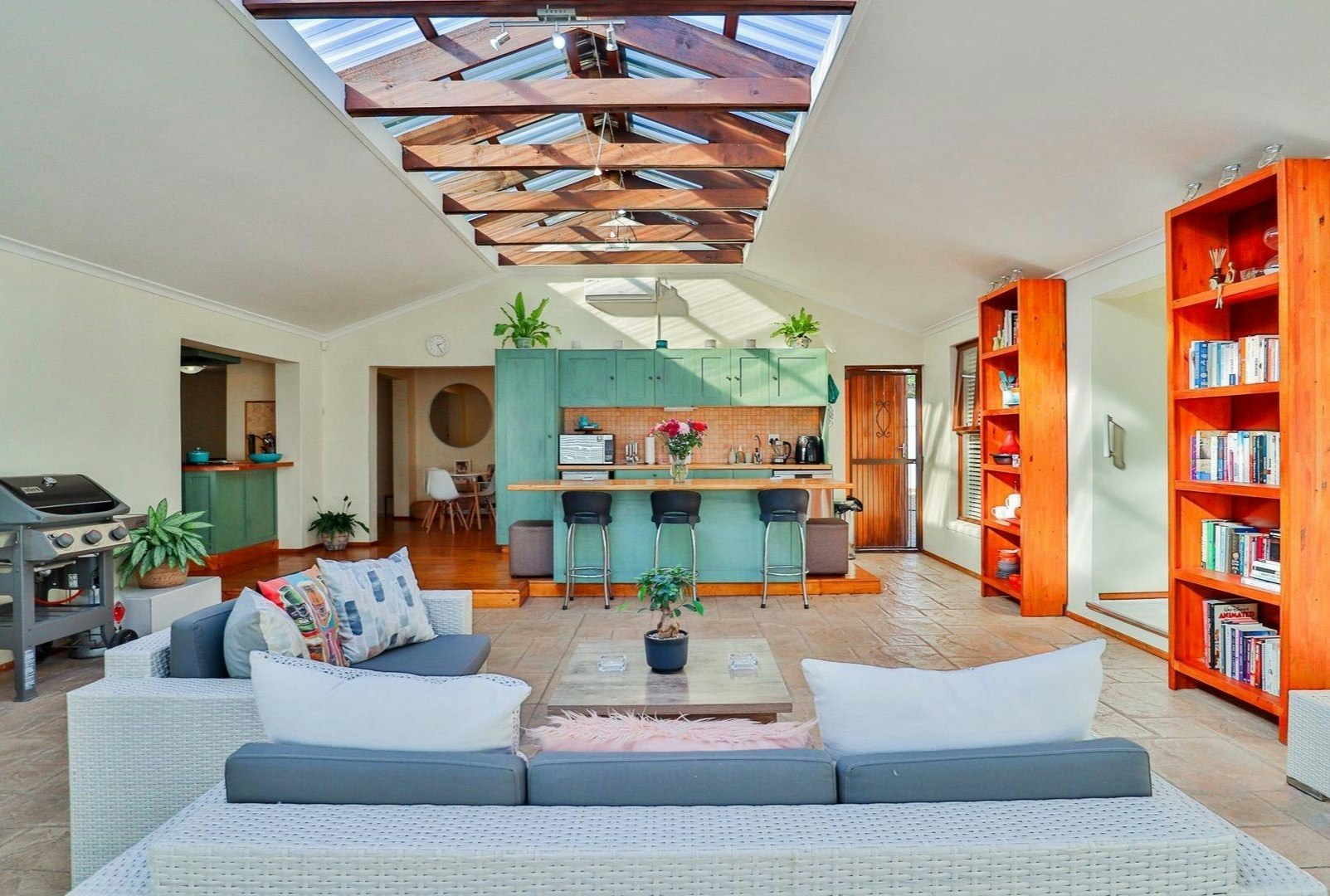 The living area features an open-plan design with a fully equipped kitchen, including a stove, oven, microwave, fridge-freezer, air fryer, kettle, cutlery, and crockery. For added convenience, a dishwasher, tumble dryer, and washing machine are also available. A 6-seater dining table adjacent to the kitchen is perfect for meals. The lounge area is furnished with comfortable seating, a TV with YouTube and Netflix, Disney Plus, Amazon Prime, and Showmax, along with free Wi-Fi facilities. An indoor wood and gas braai is also available for guests to enjoy. Complimentary wood included.