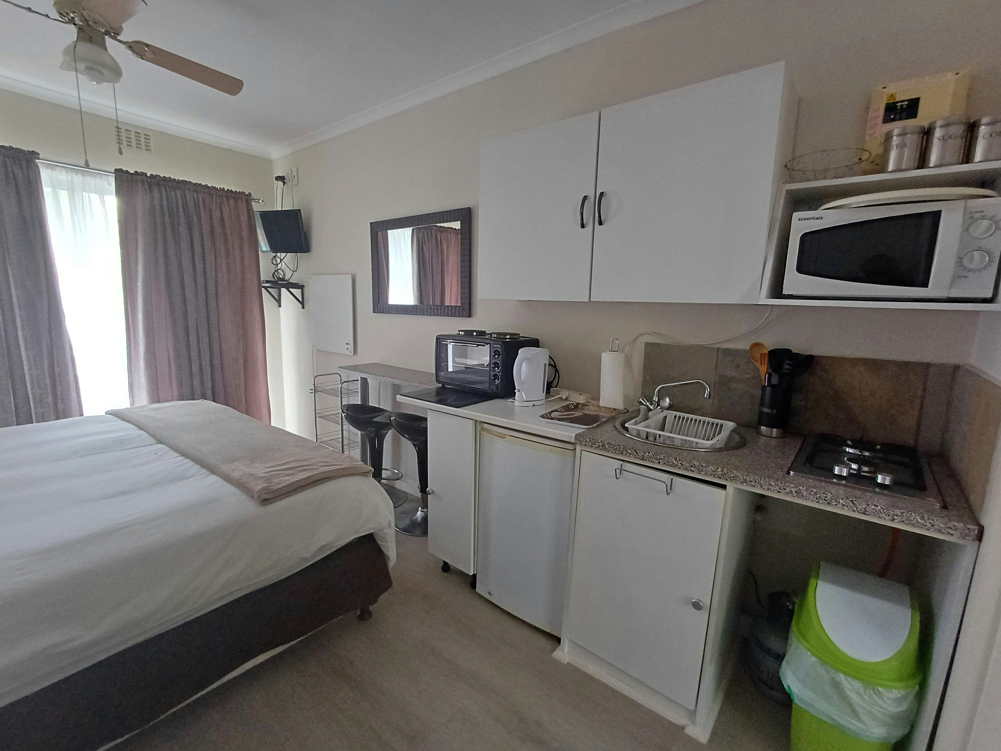 The unit also includes a work desk and a kitchenette equipped with a microwave, bar fridge, gas stove, electric oven, cutlery, crockery, and tea- and coffee-making facilities. Additional in-room amenities feature a TV and complimentary Wi-Fi. For added comfort during warmer summer days, the room provides a ceiling fan.
