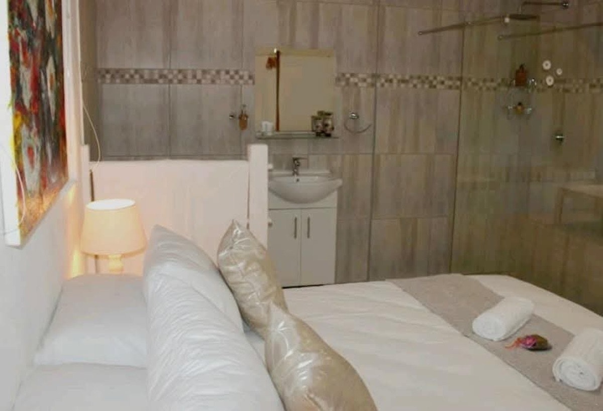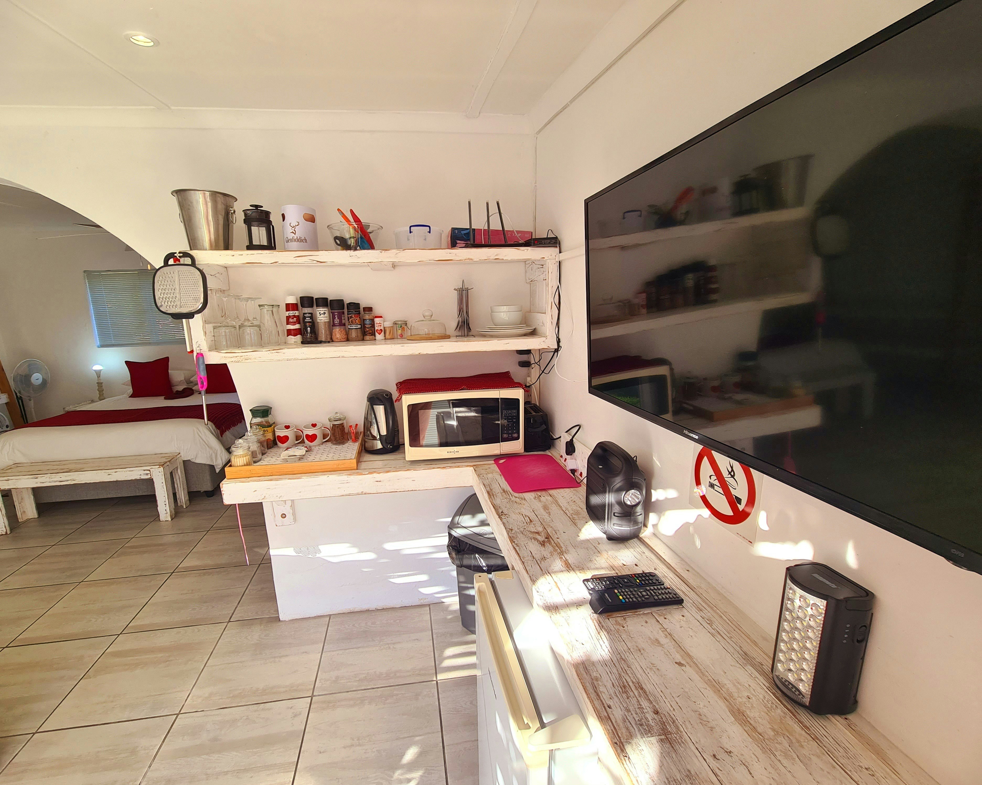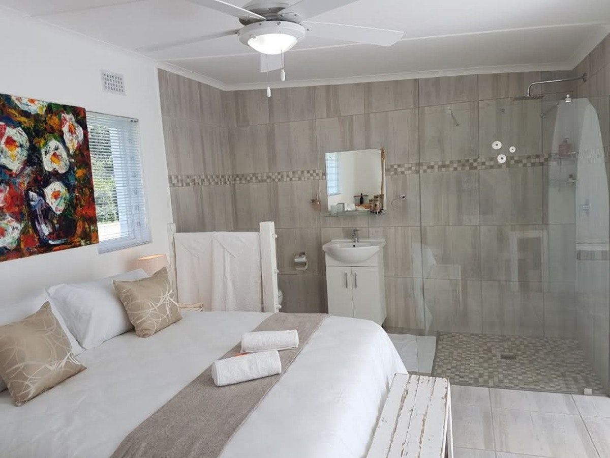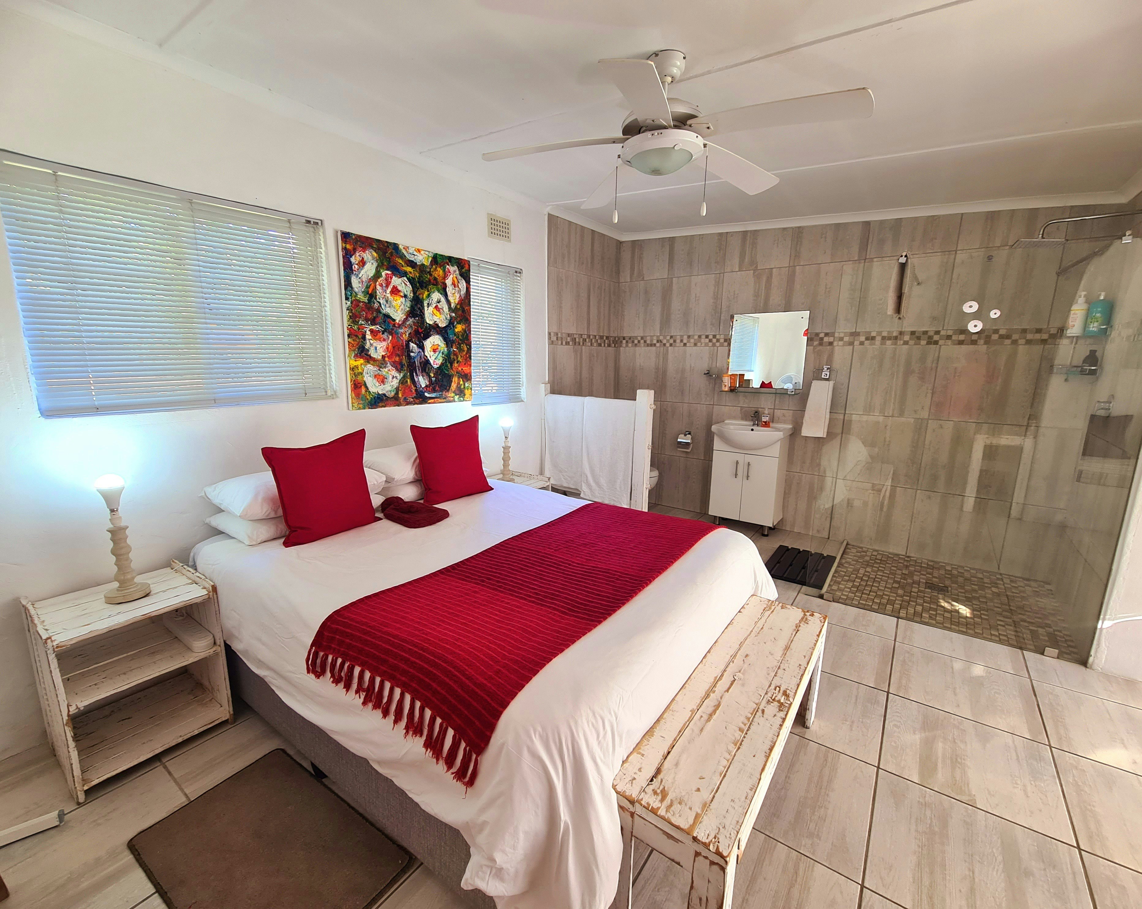 Deluxe Chalet is the largest of the 3 chalets on the property. It is spacious and comprises an open-plan bedroom with a queen-size bed and an en-suite open-plan bathroom with a shower, basin and toilet. The chalet comprises a living area and a kitchenette. The kitchenette is equipped with a fridge, microwave, cutlery and crockery, kettle, and a plunger for filter coffee. The front glass sliding door opens up to the communal swimming pool with a mountain view. In addition, the chalet is equipped with free uncapped Wi-Fi and a TV with selected DStv channels.