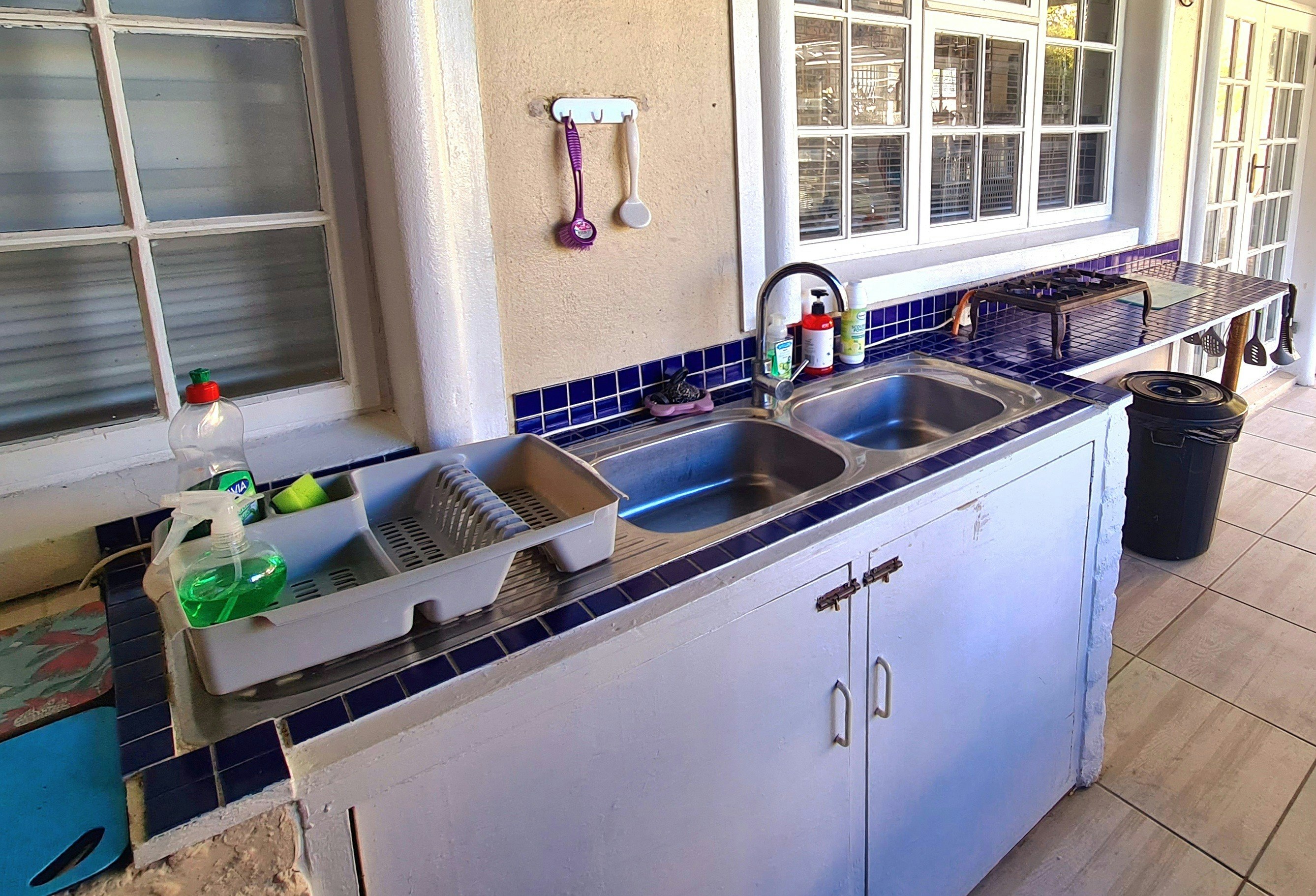There is a communal outside wash-up area with a double sink and a 2-plate gas stove for cooking.