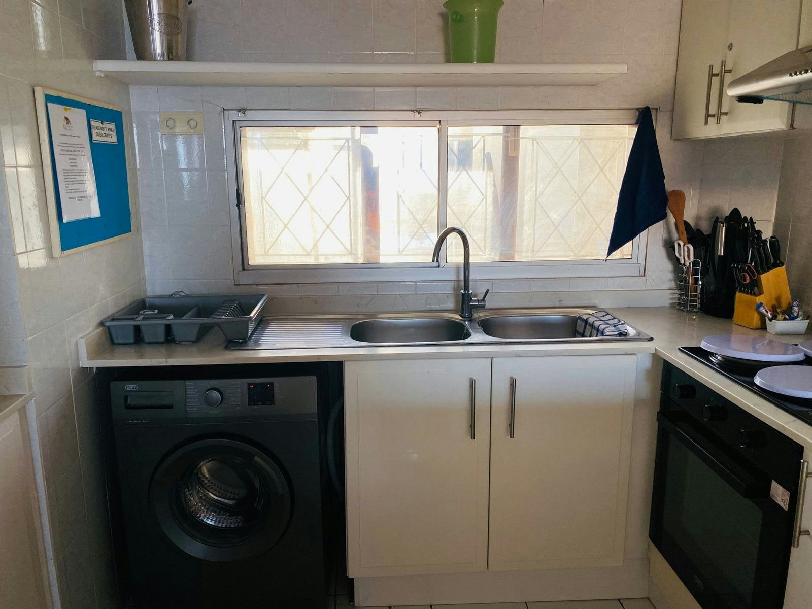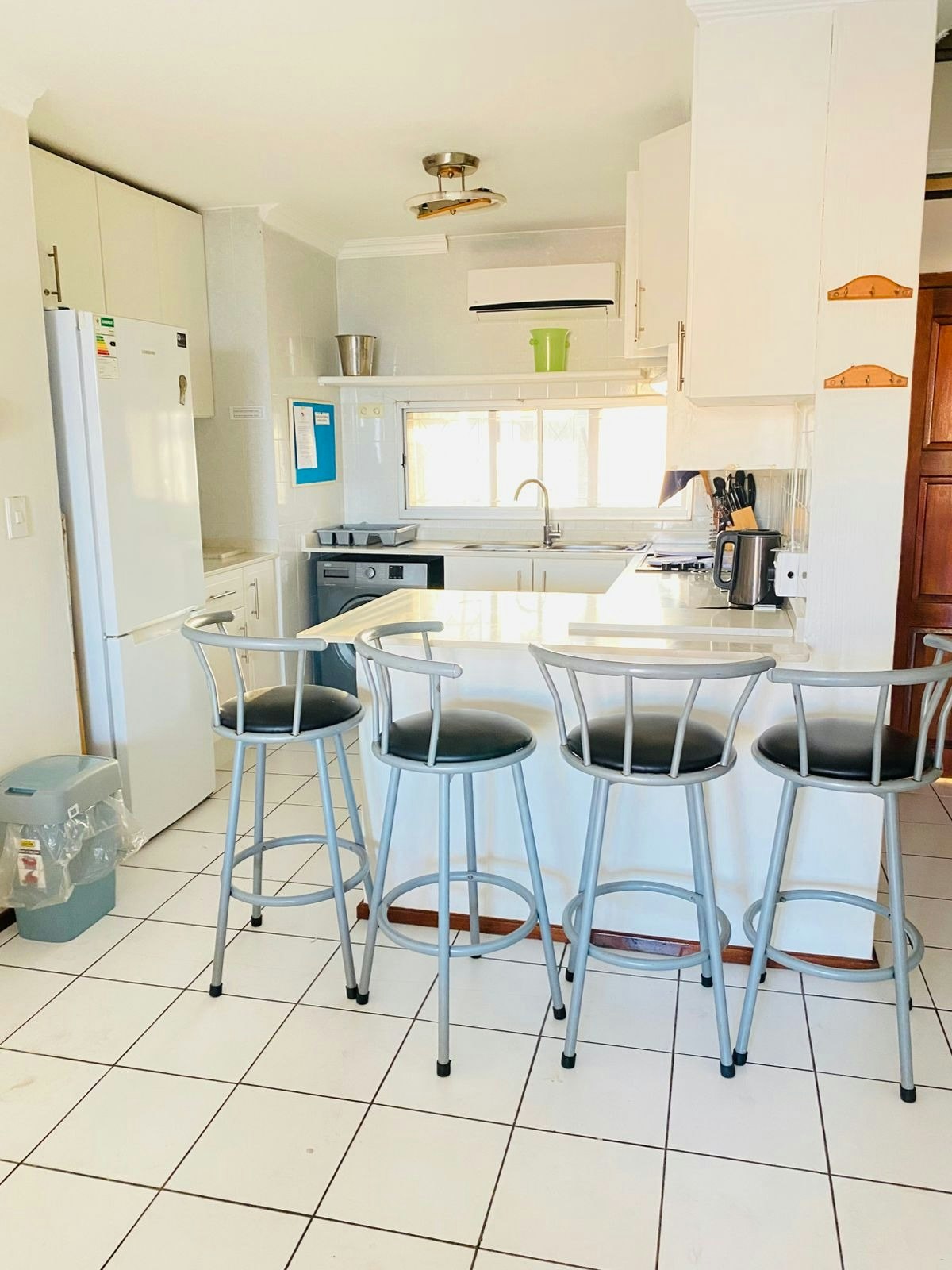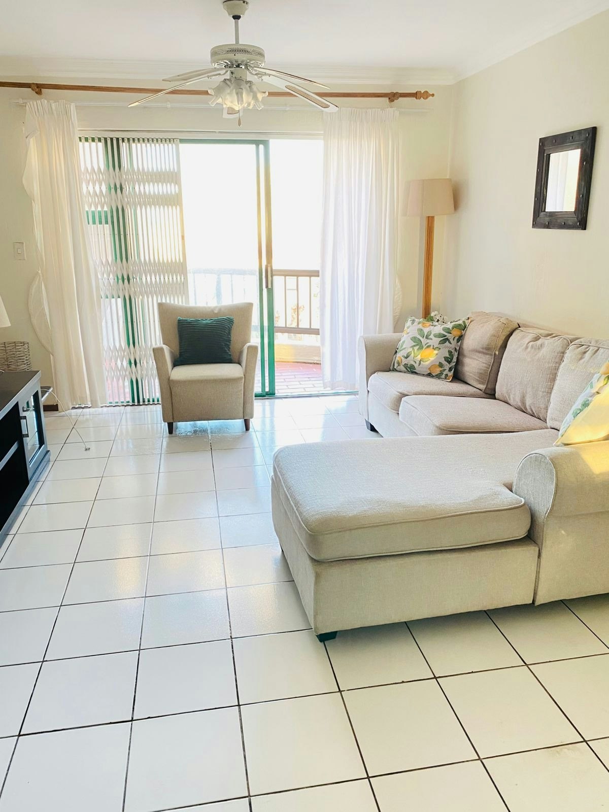 Die oopplan-leefarea bied 'n knus en verwelkomende ruimte met gemaklike sitplek en 'n TV, perfek om te ontspan na 'n dag op die strand. Die kombuis is volledig toegerus met 'n yskas-vrieskas, stoof, oond, mikrogolfoond, wasmasjien en koffie- en teemaakgeriewe, wat verseker dat gaste alles het wat hulle nodig het vir 'n selfsorgverblyf. Gaste kan buite stap na 'n privaat balkon, waar hulle kan ontspan en die braaigeriewe kan geniet.