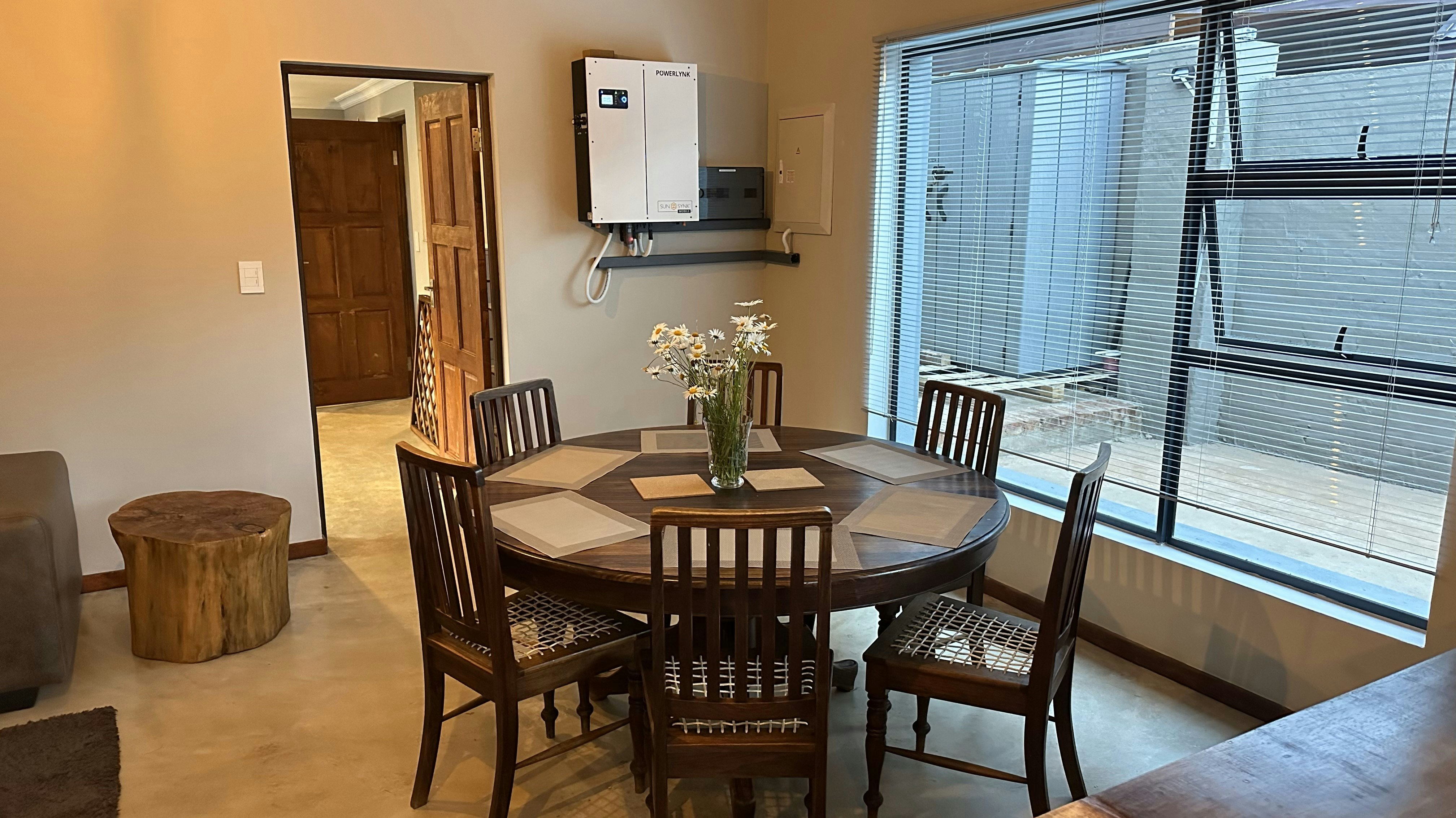The open-plan kitchen is equipped with a fridge, gas hob, oven, washing machine, microwave, kettle, toaster, cutlery and crockery, as well as tea- and coffee-making facilities. There’s an indoor braai area and a work desk. The living room offers comfortable seating and there’s also a dining table with chairs. The house uses solar power and free Wi-Fi is also available.