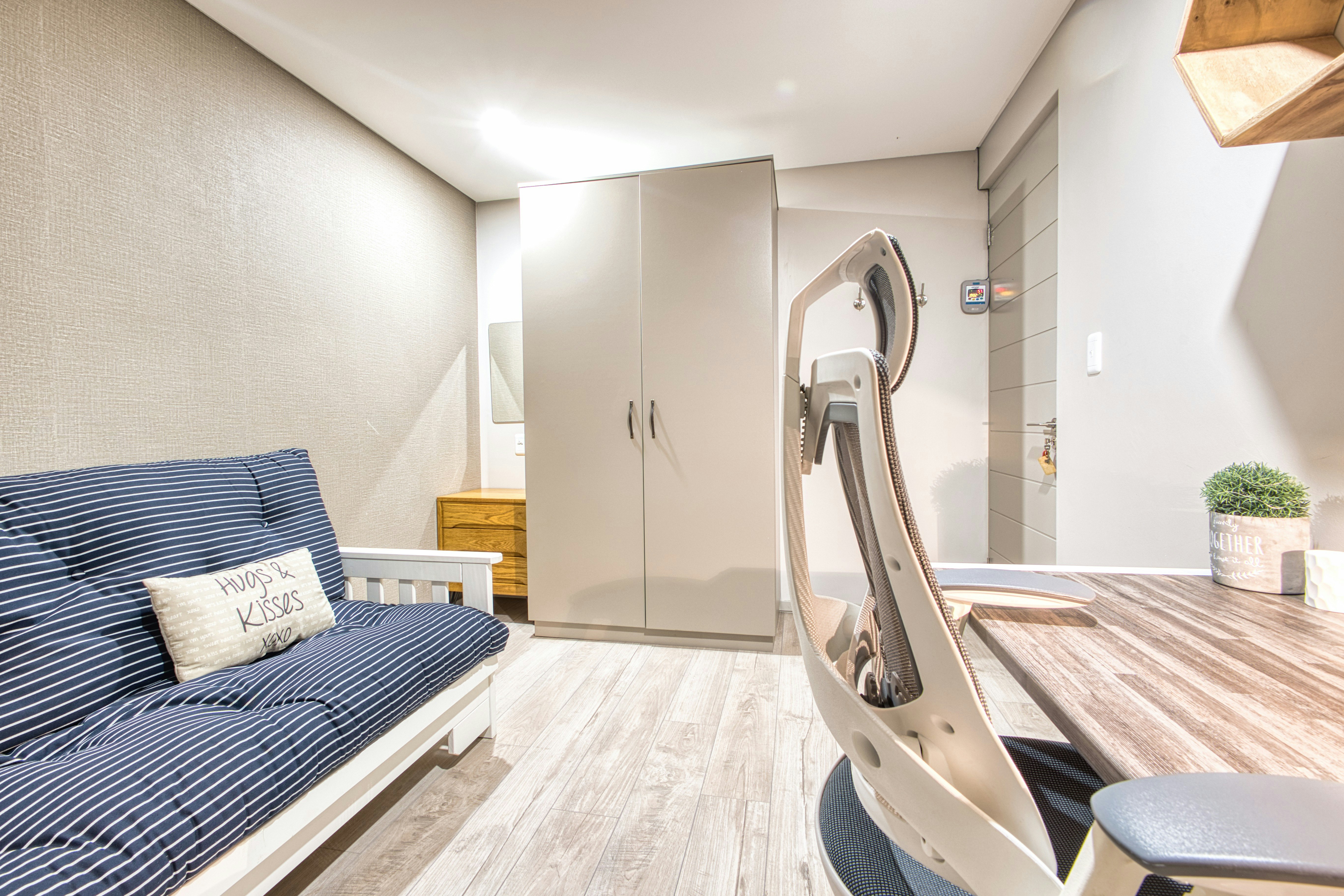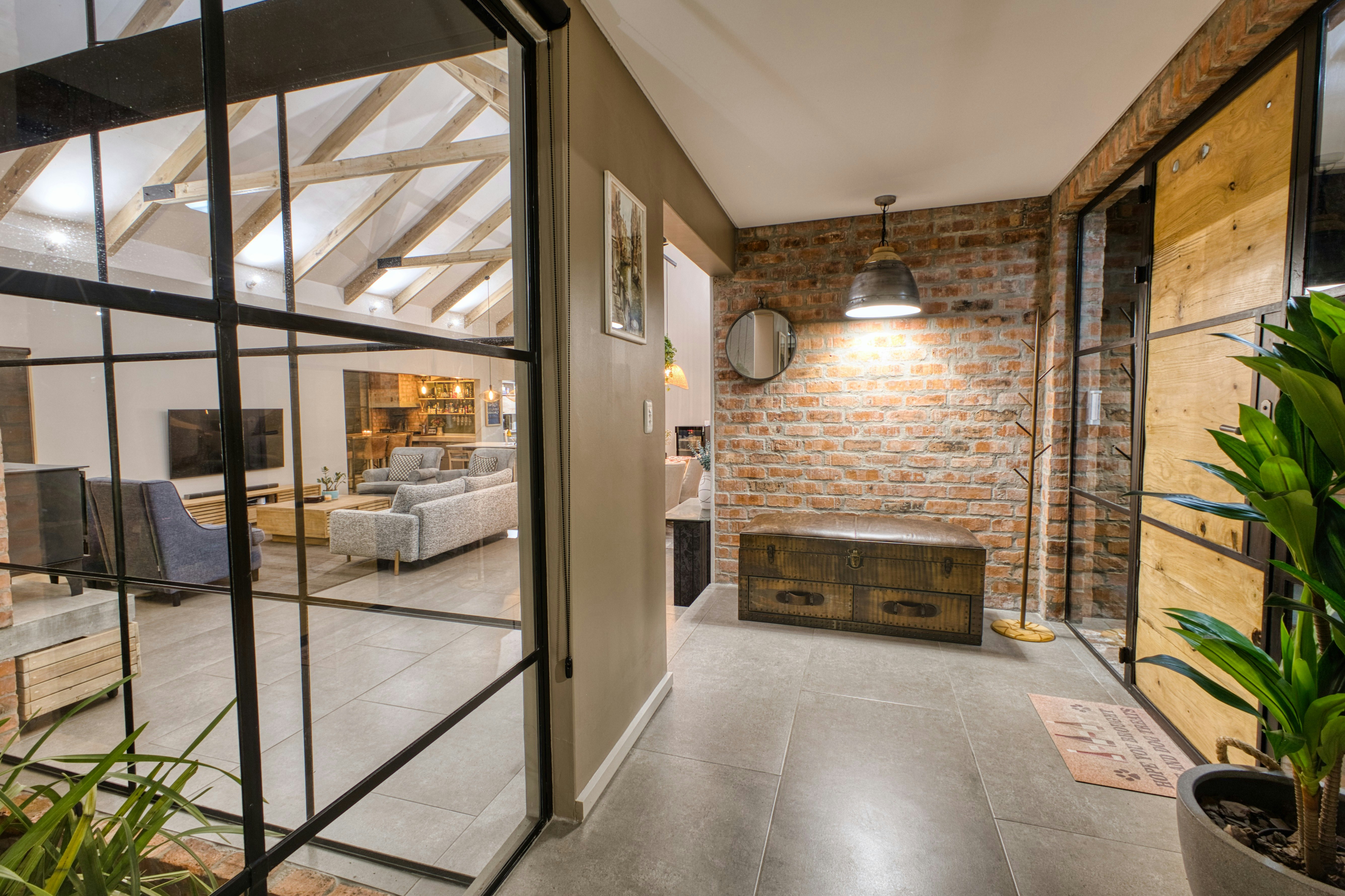 The living area features an open-plan design with a fully equipped kitchen, including a stove, oven, microwave, fridge-freezer, cutlery, and crockery. For added convenience, a dishwasher and washing machine are also available. A 10-seater dining table adjacent to the kitchen is perfect for shared meals. The lounge area is furnished with comfortable seating, a smart TV with YouTube and Netflix, complimentary Wi-Fi, and a fireplace for colder nights. The property is fitted with an inverter system to ensure uninterrupted power during load-shedding.