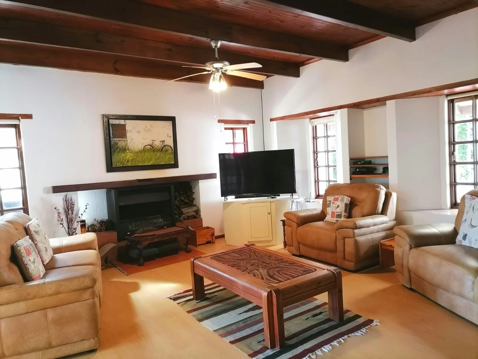 The open-plan living area boasts comfortable seating, a TV with streaming services, a cozy fireplace, and a dining table. The well-equipped kitchen includes a fridge-freezer, stove, oven, microwave, washing machine, dishwasher, tumble dryer, and coffee- and tea-making facilities. The living area opens onto a covered patio, where guests can enjoy built-in braai facilities. Additionally, guests have access to a swimming pool and secure covered parking.