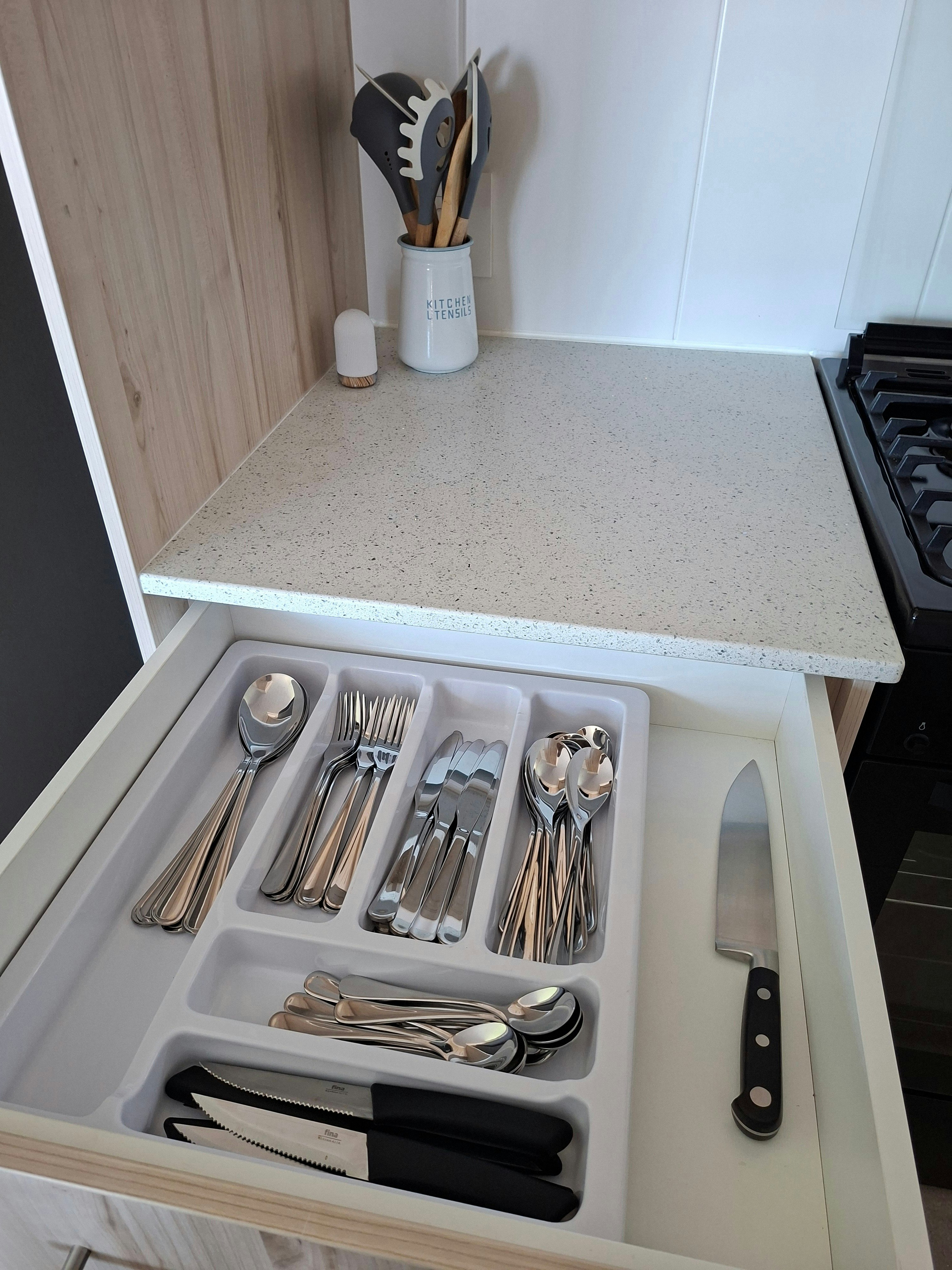 The living area features an open-plan design with a fully equipped kitchen, including a stove, oven, microwave, fridge-freezer, air fryer, crockery, and cutlery. A dining table with 6 chairs in the kitchen is perfect for meals. The lounge area is furnished with comfortable seating and a TV, as well as free Wi-Fi, and includes a fireplace for cooler evenings.