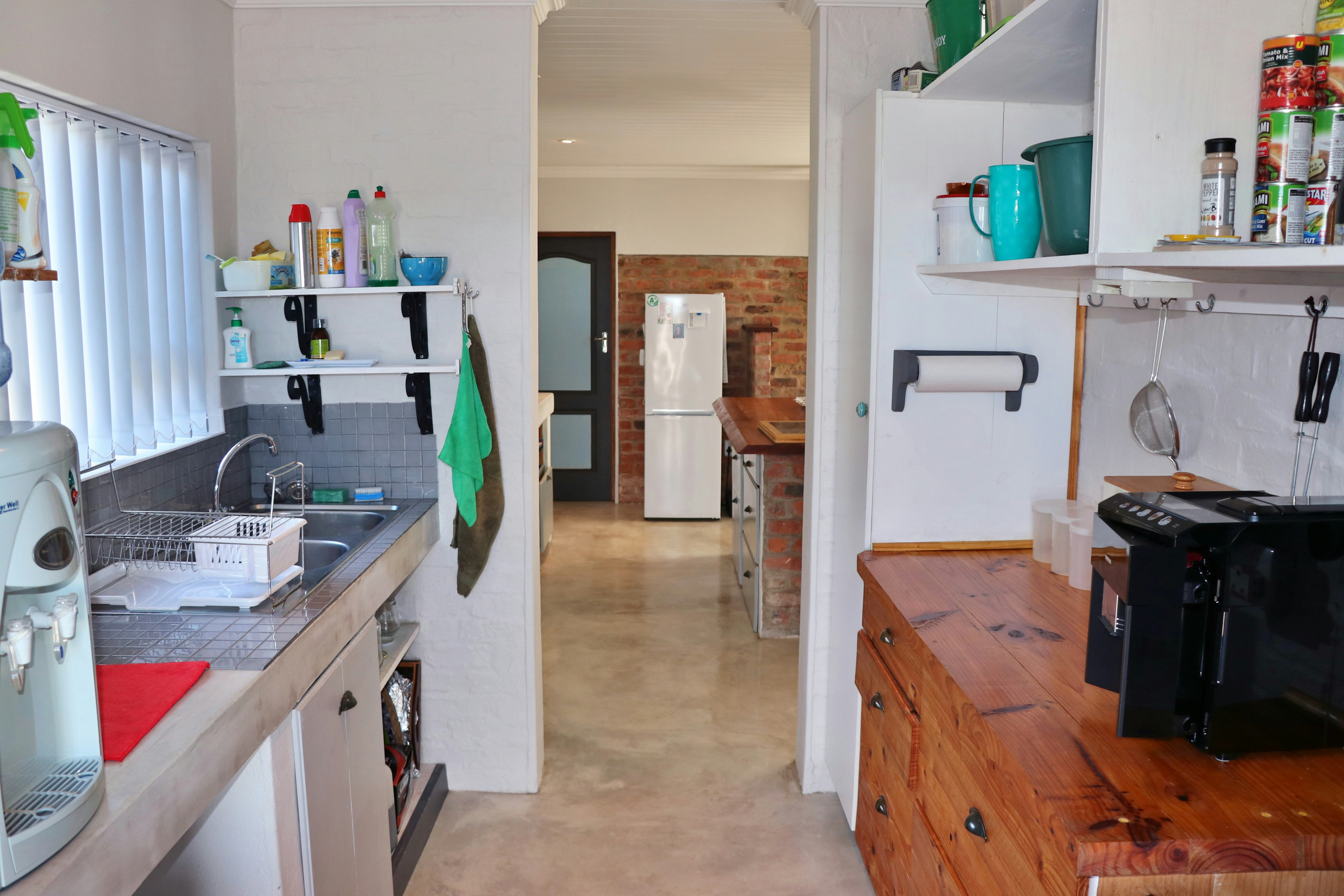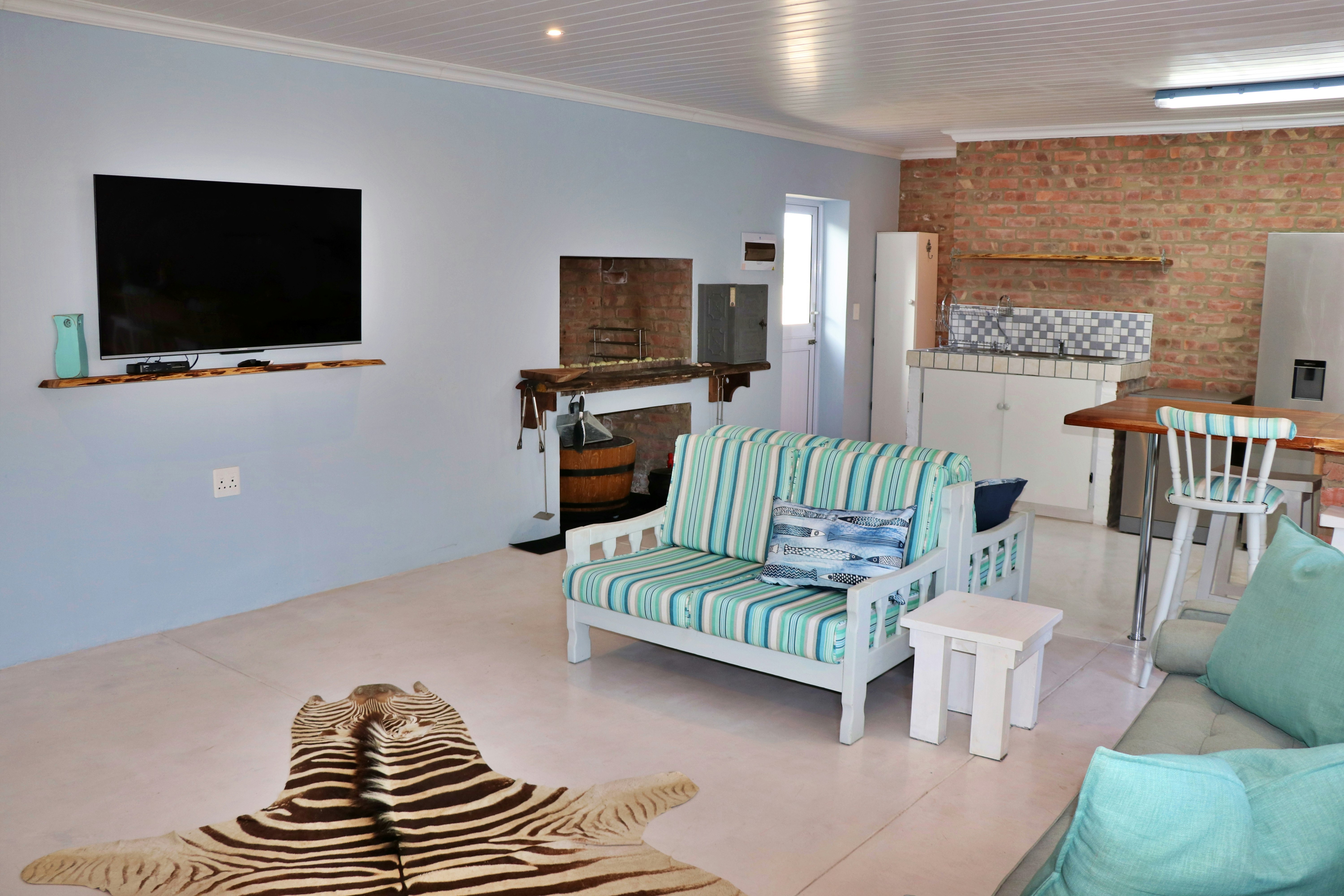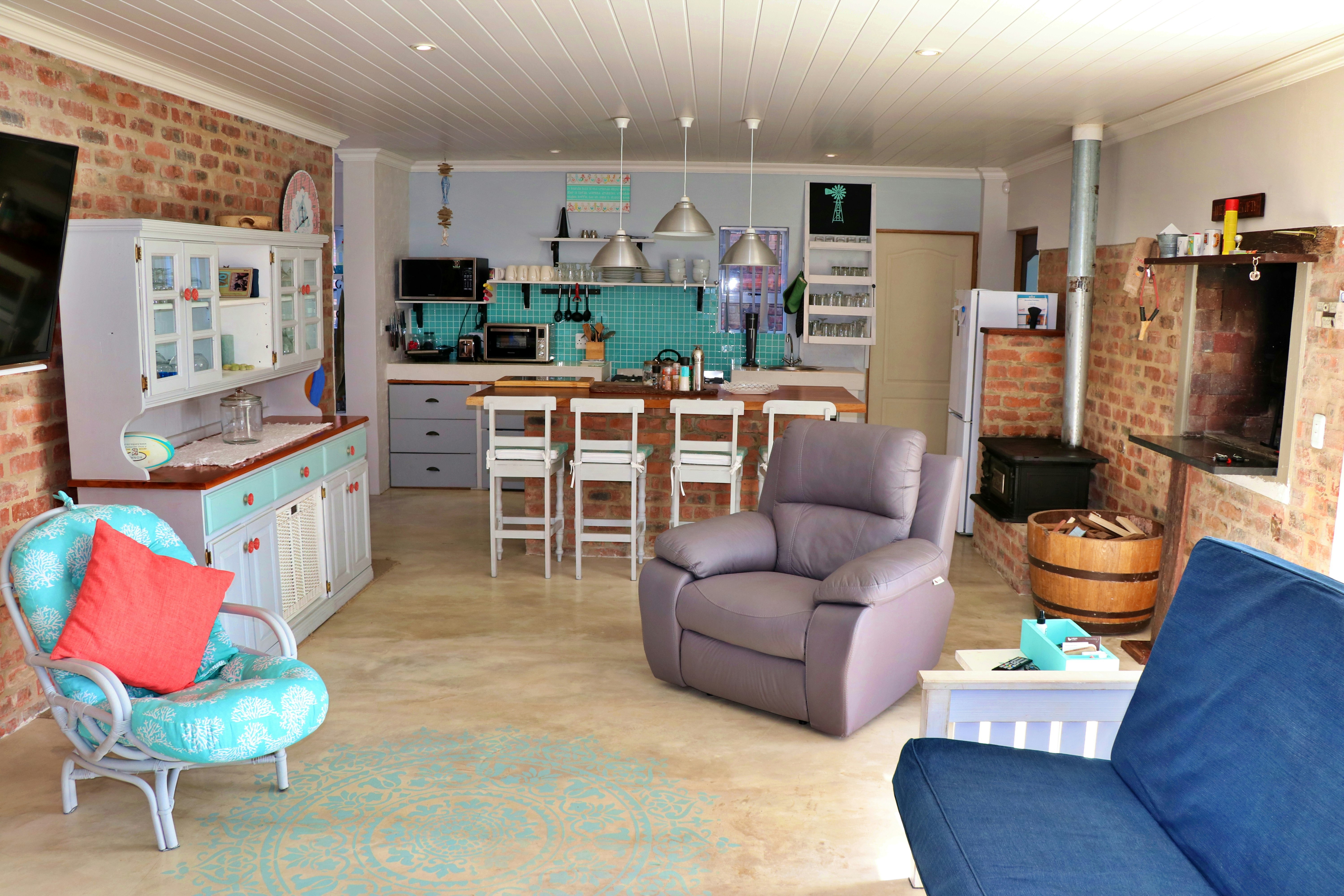 The kitchen in the main house is equipped with a fridge-freezer, gas stove, oven, microwave, toaster, and kettle. Additionally, a dishwasher, chest freezer, and coffee machine are available in the scullery just off the kitchen. The living area boasts an indoor braai area that doubles as a fireplace, comfy seating, and a TV with DStv. It opens onto a sunroom with a second braai area and an outdoor dining table.