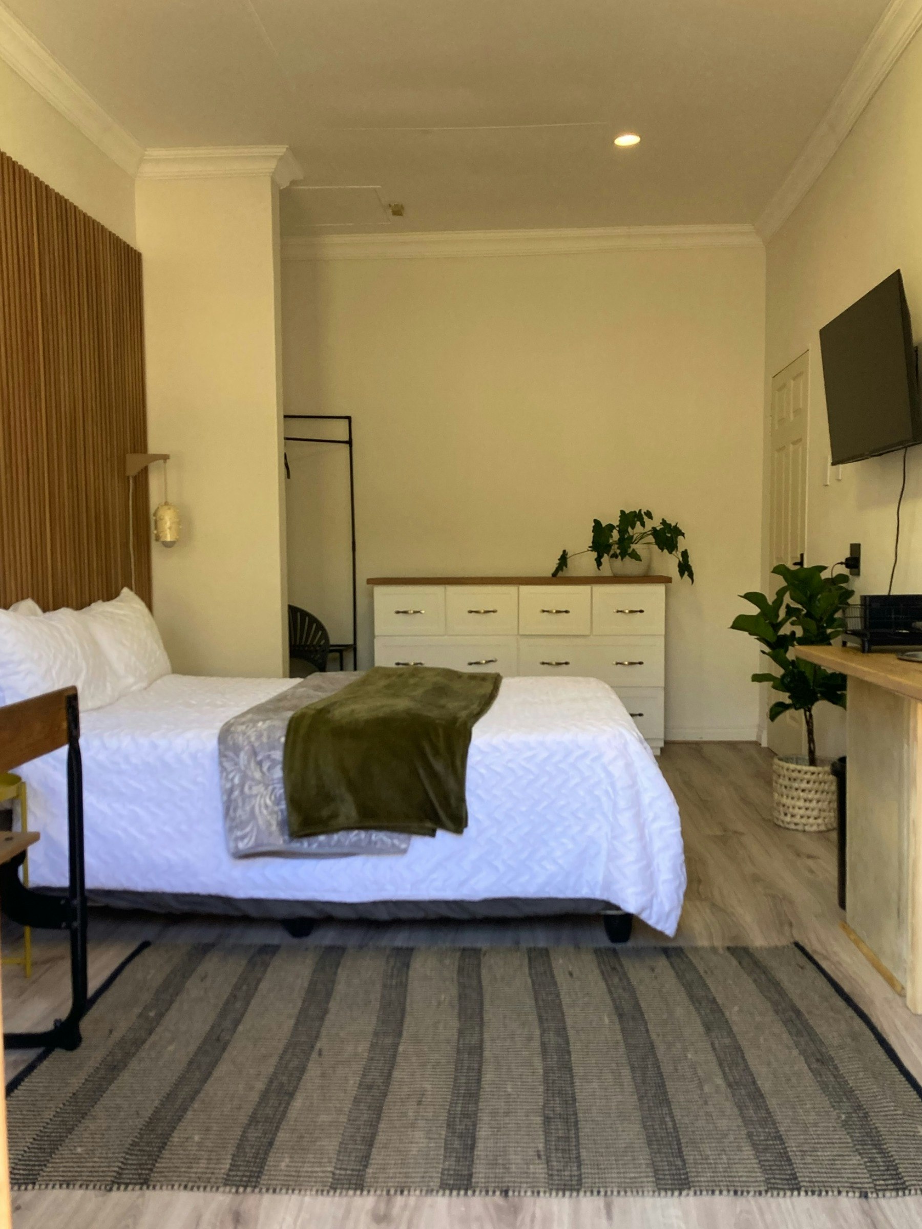 Hierdie kamer is perfek vir 'n kort verblyf. Dit is netjies, gemaklik en gemeubileer met 'n dubbelbed, 'n en suite-badkamer met 'n stort, waaier en gratis WiFi. 'n Koffiestasie met 'n ketel, koffie en tee is beskikbaar vir u gerief.