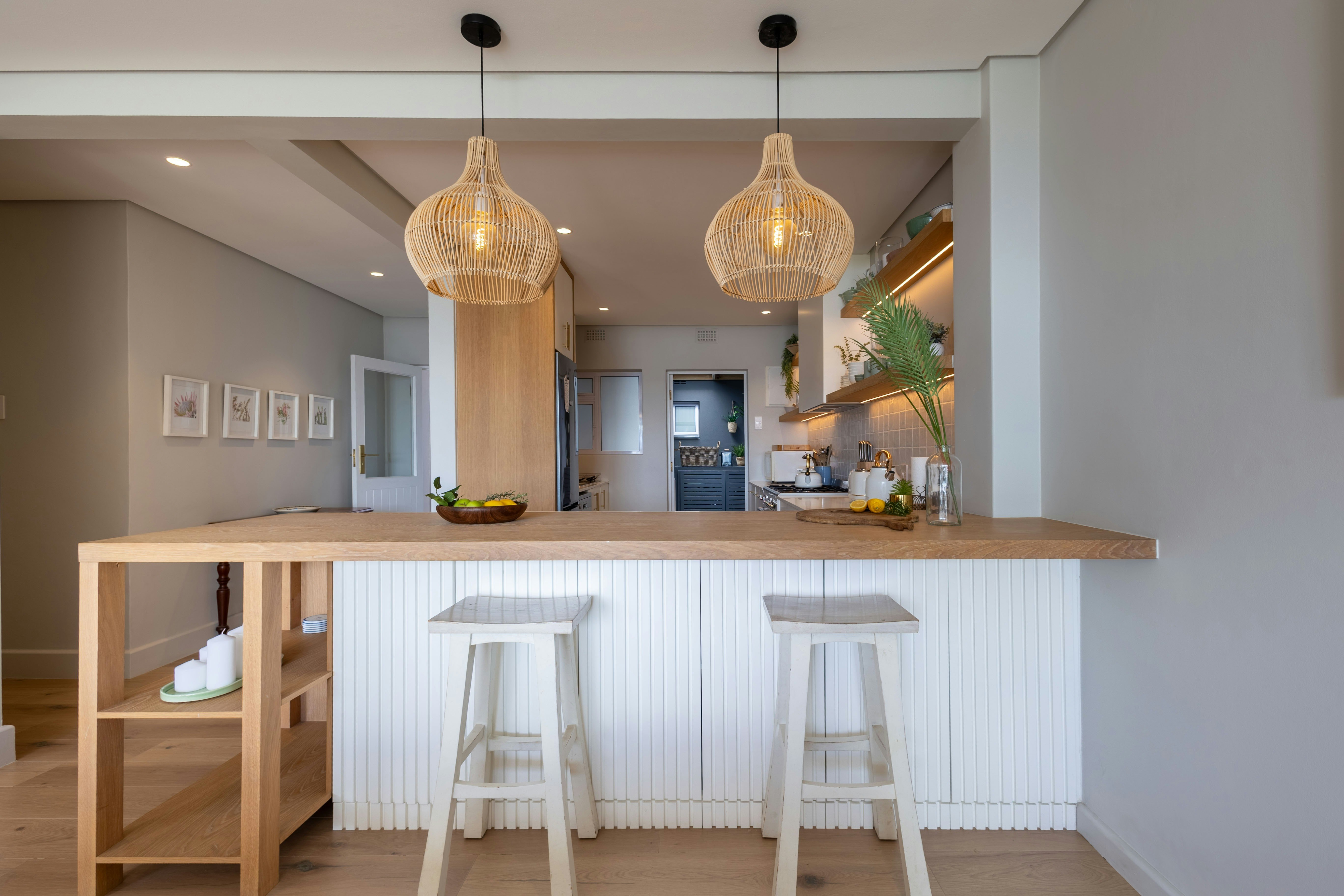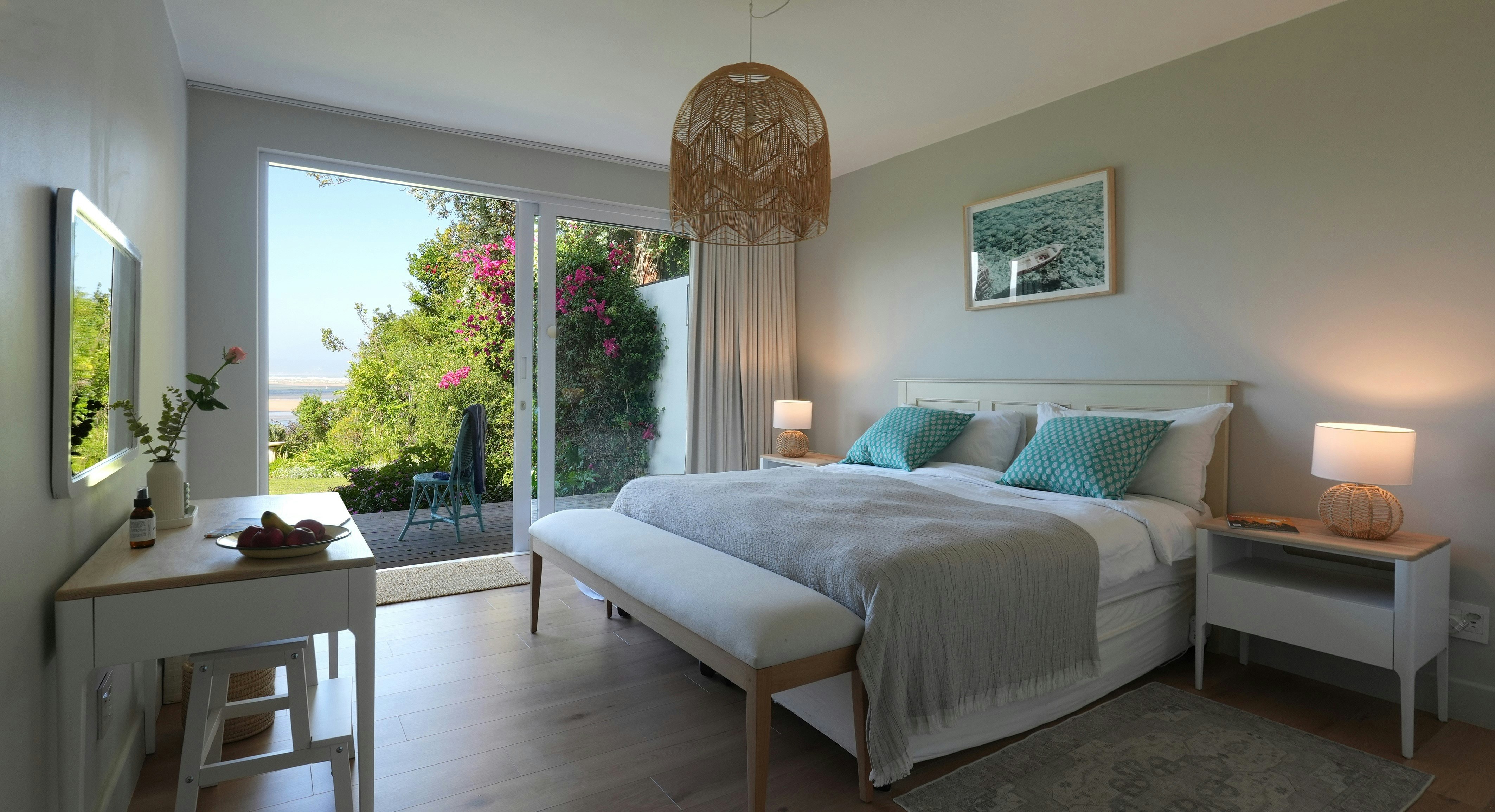 The living spaces have large glass sliding doors that open up to a covered patio and deck, complete with outdoor seating, sun loungers, and portable braai facilities, while taking in the ever-changing colours of the lagoon. The apartment also has access to an outdoor shower, a secure garage, and off-street parking.