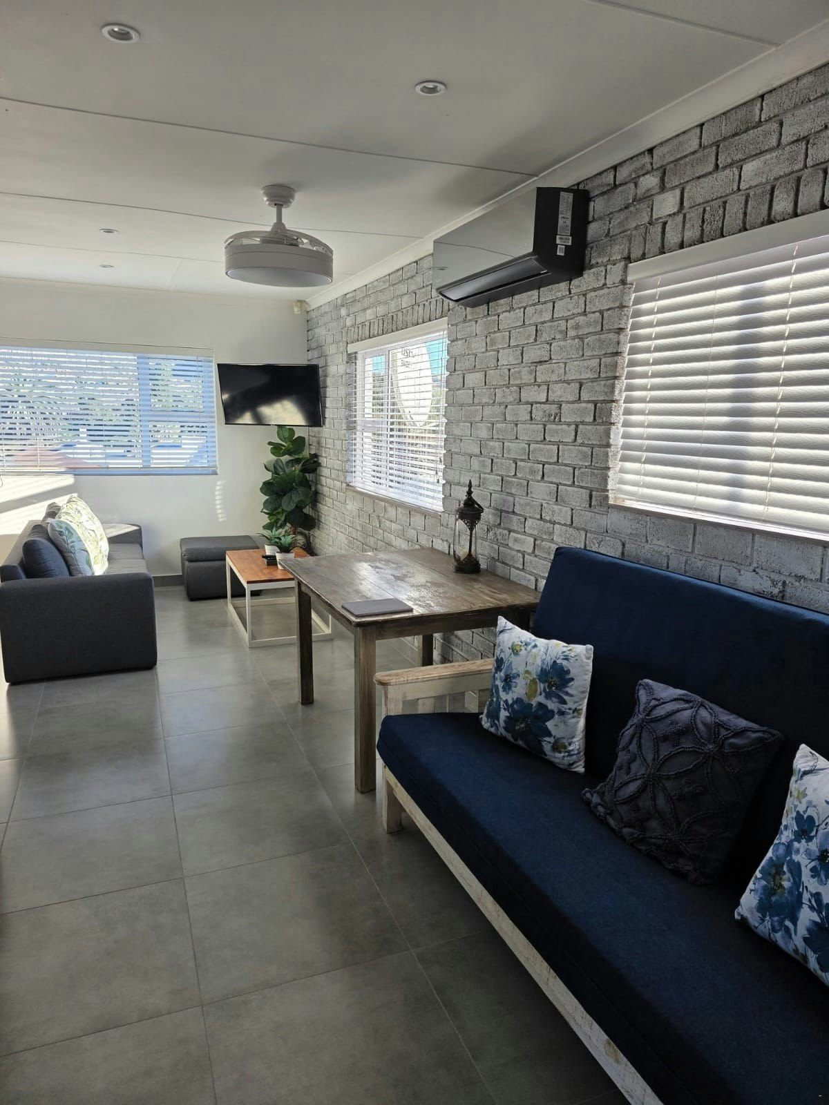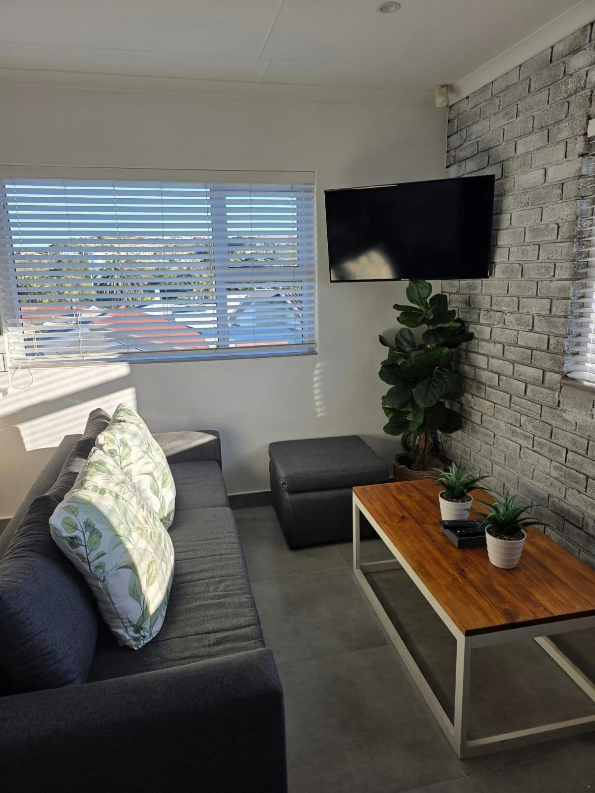 The open-plan living area features a stylish kitchen fully equipped with a gas stove, electric oven, microwave, fridge-freezer, dishwasher, coffee machine, cutlery, and crockery as well as a breakfast bar with stools. Leading from the kitchen is a cosy lounge with air-conditioning with a double child-only sleeper couch and a flat-screen TV with DStv. Access to free Wi-Fi is available. The apartment is equipped with an inverter system.