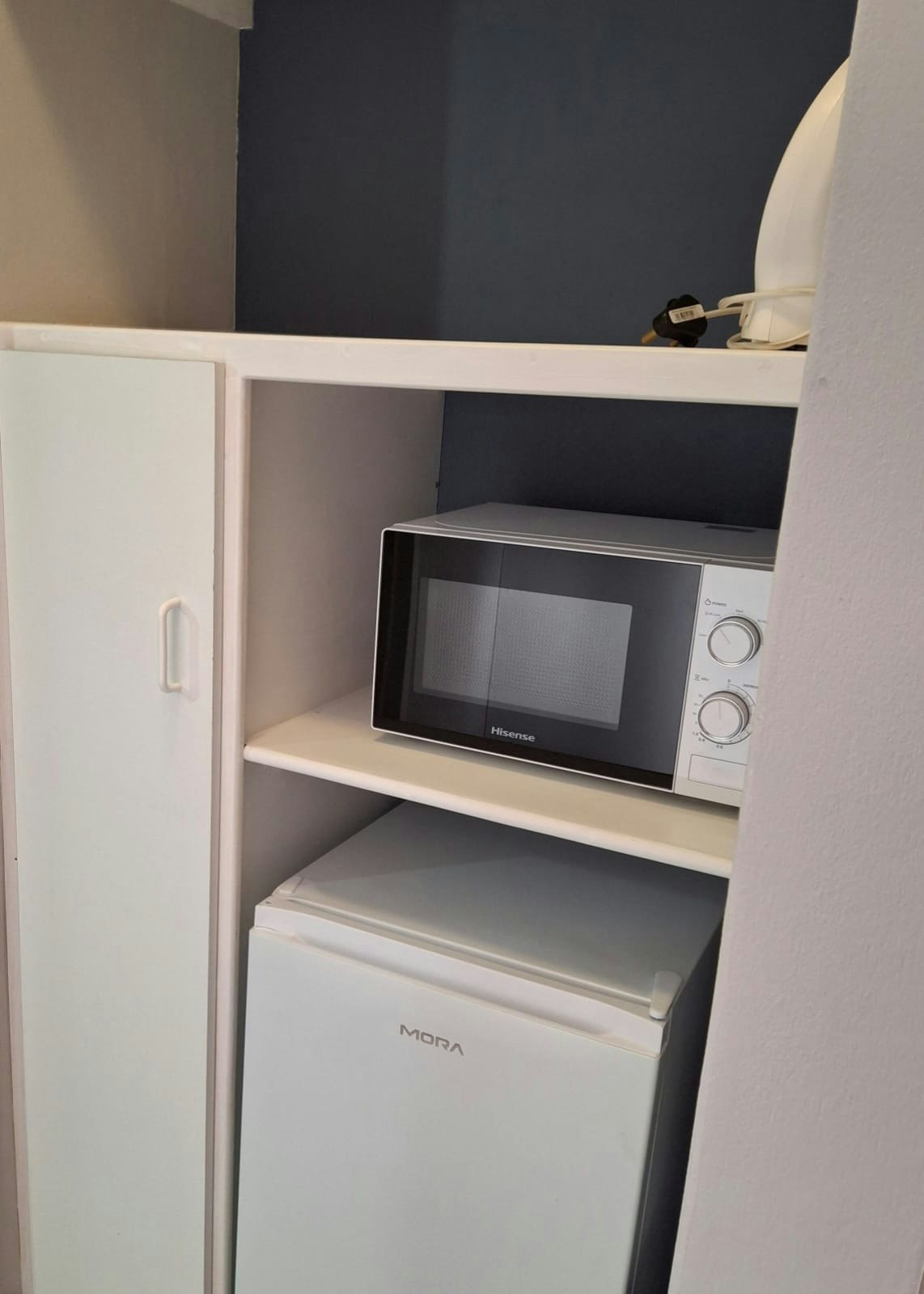 The unit includes a sitting area, a TV with the full bouquet of DStv channels, free Wi-Fi, tea- and coffee-making facilities, and a mini-fridge. Backup power is available during power outages, powering the lights, TV, and Wi-Fi.