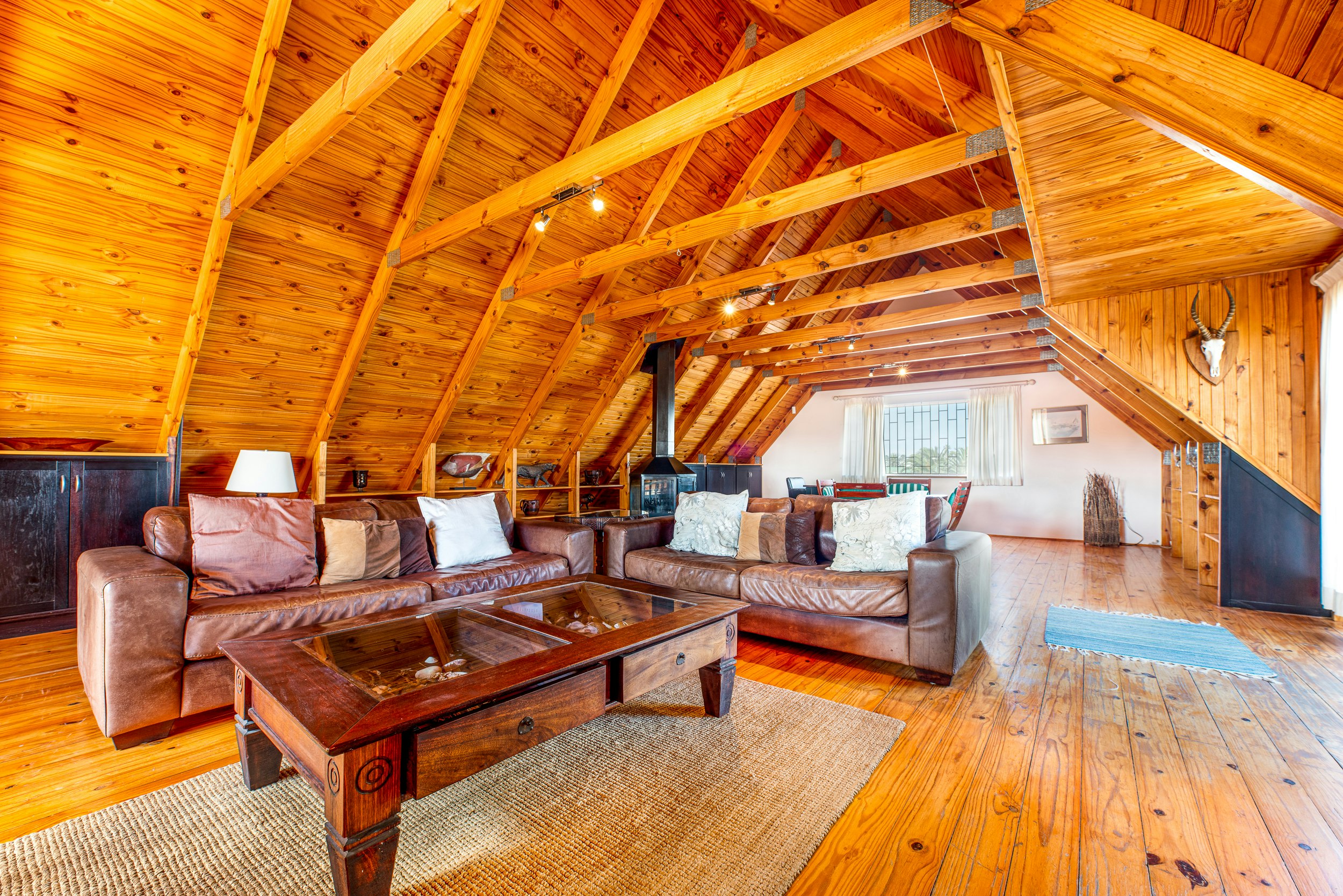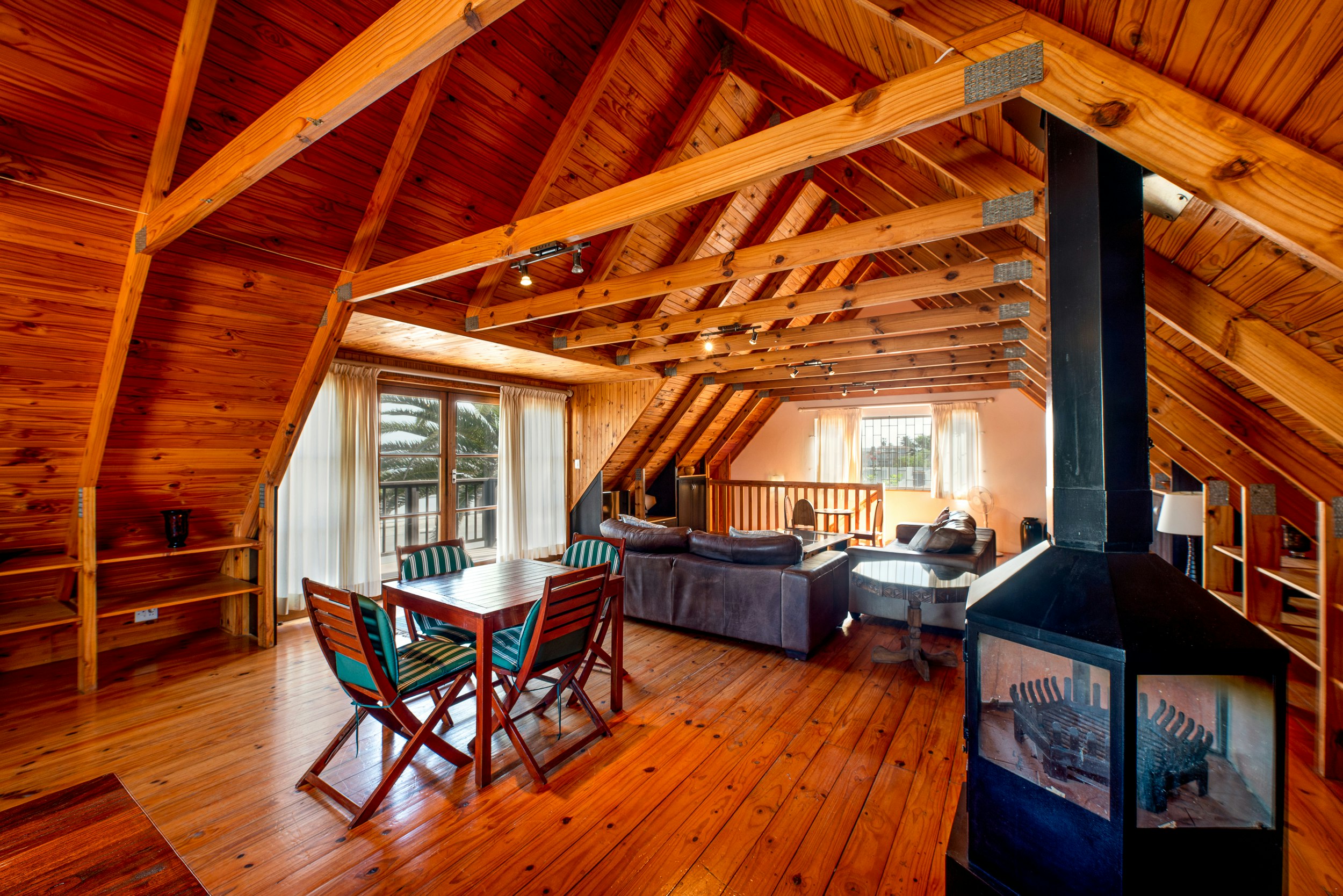 Bo is daar 'n groot leefarea. Die houtwerk gee 'n spesiale warm atmosfeer aan die eiendom en vir die koue aande kan gaste die binnenshuise kaggel gebruik. Vanuit die boonste leefarea is daar 'n beperkte see-uitsig.