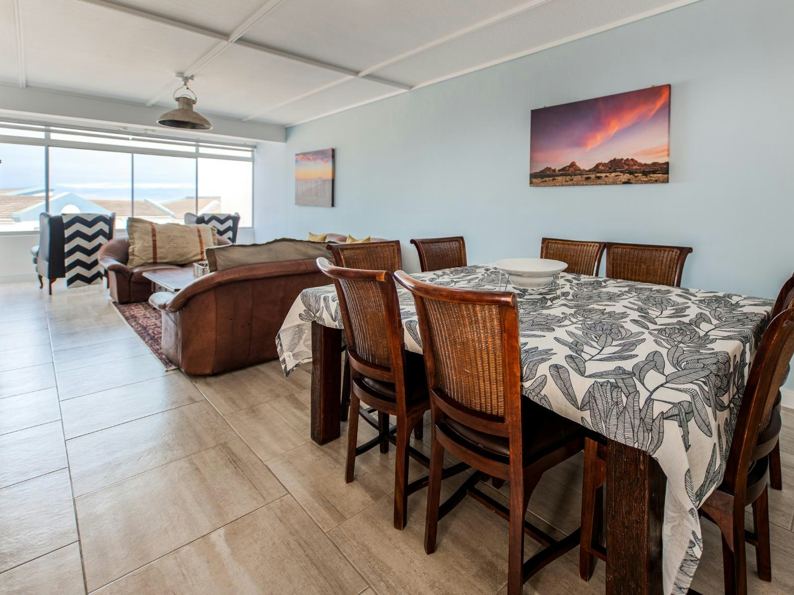 The upstairs living area features a dining table with chairs and a lounge furnished with comfortable couches, an indoor braai, and a TV. The kitchen is fully equipped with a double-door fridge-freezer, stove, oven, microwave, and dishwasher.
