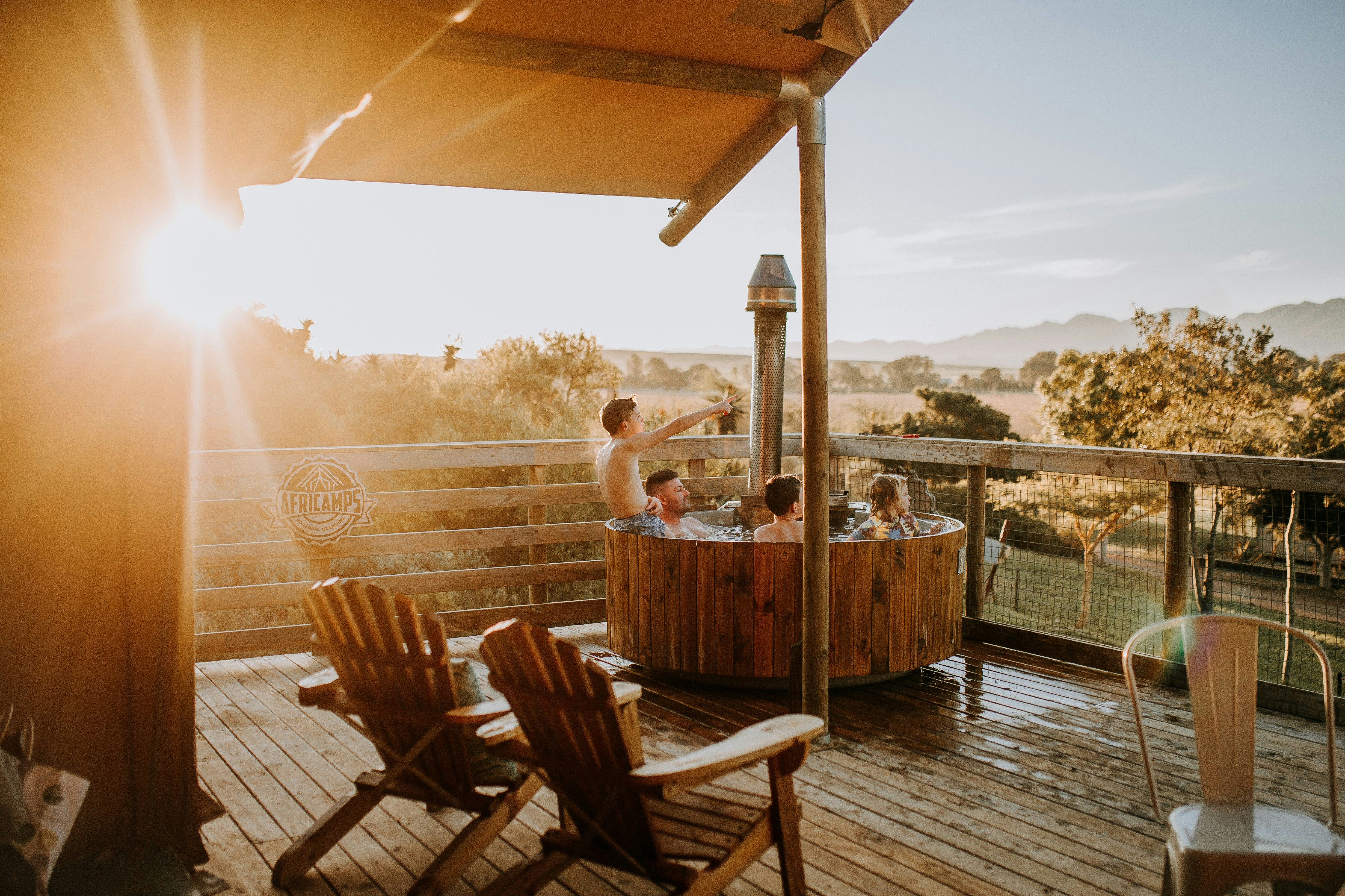 The open-plan living space features a kitchenette equipped with a gas stove, bar fridge, cutlery and crockery, as well as tea- and coffee-making facilities. Additionally, there is a dining table and a cosy lounge with comfy seating and a fireplace. The tent opens up onto a covered patio with outdoor seating, braai facilities as well as a wood-burning hot tub.
