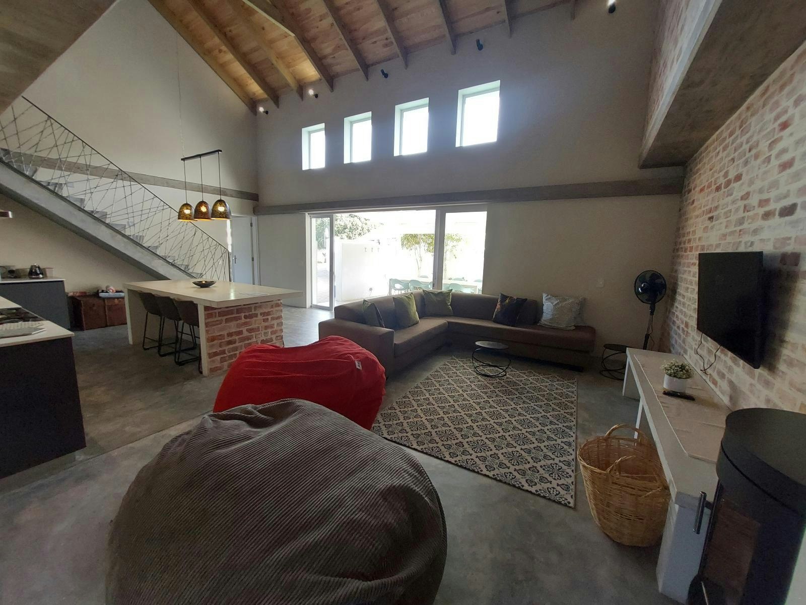 The open-plan living area features a kitchen fully equipped with a gas stove, electric oven, microwave, fridge-freezer, cutlery and crockery as well as a central island with stools. Leading from the kitchen is a cosy lounge with comfy seating, a fireplace and a flat-screen TV.