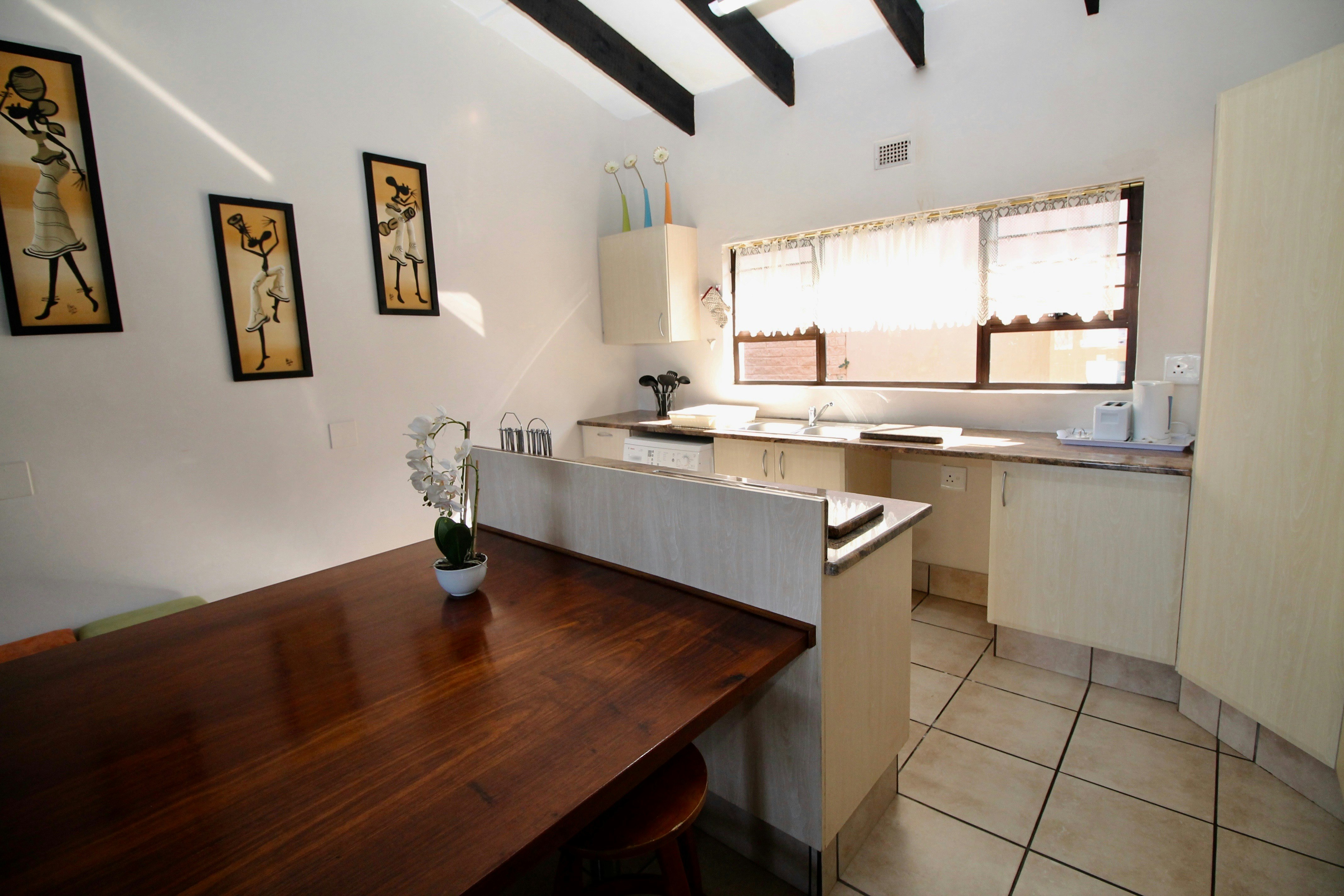 The well-equipped kitchen contains a fridge, an oven with a stove a microwave and washing machine. The living area has a TV with OpenView and a DStv connection point. Please remember to bring your own smart card, cables and decoder if you want to watch DStv. The lounge leads out to the verandah, which features a built-in braai area.