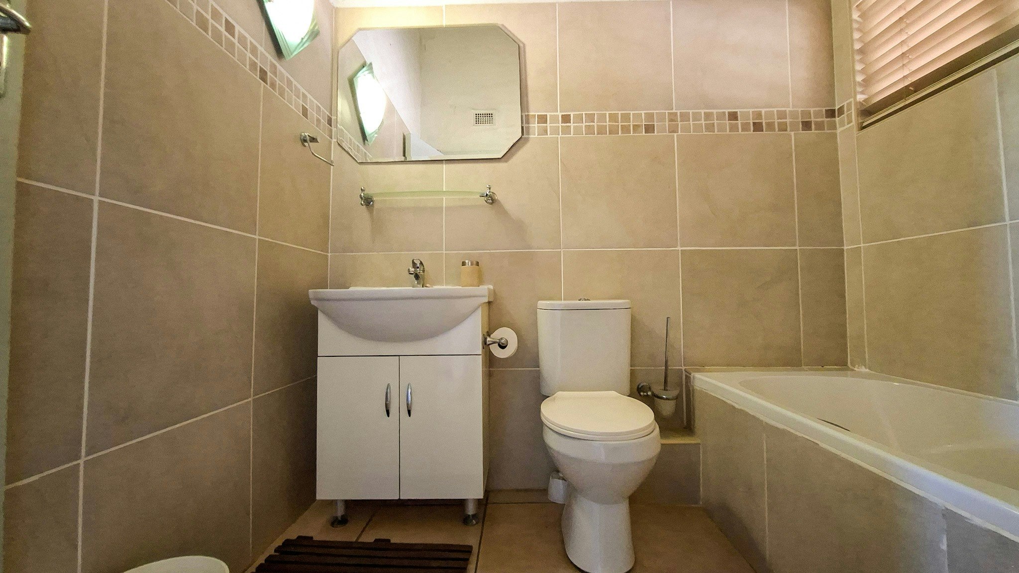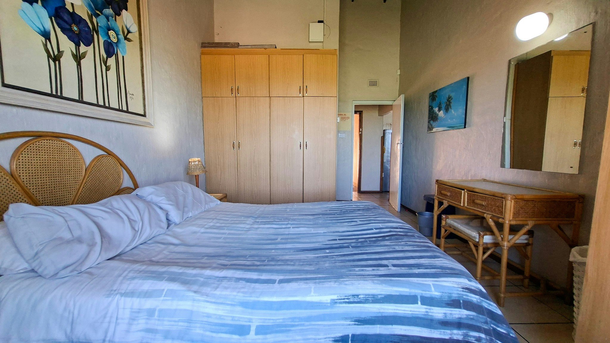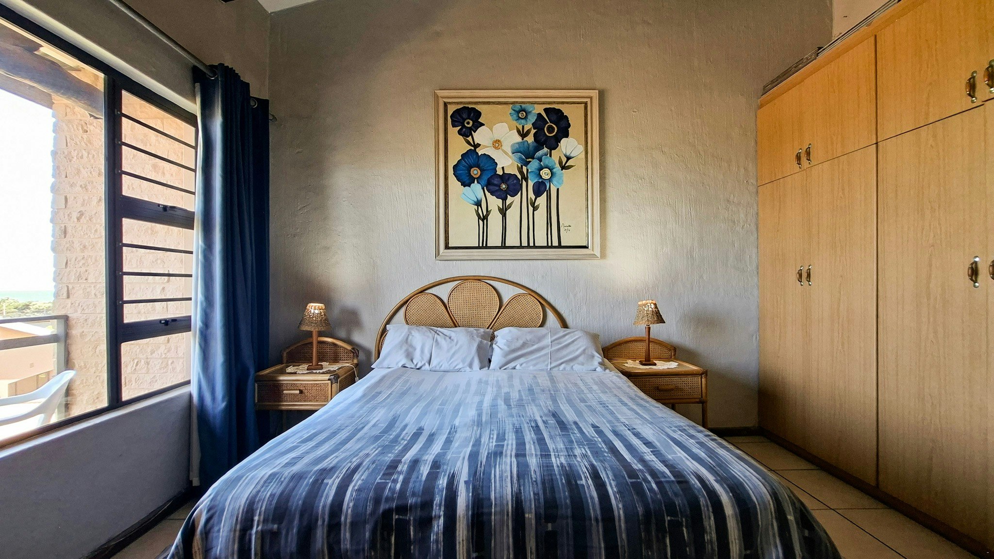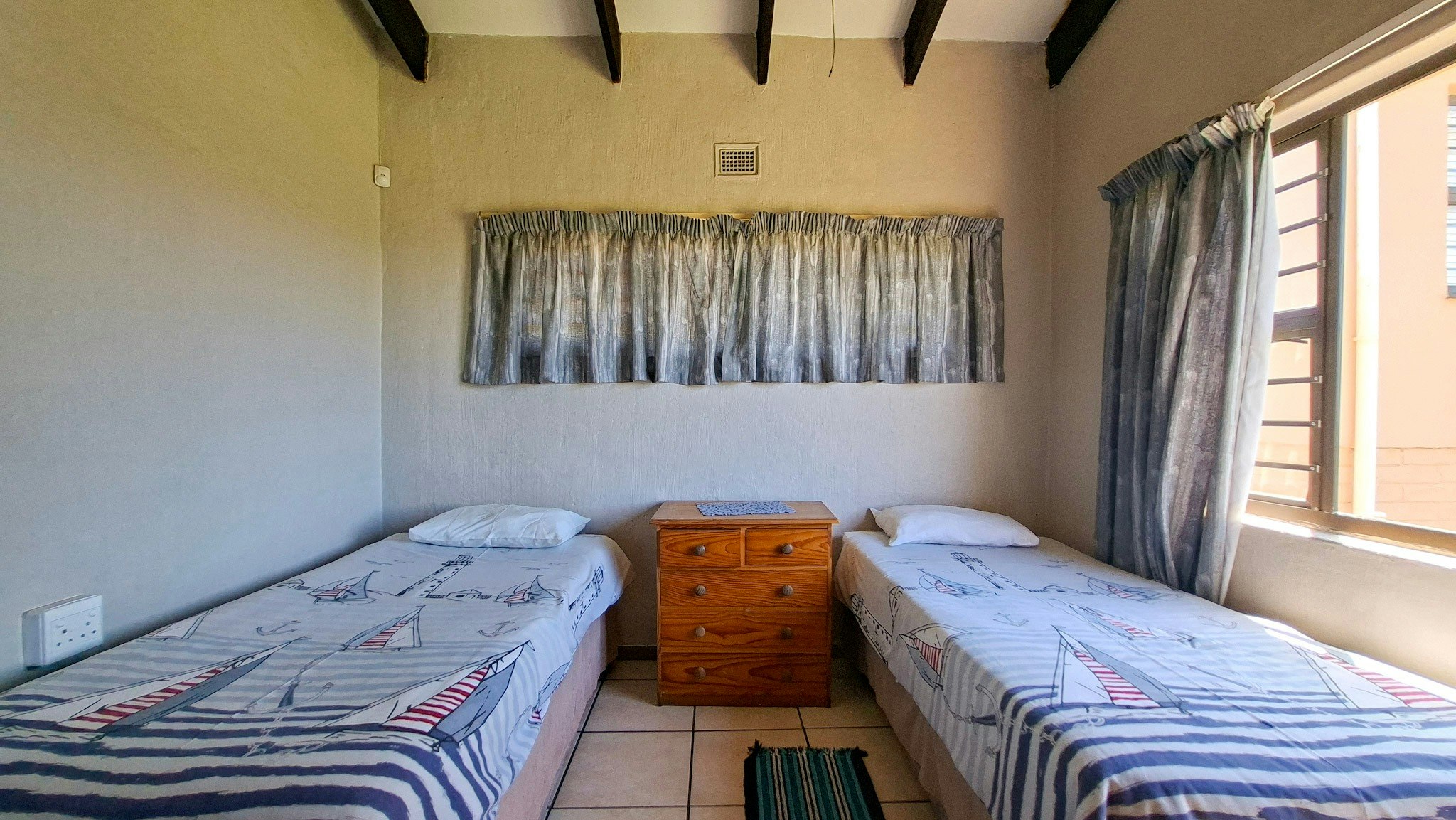 Die woonstel bied slaapplek aan 6 gaste en het 3 slaapkamers, 2 badkamers en 'n oopplan-kombuis en -leefarea. Die eerste slaapkamer het 'n dubbelbed en 'n en suite-stort. Die tweede slaapkamer het ook 'n dubbelbed en die derde het 2 enkelbeddens. Die tweede badkamer het 'n bad, toilet en wasbak. Gaste moet hulle eie handdoeke saambring.