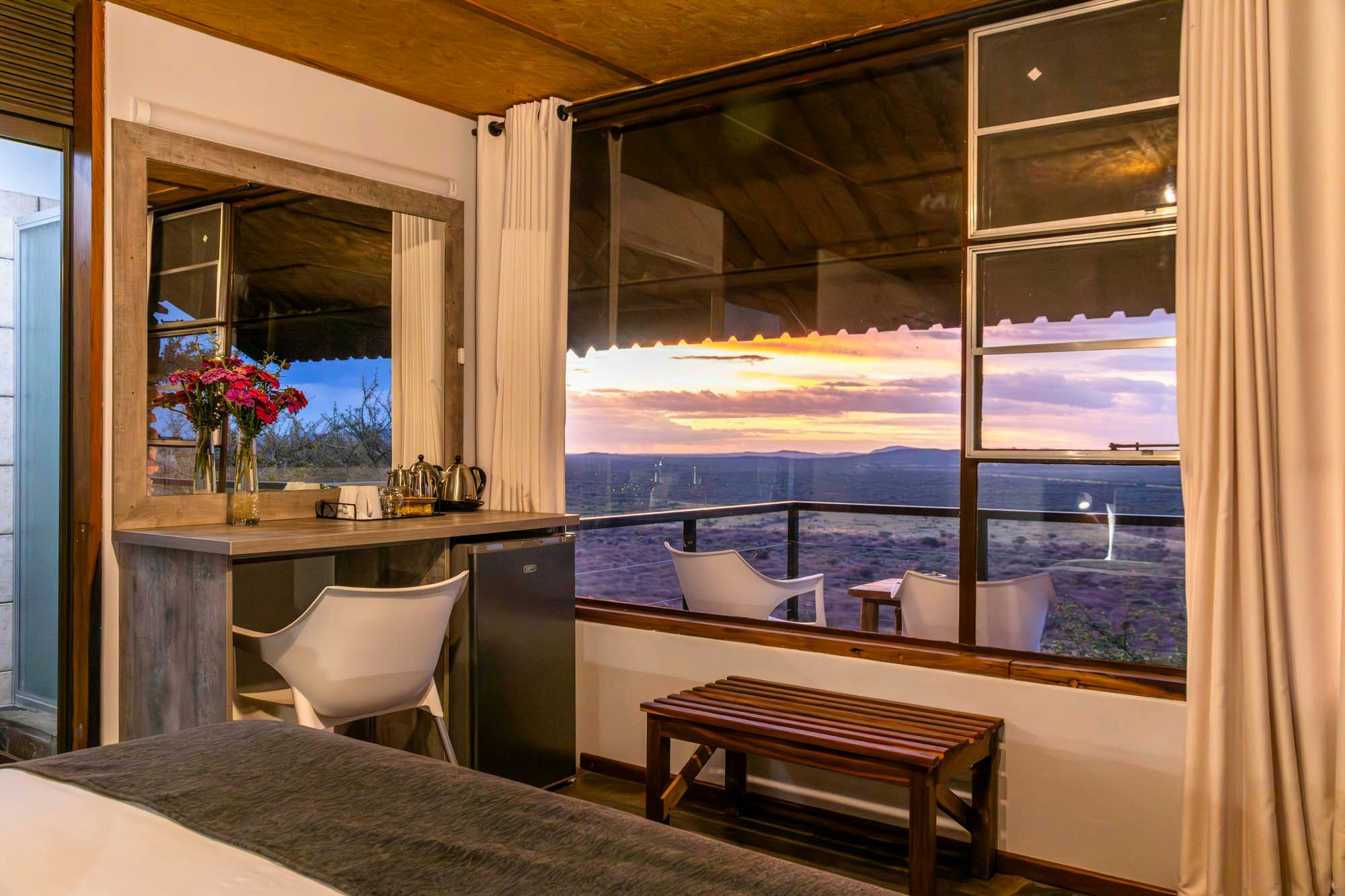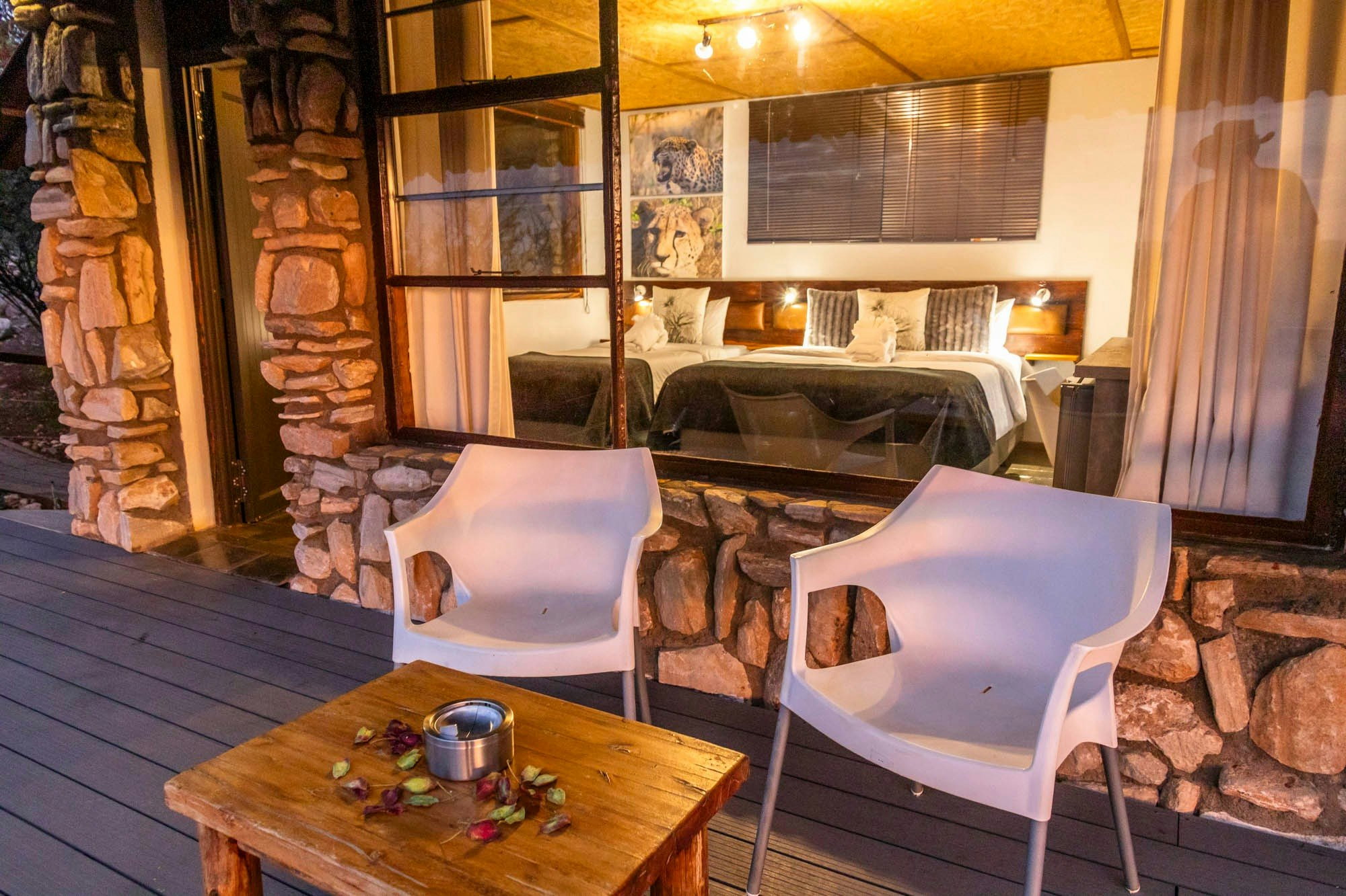 Each Standard Room is furnished with 1 queen-size bed and 1 extra-length single bed and includes a bathroom with a shower, basin, and toilet. Each room offers Wi-Fi access and a private balcony—perfect for enjoying a morning coffee and rusk. The coffee station includes a kettle, plunger, and beverages, along with a small fridge. Standard Rooms overlook the open landscape and the cheetah camp.