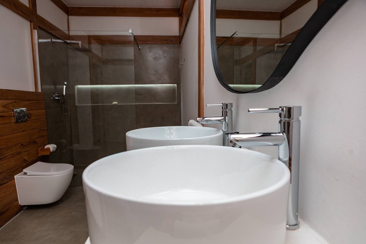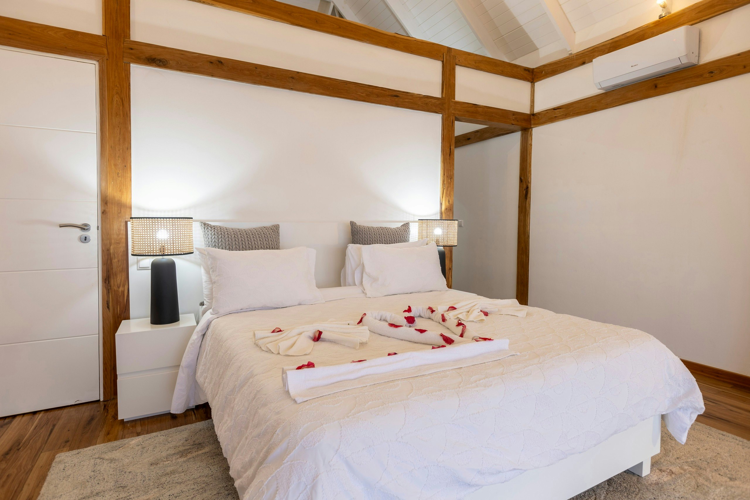 The property offers 4 air-conditioned bedrooms, each with an en-suite bathroom. Bedroom 1 is furnished with a double bed, Bedroom 2 has two single beds that can be converted into a king, and Bedrooms 3 and 4 are furnished with double beds.