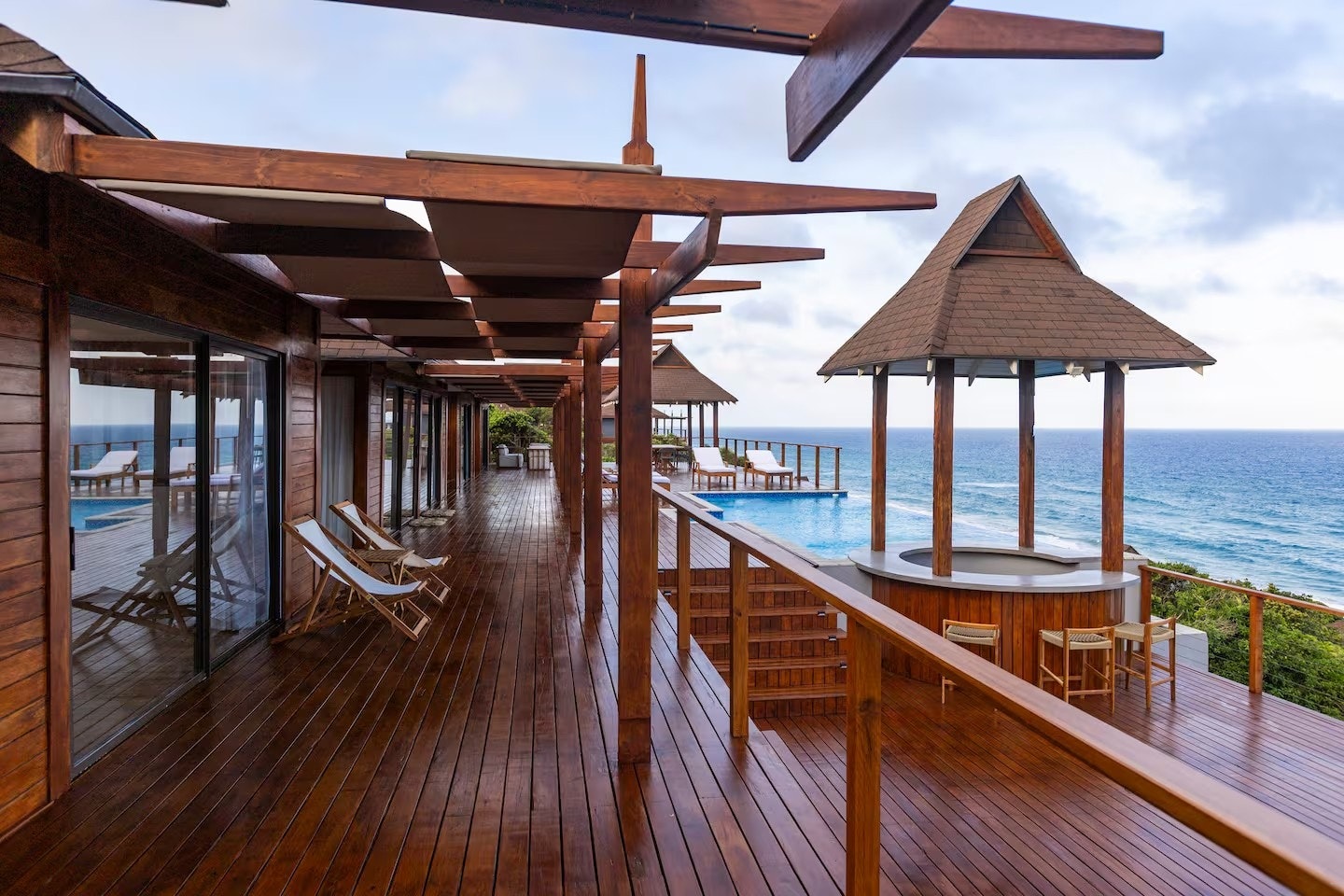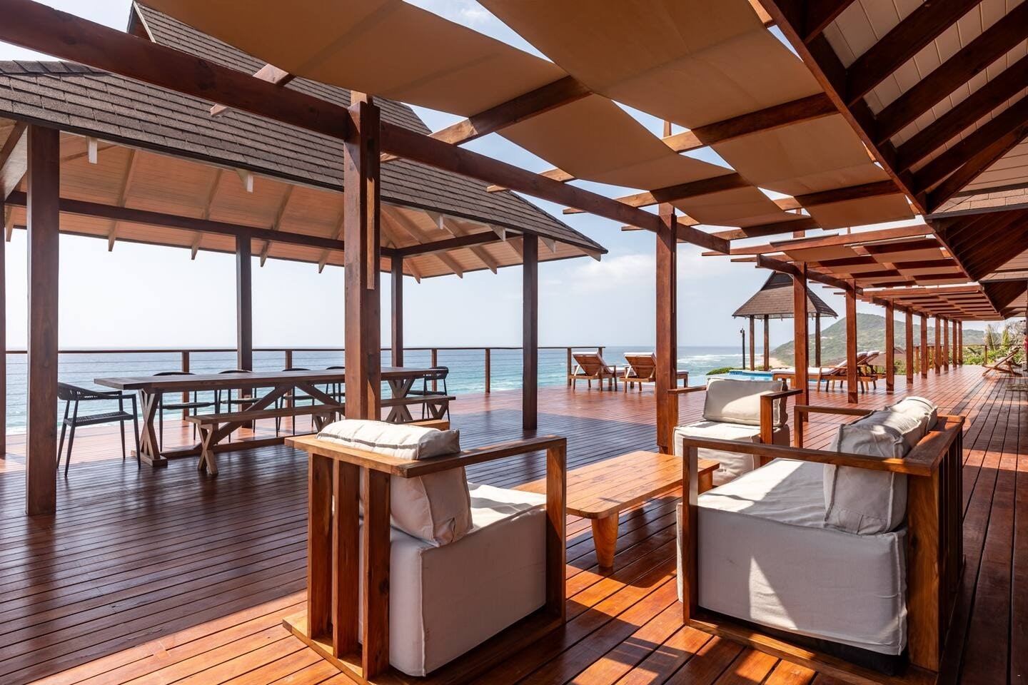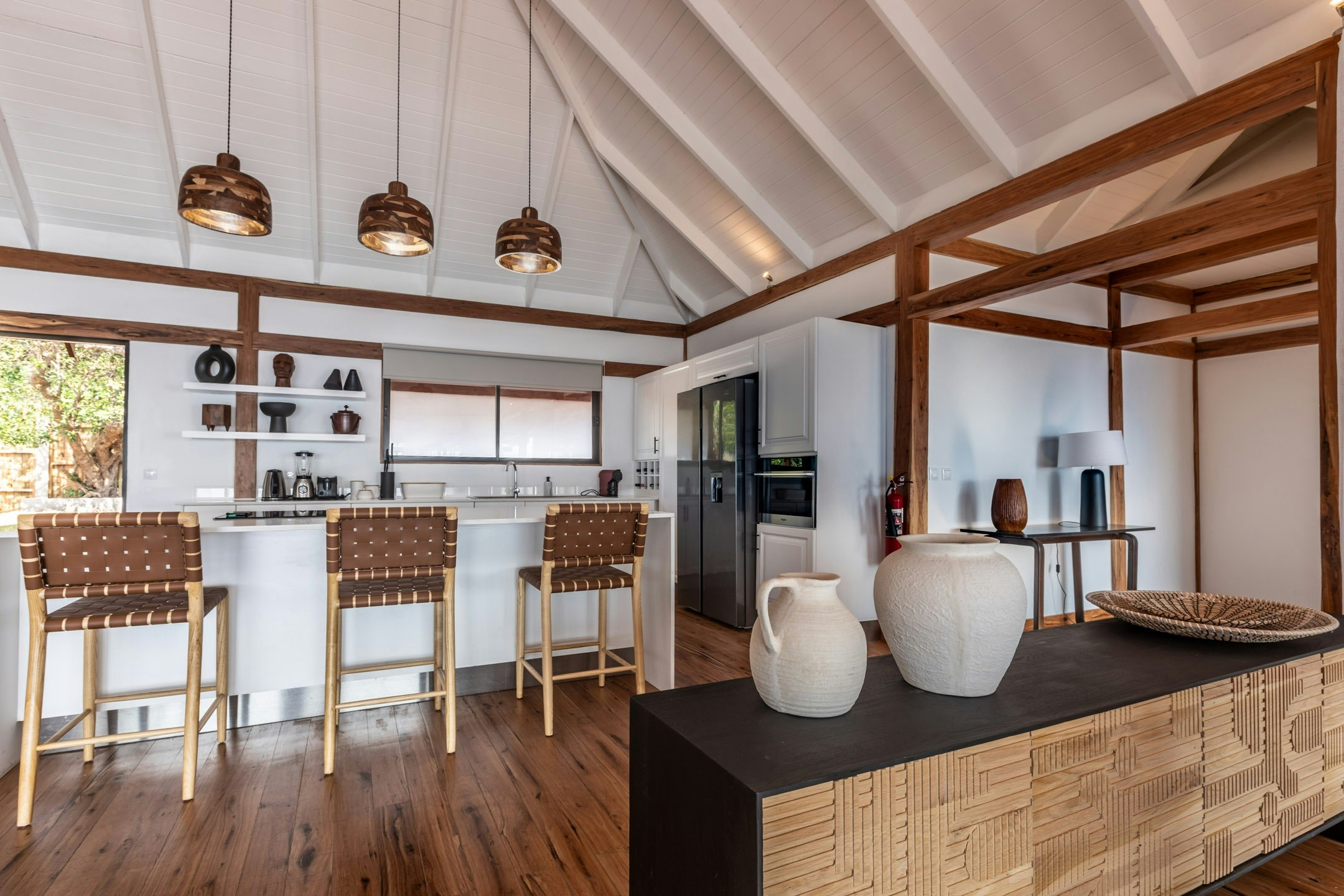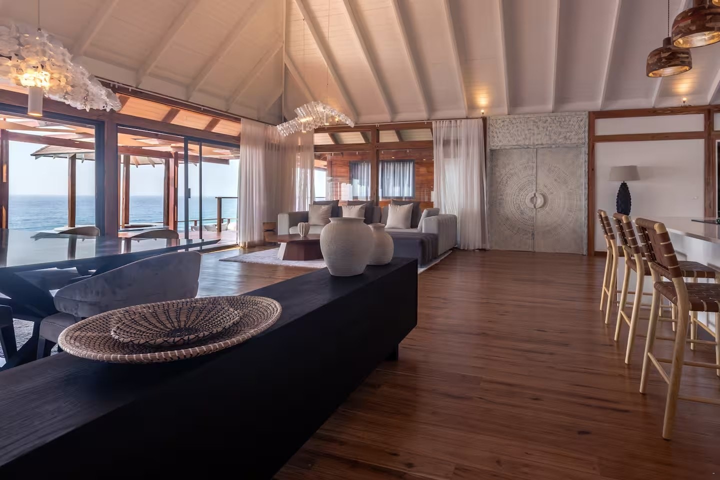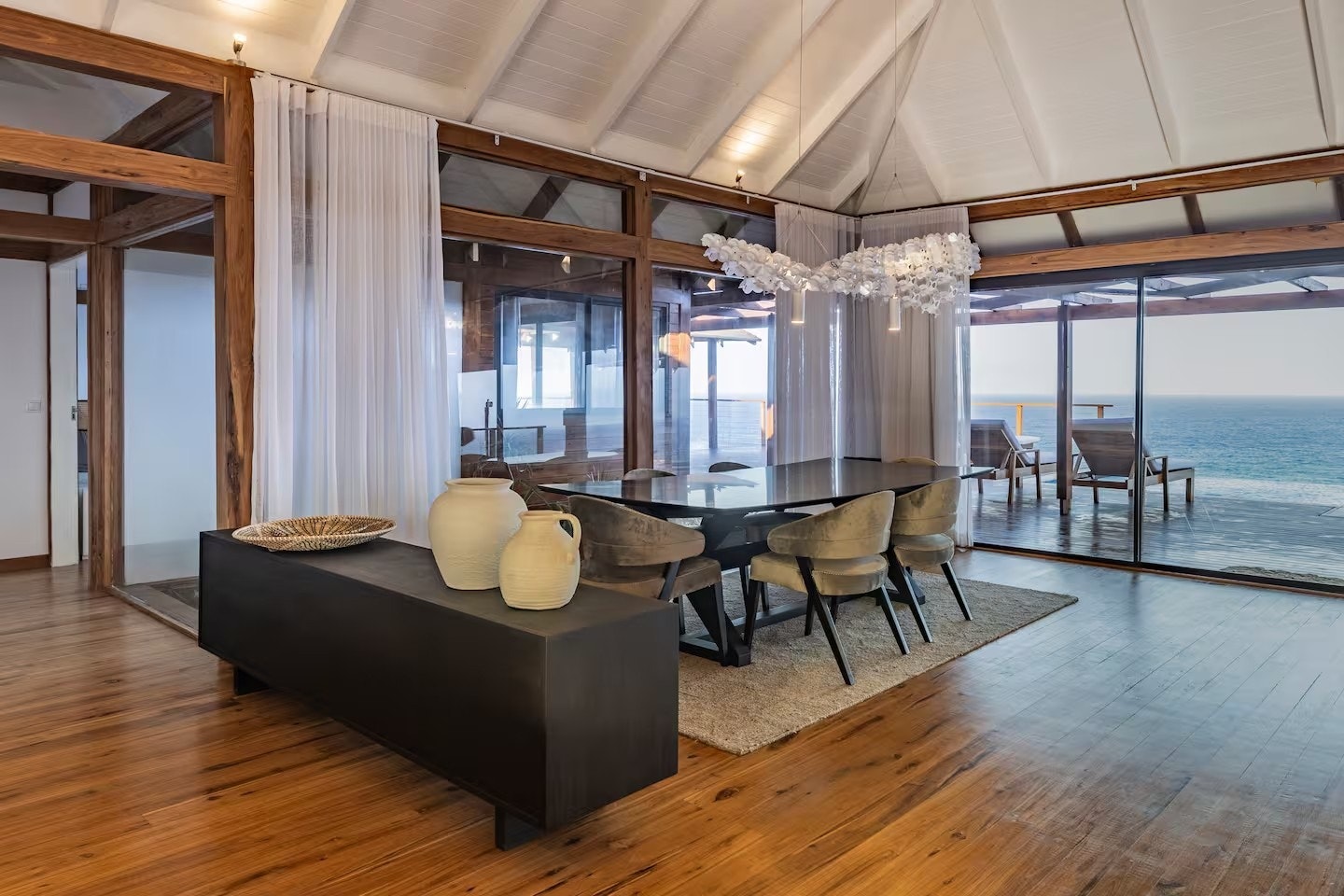 The villa features an open-plan living area with a fully equipped kitchen, dining space, and lounge. A second kitchen provides additional convenience for larger groups. Glass doors and wide windows allow natural light and sea breezes to flow through the home, with panoramic views of the ocean. A wide terrace with a private pool overlooks the sea.