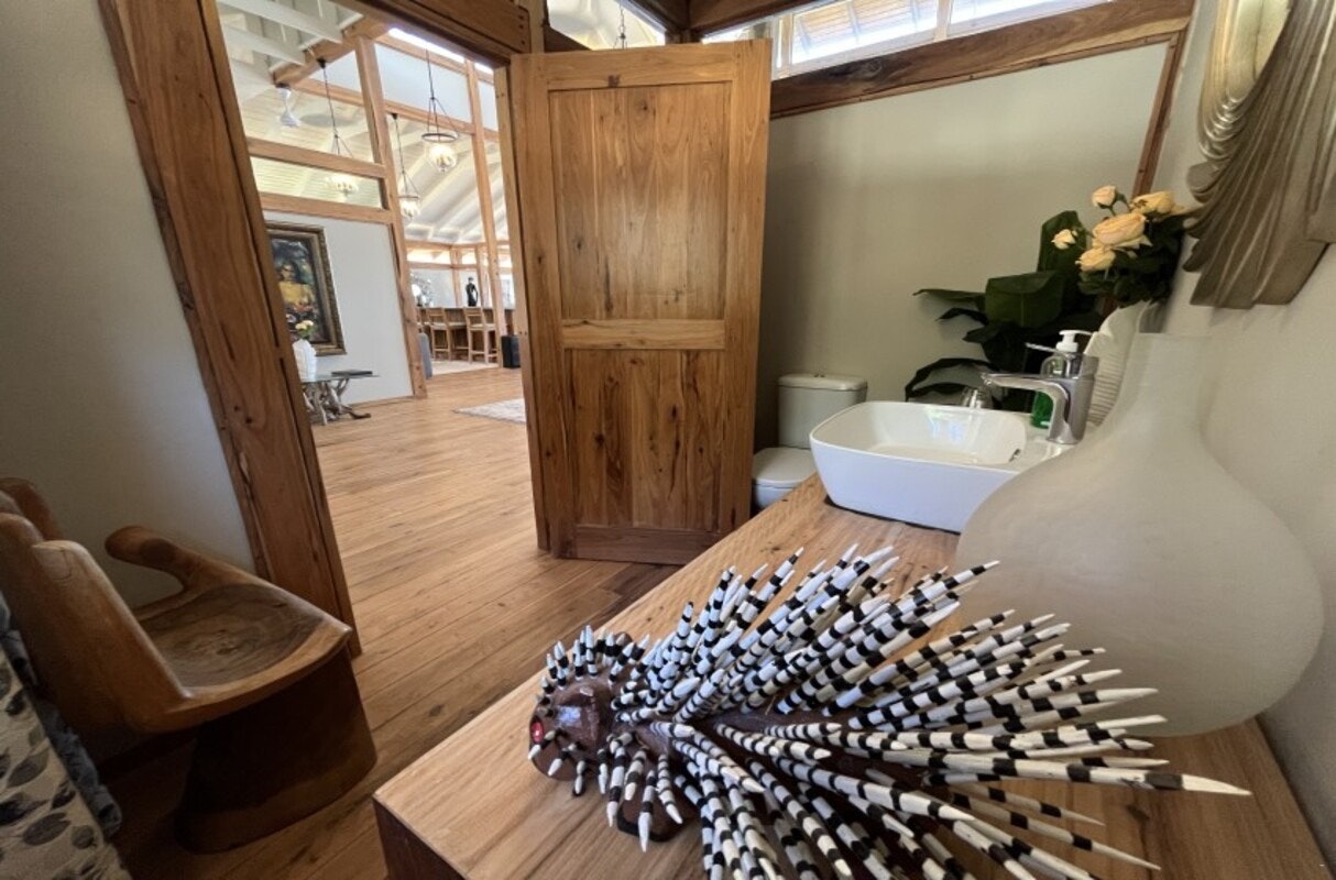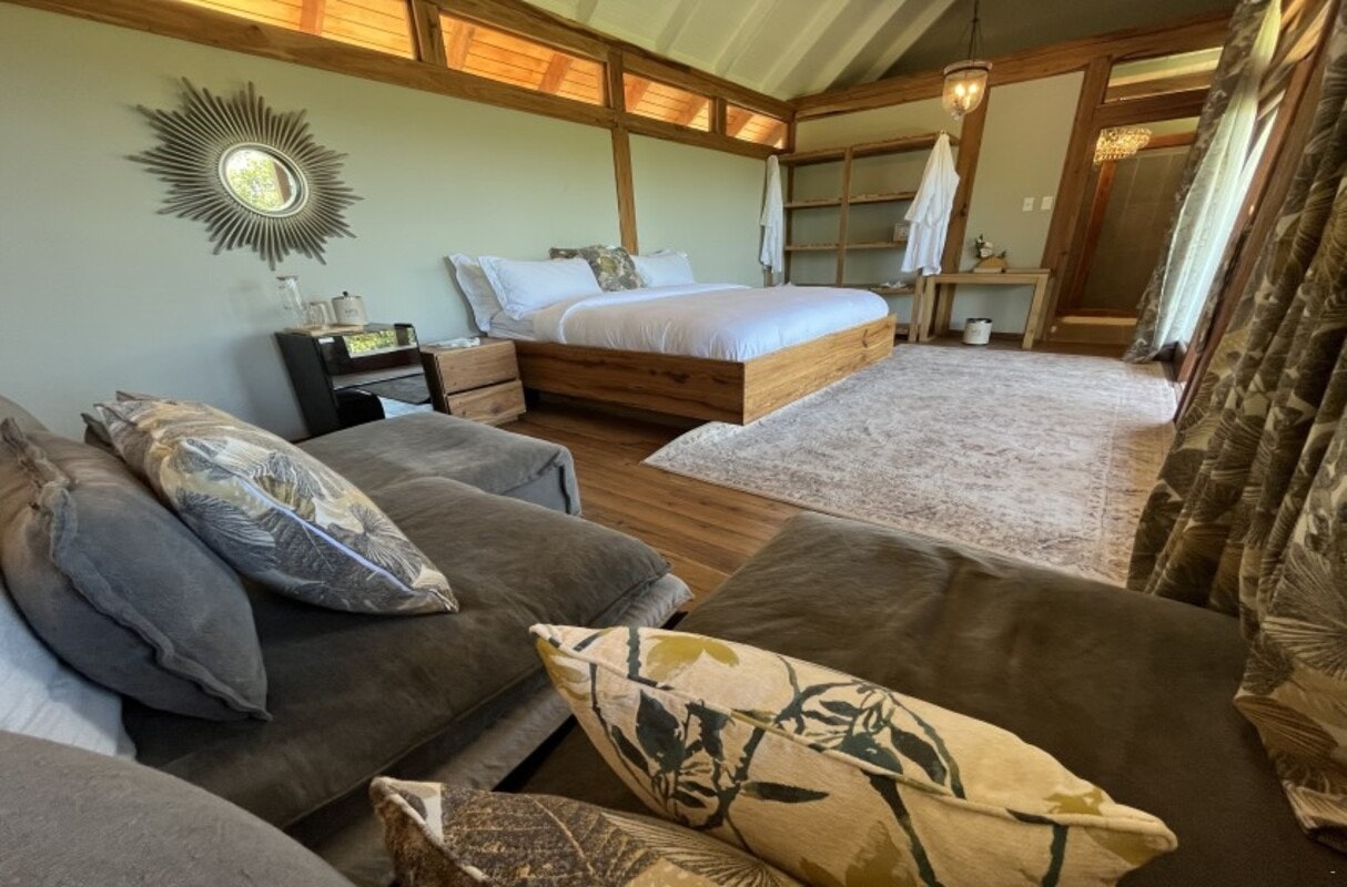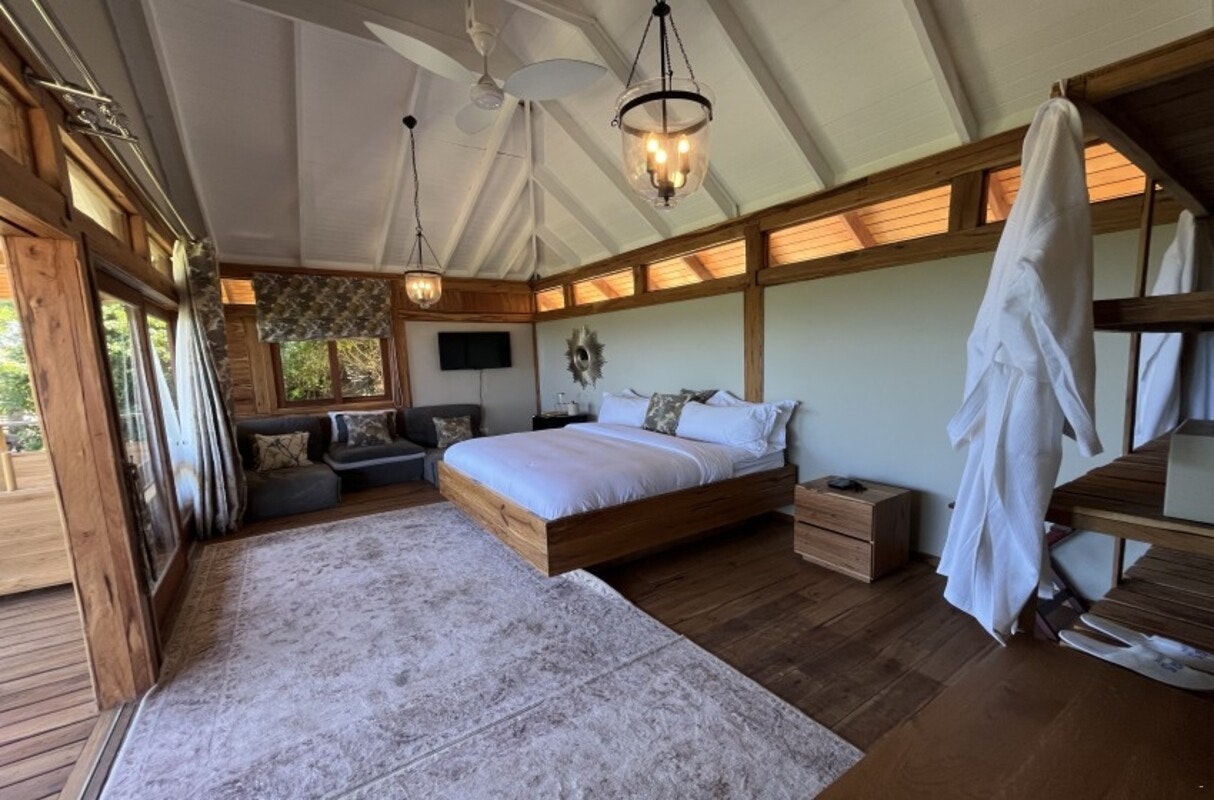 The sixth bedroom contains a king-size bed, a feather couch sitting area, and a private verandah. Additional amenities include a fridge, Smart TV, desk, solar air-conditioning, and high-performance fans. The en-suite bathroom is fitted with a shower, toilet, and basin, while gowns and slippers are provided to enhance comfort.