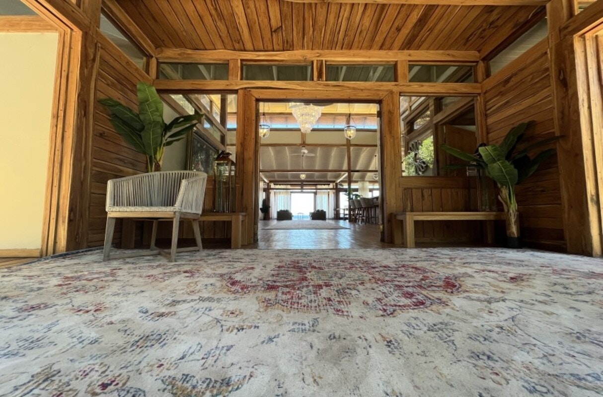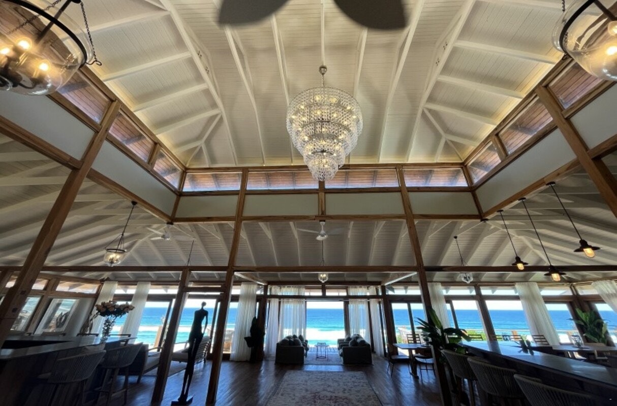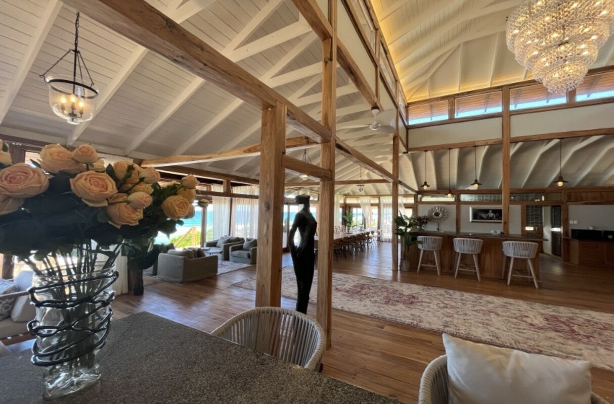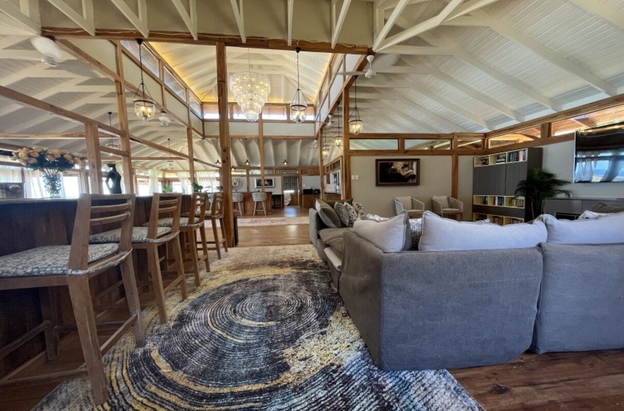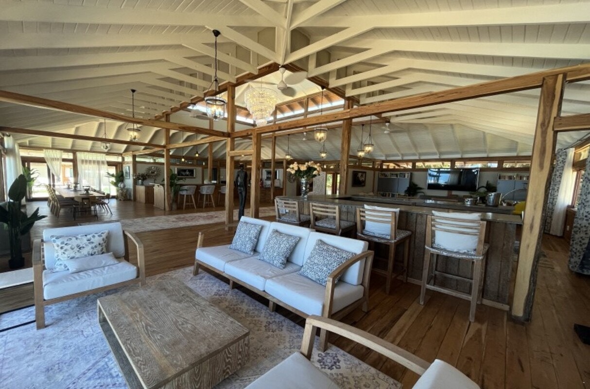 Chandeliers, fine art, and sculptures create a refined atmosphere, while the lounges and dining area can be enclosed with sliding glass doors for warmth on cooler evenings. A large rectangular bar is ideally positioned for enjoying sports and movies on the curved Smart TV. The indoor oak dining tables comfortably seat large groups, creating a welcoming space for gatherings and shared meals.