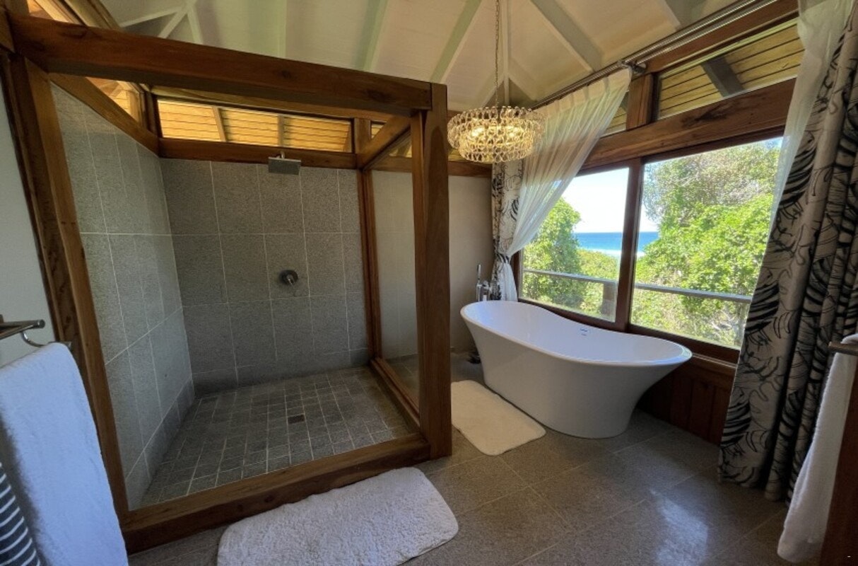 The second and third bedrooms each contain a king-size bed and open onto private verandahs with 180-degree ocean views. Both suites feature fridges, Smart TVs, desks, solar air-conditioning, and high-performance fans. Their en-suite bathrooms are fitted with a shower, toilet, and basin, and bathrobes and slippers are provided.