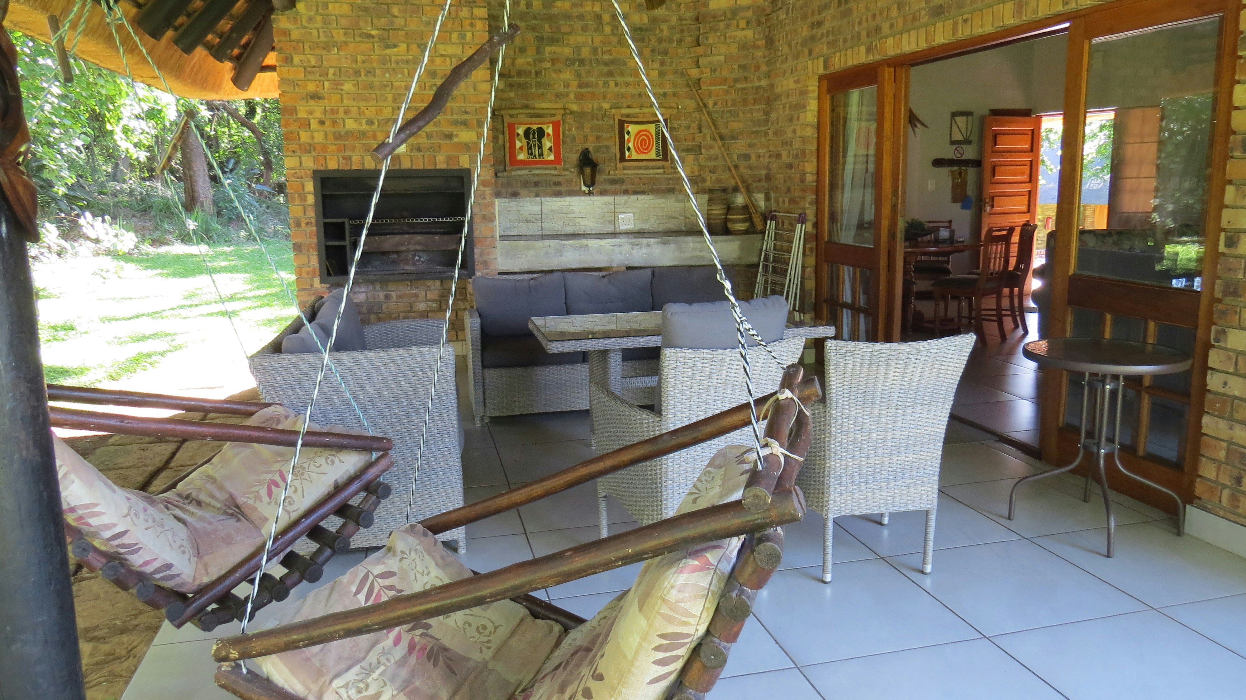 The well-equipped kitchen contains an oven and hob with an extractor fan, dishwasher, dryer, a large fridge-freezer, microwave, toaster, a kettle, and plenty of storage space and granite work surfaces. The open-plan living area features a TV with 45 selected DStv channels and leads out onto the covered entertainment area which boasts a built-in braai area for guests to use. The chalet has an inverter and a small gas plate for load shedding.