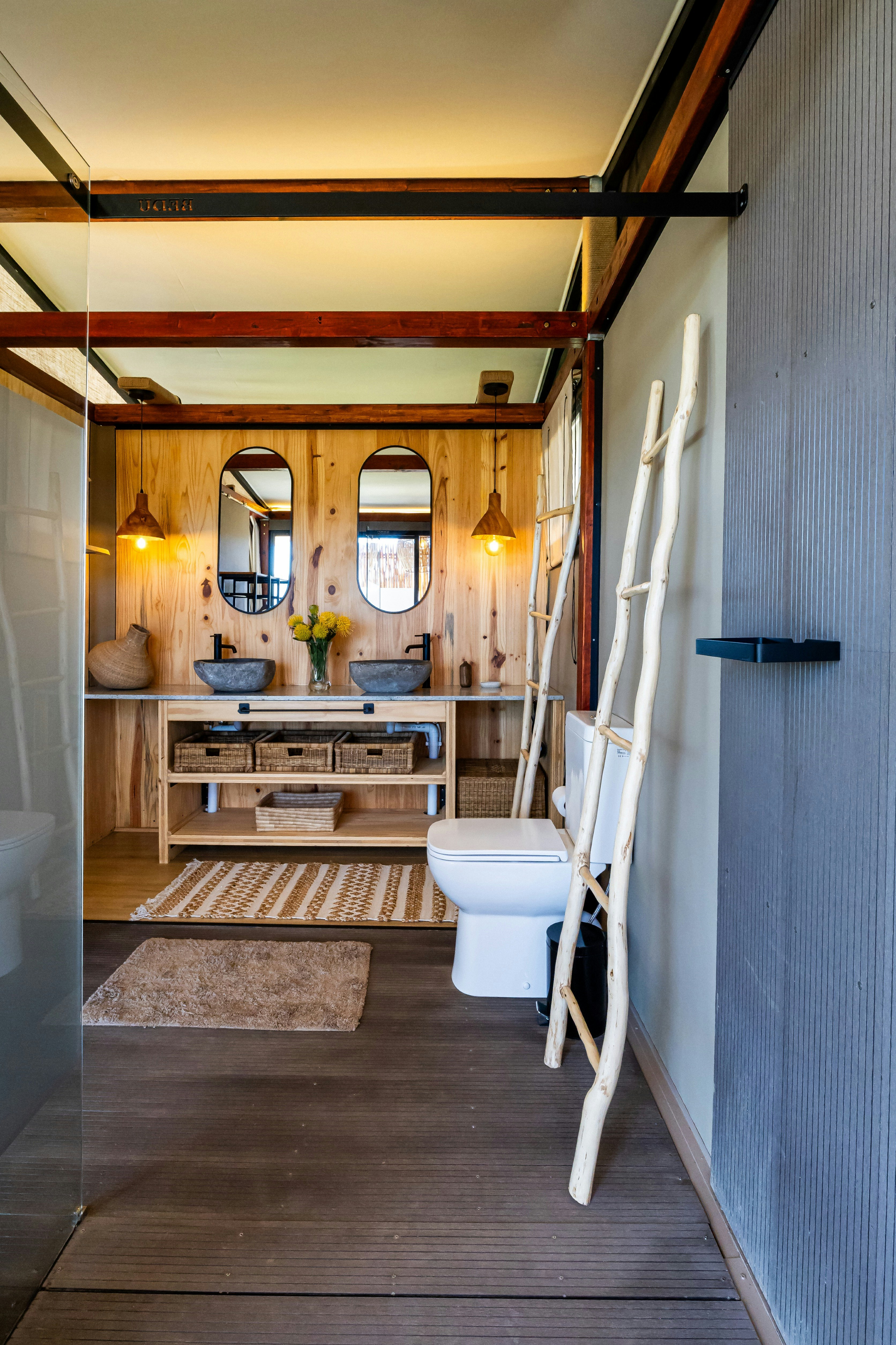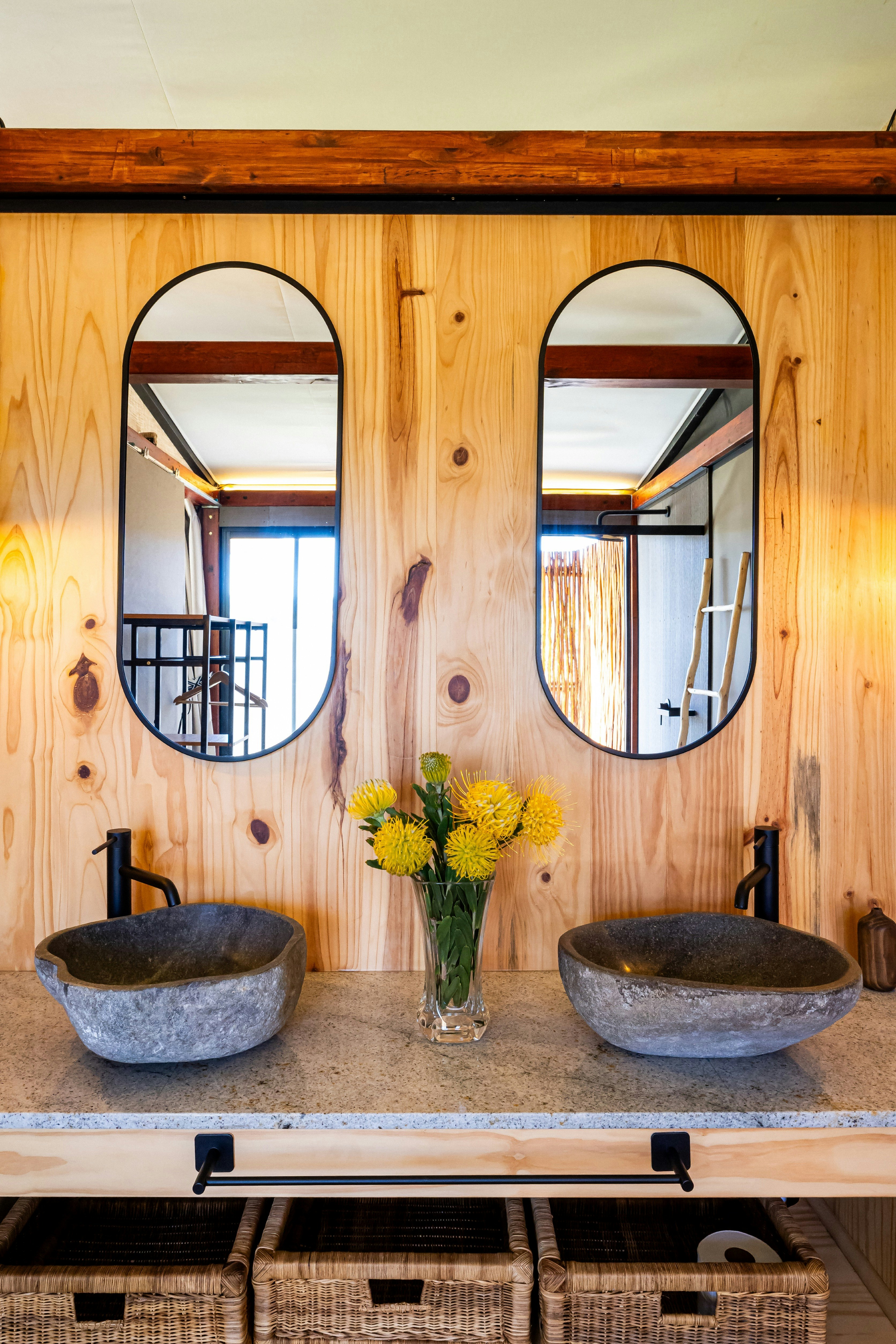 The air-conditioned tent accommodates 2 guests and is furnished with a king-size bed. The bathroom includes a shower and a unique outdoor bathtub for soaking under the stars.