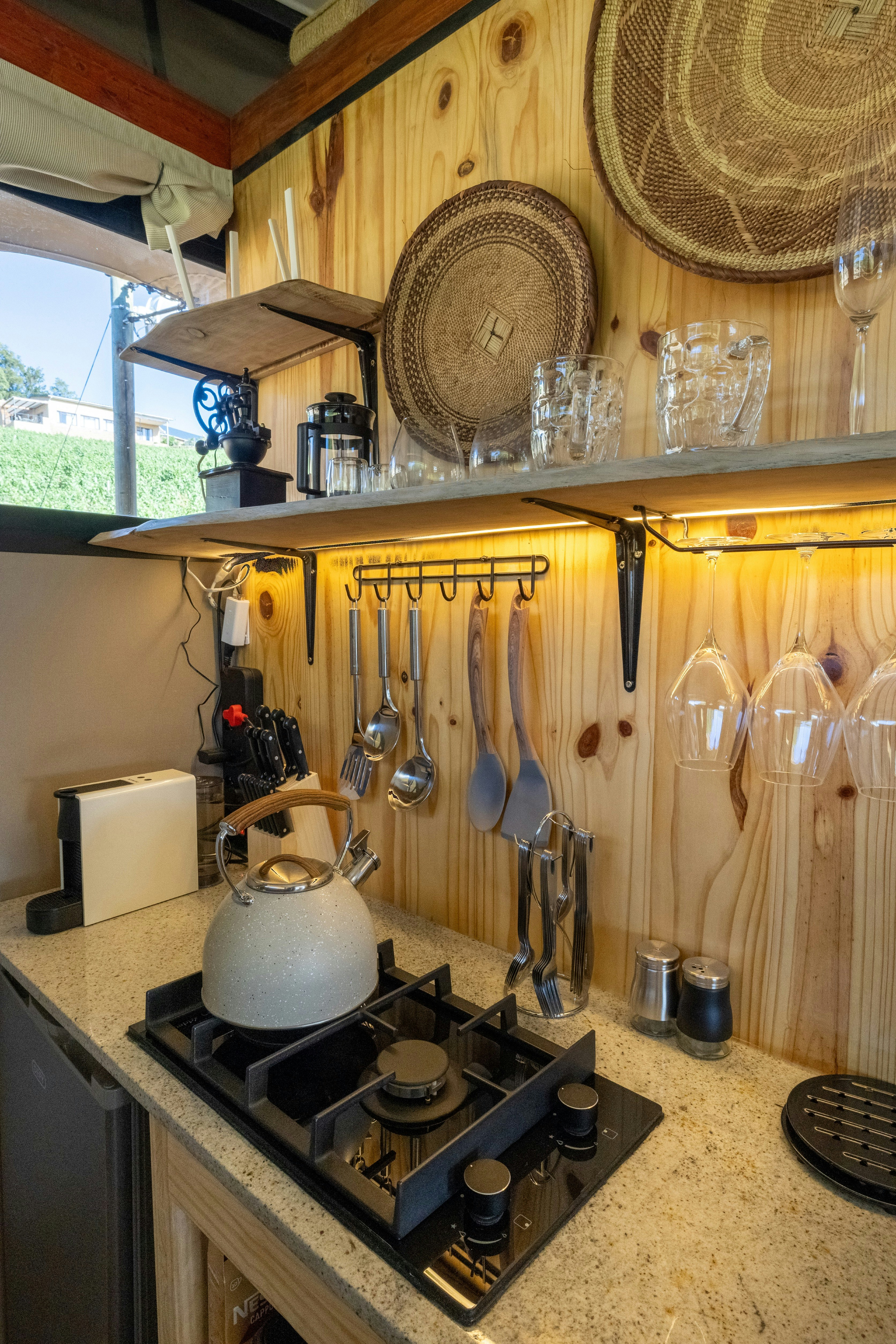 The kitchenette is equipped with a bar fridge, gas stove, toaster, kettle and coffee machine. The tent also opens onto a covered patio where guests can relax and take in the views.