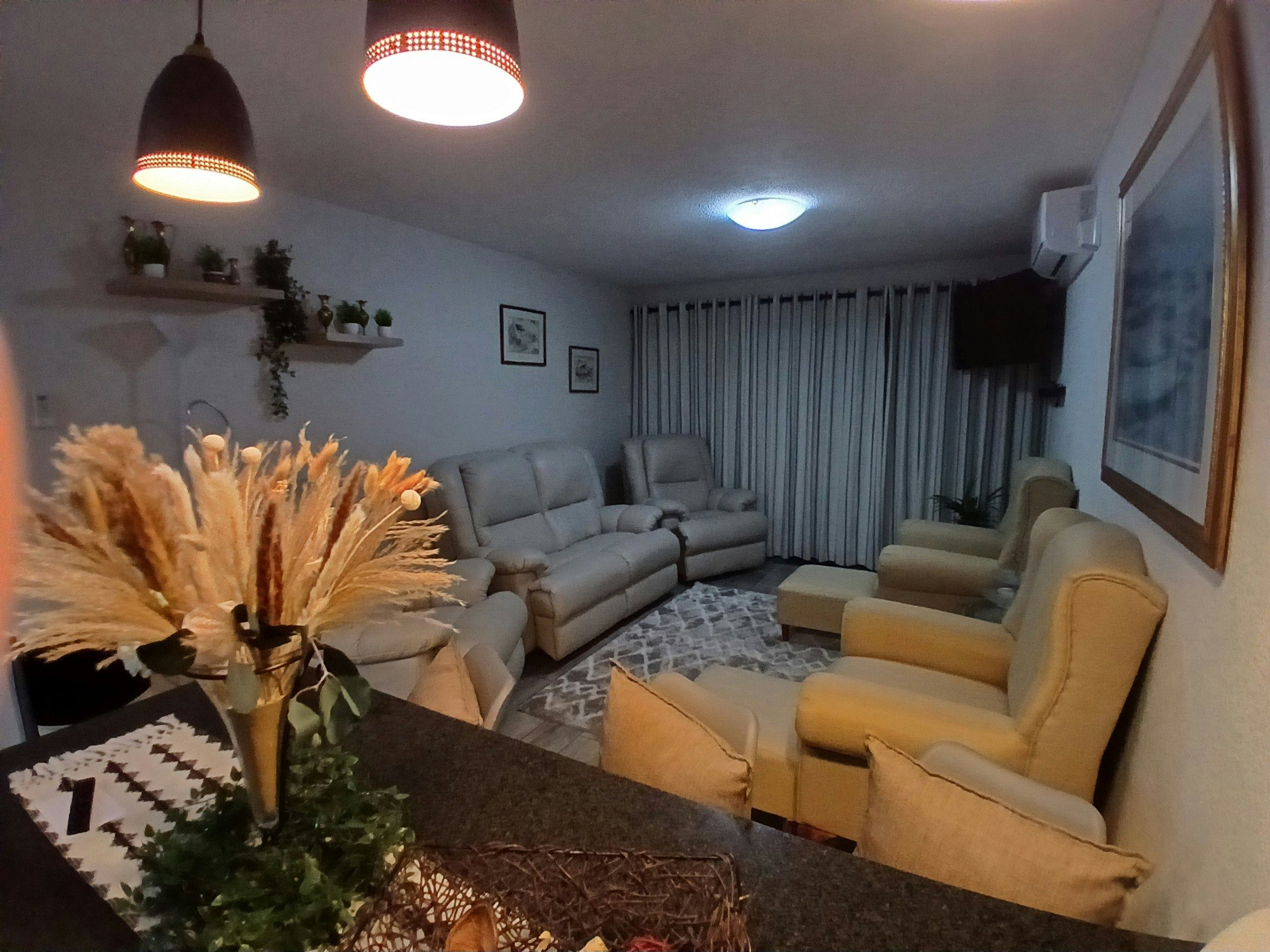 The kitchen is fully equipped with a fridge/freezer, electric oven with gas hob, microwave oven, pizza oven, air-fryer, electric kettle, toaster, as well as a dishwasher for guests' convenience. The lounge is equipped with comfortable recliner chairs, a Full HD Smart TV, DStv via stream device, Netflix, YouTube and free Wi-Fi. Sliding doors open up to a private balcony with a built-in barbecue area and beautiful views of the ocean and lagoon.