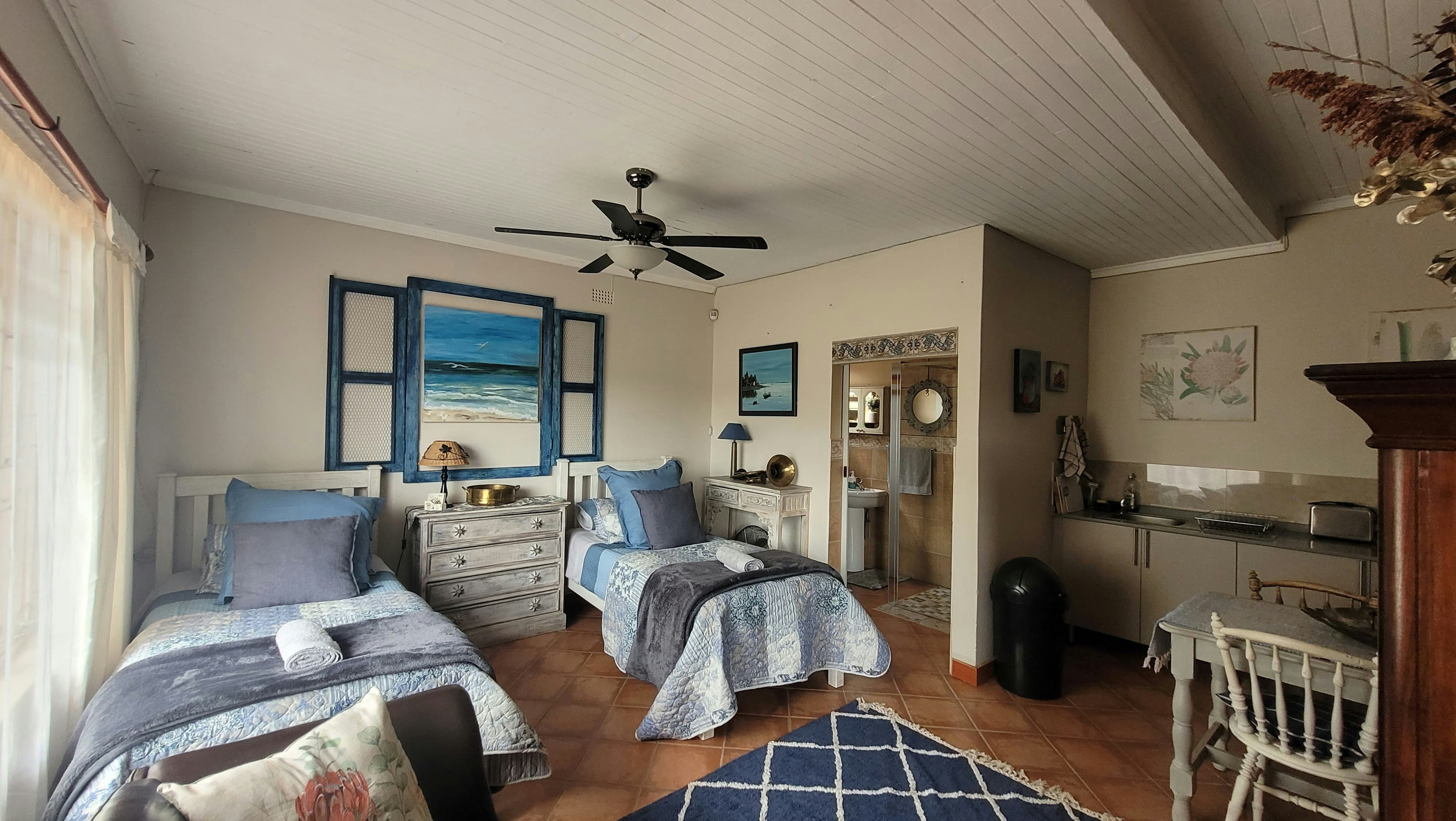 The second unit can accommodate 2 guests, a family with 2 or 3 children travelling together. The bedroom is furnished with a double bed and a single bed, and a TV with an open view and aircon while the open living area has 2 single beds, a ceiling fan and a TV with Netflix. The private bathroom is accessible from the lounge and is fitted with a shower. The kitchen is equipped with a fridge-freezer, gas stove, air-fryer, kettle and microwave. A 4-seater dining table, two comfy couches, and a TV with Netflix are available as well. There is a door between the room and the lounge for privacy.