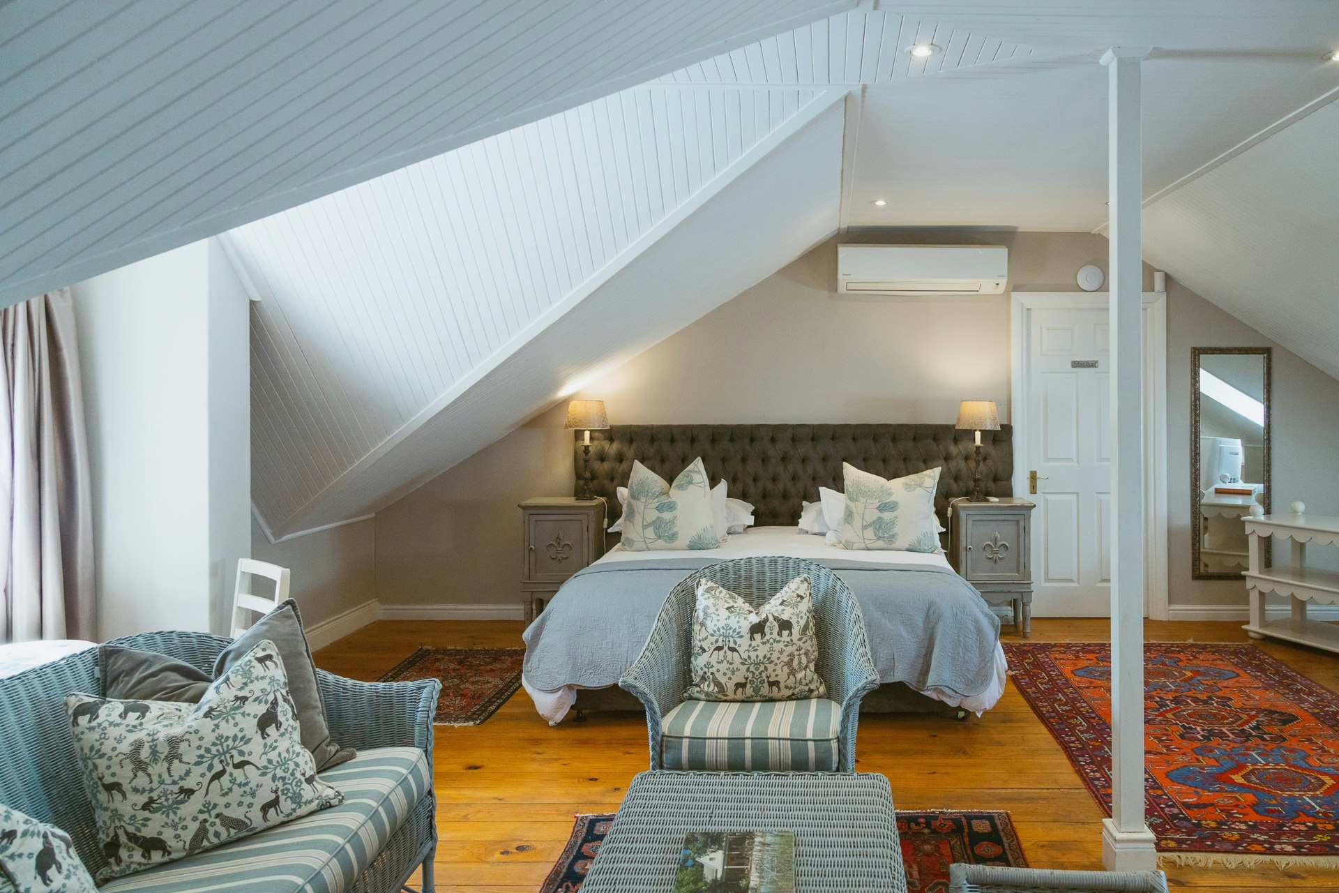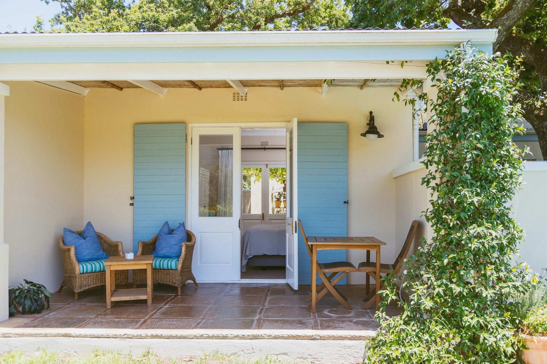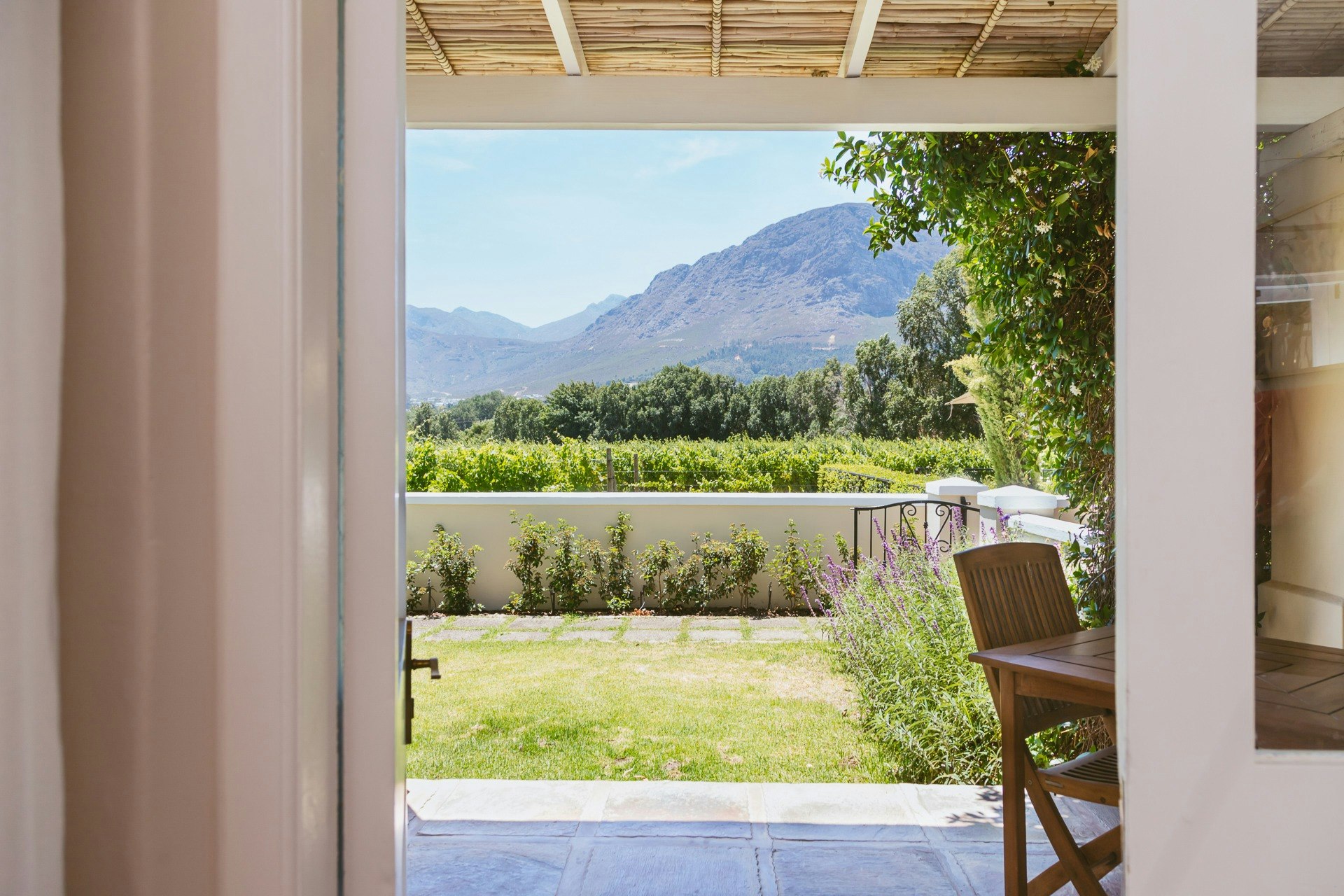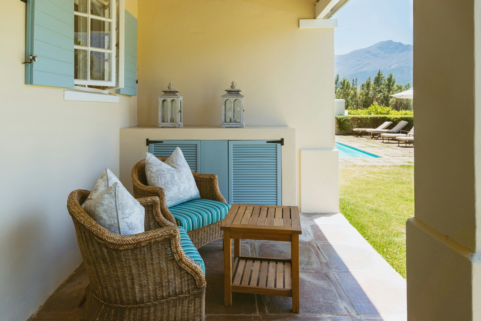 There is also a historic, 3-bedroom self-catering villa. This secluded, beautifully appointed, original Cape farmhouse has a large covered terrace, fabulous private swimming pool and stunning views of the Franschhoek Mountains. Two bedrooms downstairs each has its own full bathroom, of which one is en suite. The large, open loft room with its lovely mountain hues of white and blue offers an en-suite shower room. Its only access is via an outside staircase, which makes it ideal for independent teenagers and adults. Downstairs, the lovely open spaces allow for quality family times. The kitchen is fully equipped and also offers a Nespresso machine. The house comes with a washing machine and ironing facilities, iPod docking station, satellite TV & DVD player, wood-burning fireplace, gas BBQ, loose standing fans and heaters and there are also hairdryers. In- & outside dining areas make for memorable mealtimes. Speak to us prior to arrival about the continental breakfast that can be arranged at an extra fee.
