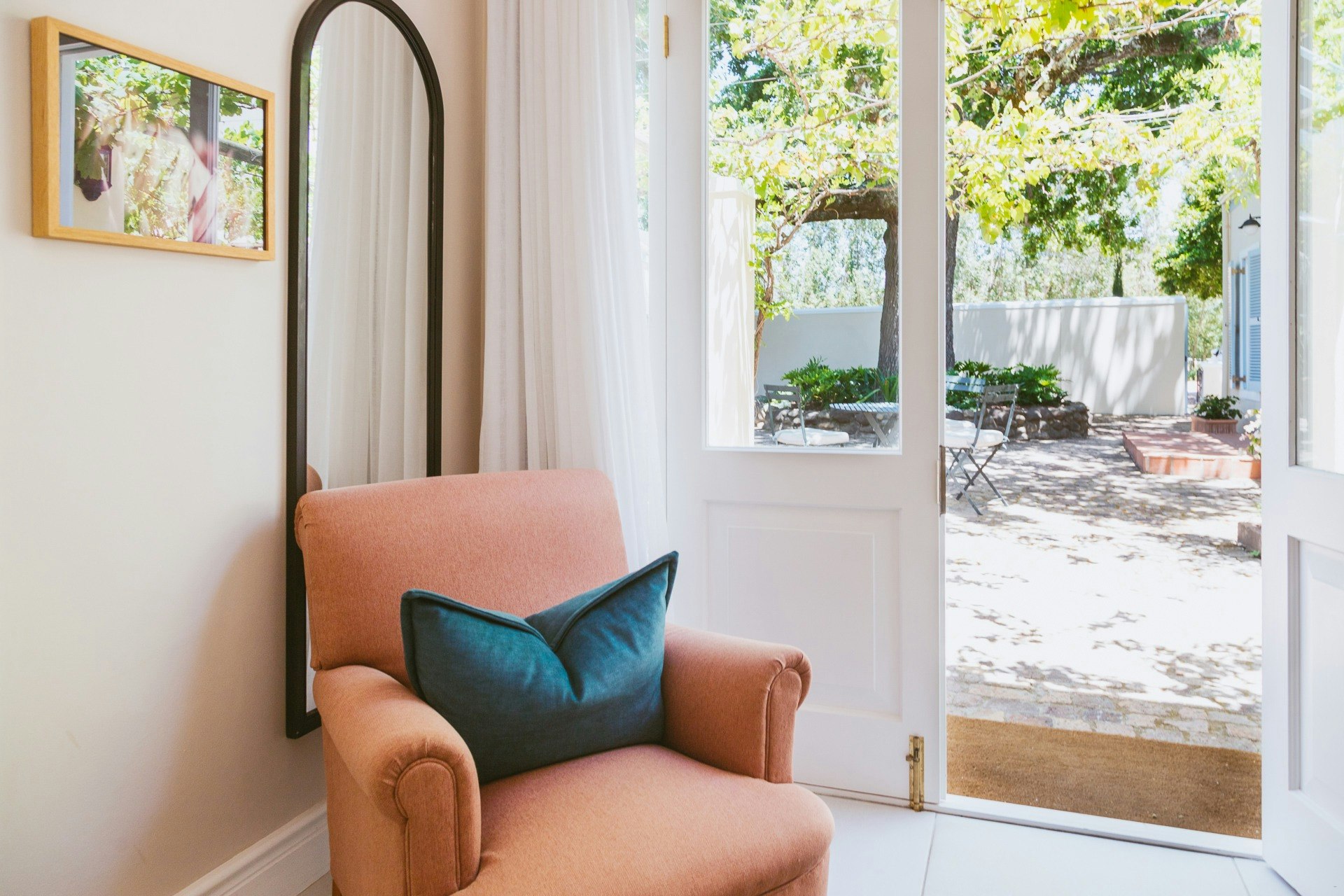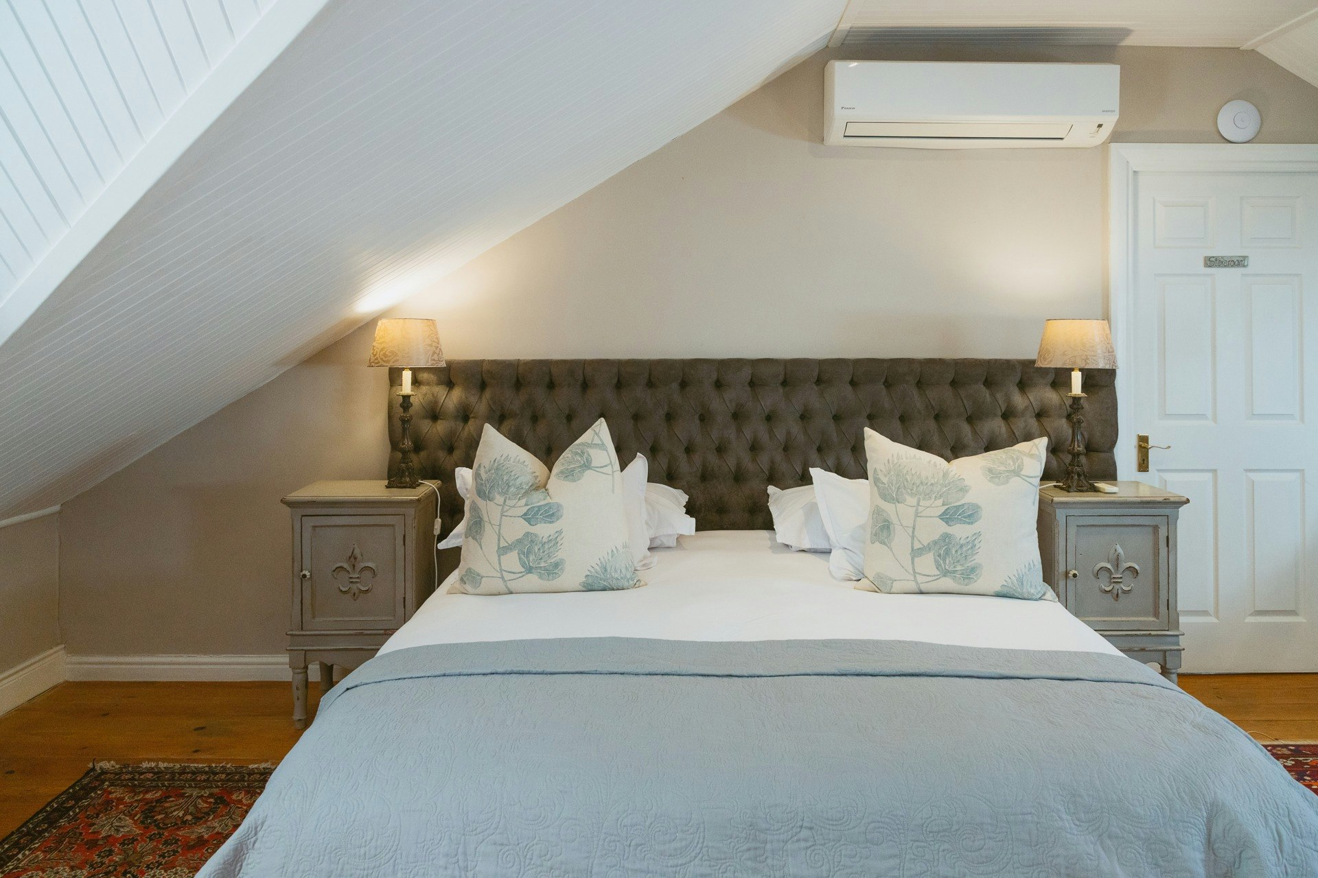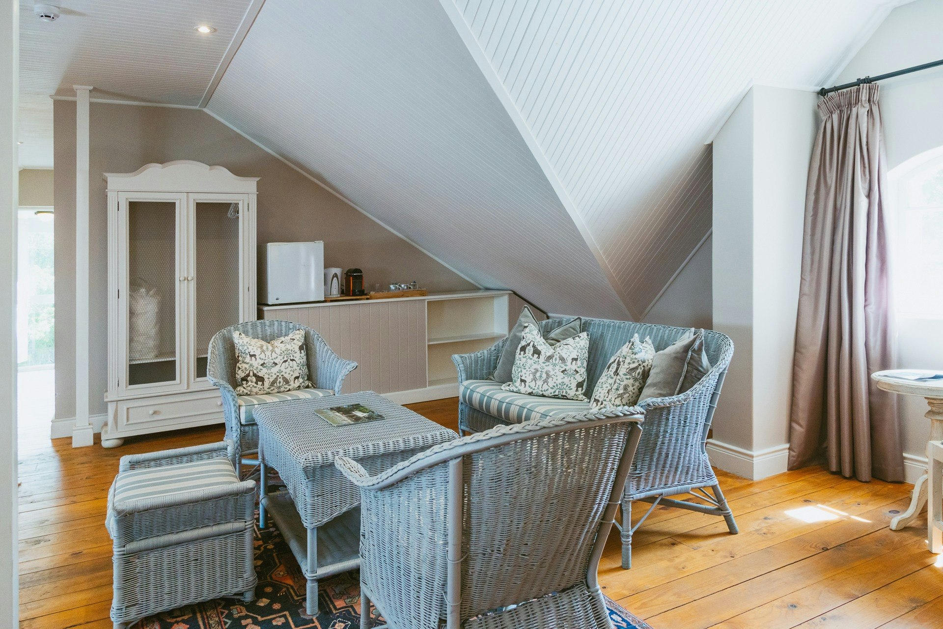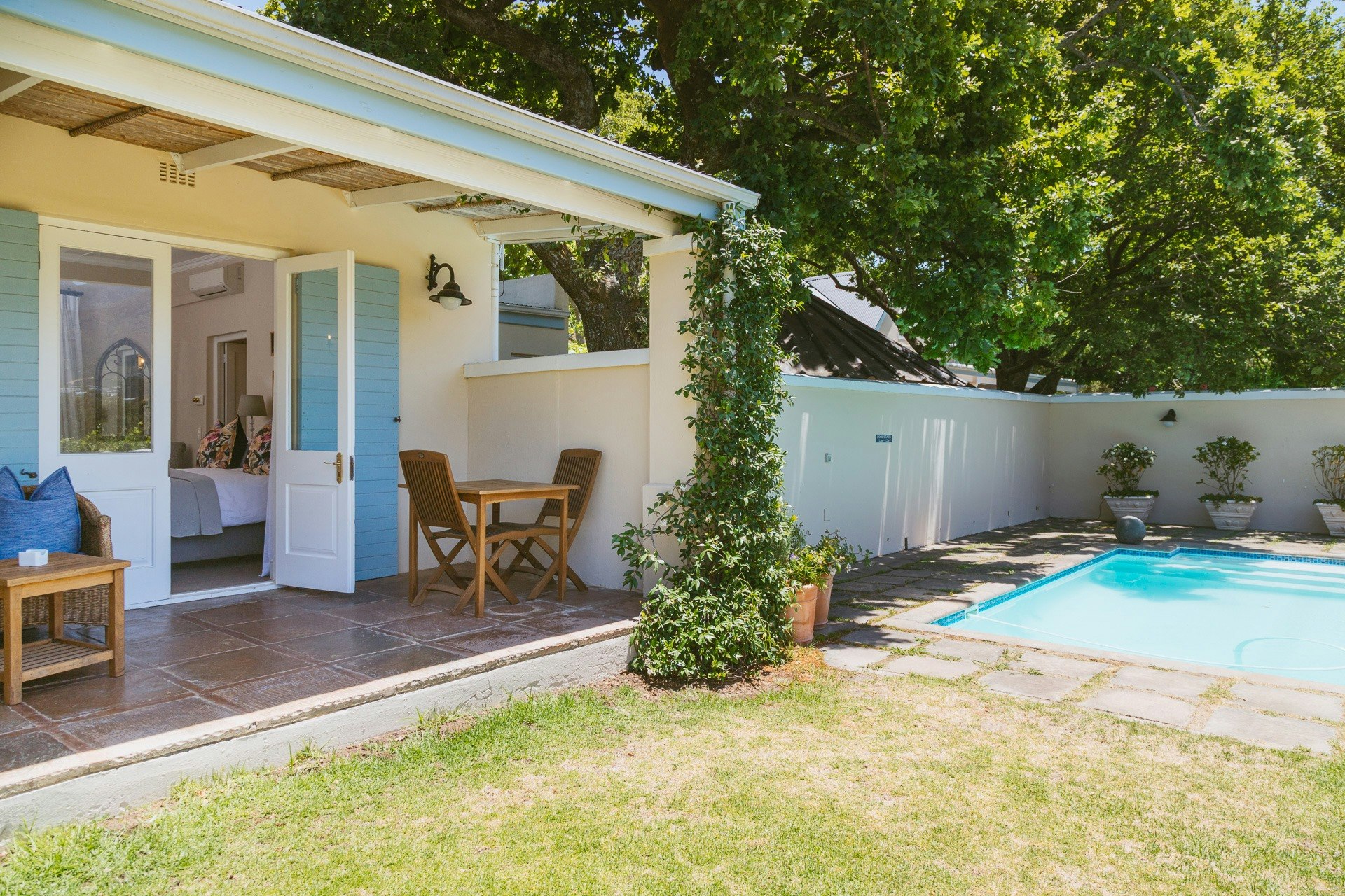 There is also a historic, 3-bedroom self-catering villa. This secluded, beautifully appointed, original Cape farmhouse has a large covered terrace, fabulous private swimming pool and stunning views of the Franschhoek Mountains. Two bedrooms downstairs each has its own full bathroom, of which one is en suite. The large, open loft room with its lovely mountain hues of white and blue offers an en-suite shower room. Its only access is via an outside staircase, which makes it ideal for independent teenagers and adults. Downstairs, the lovely open spaces allow for quality family times. The kitchen is fully equipped and also offers a Nespresso machine. The house comes with a washing machine and ironing facilities, iPod docking station, satellite TV & DVD player, wood-burning fireplace, gas BBQ, loose standing fans and heaters and there are also hairdryers. In- & outside dining areas make for memorable mealtimes. Speak to us prior to arrival about the continental breakfast that can be arranged at an extra fee.