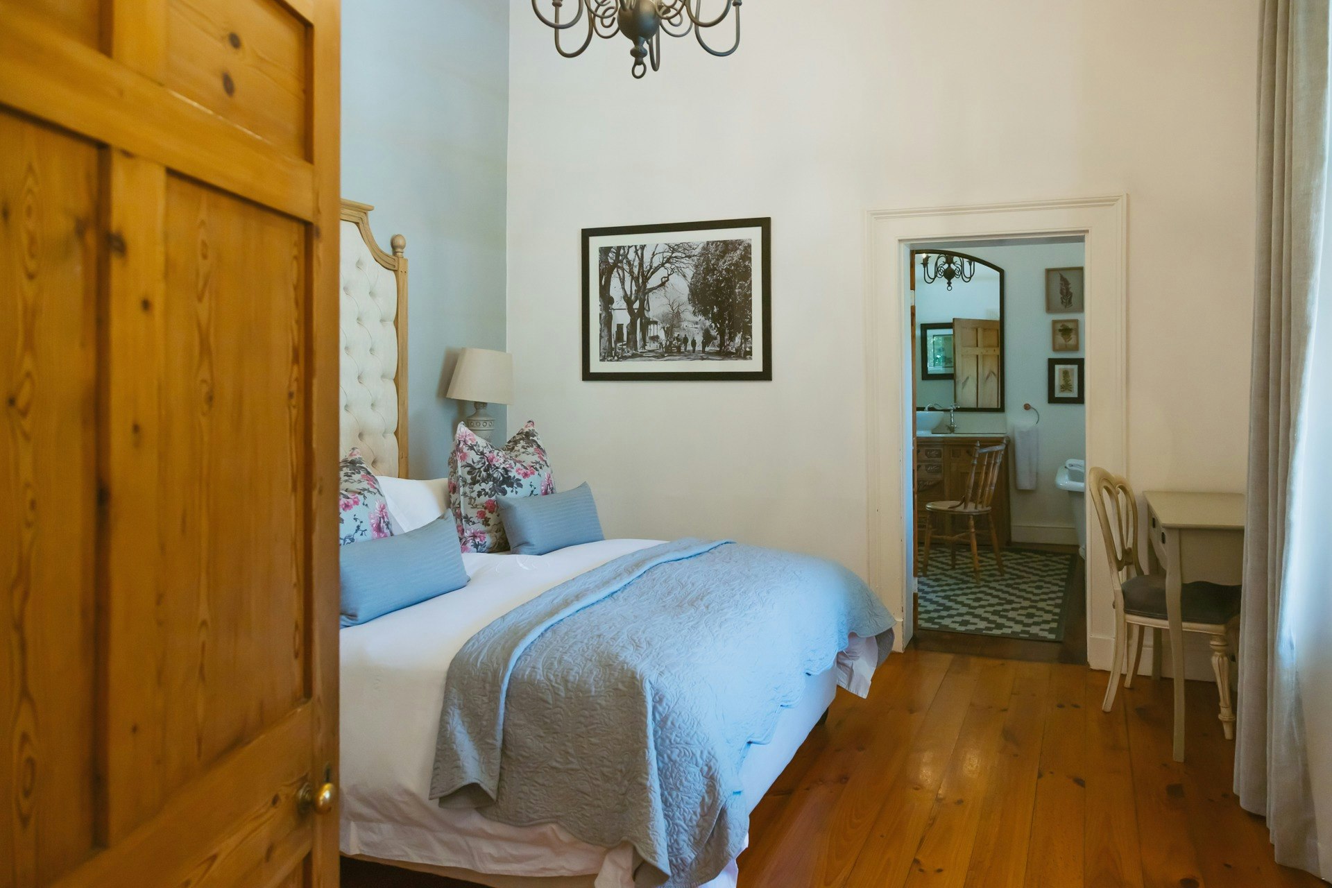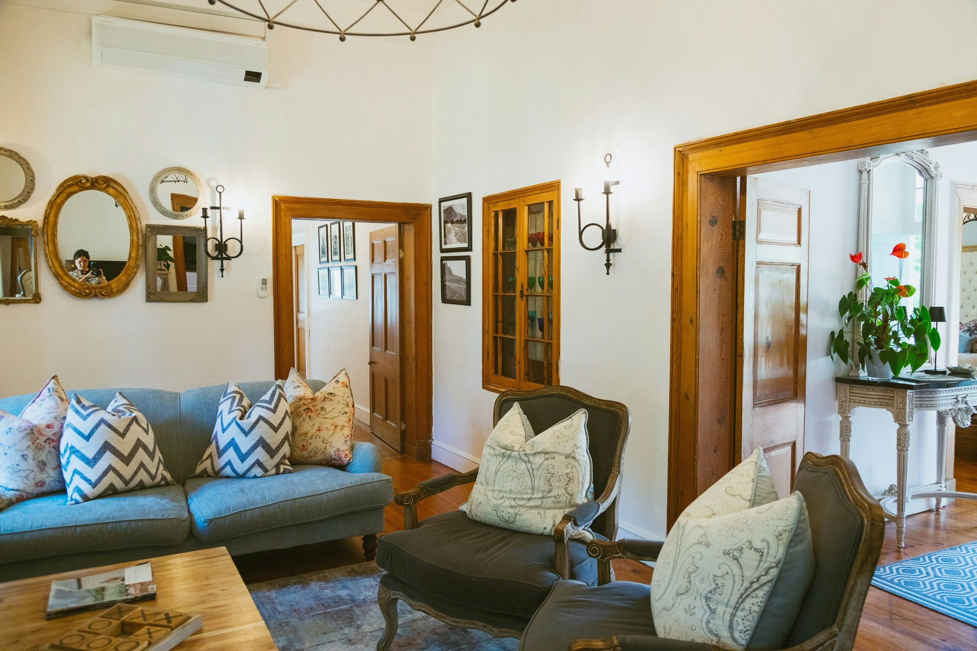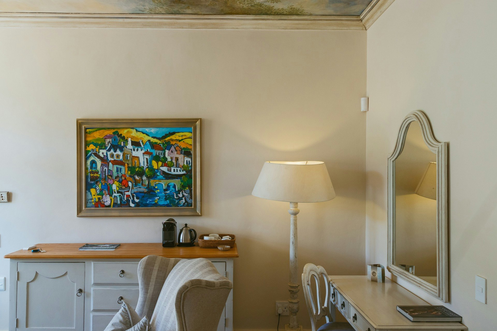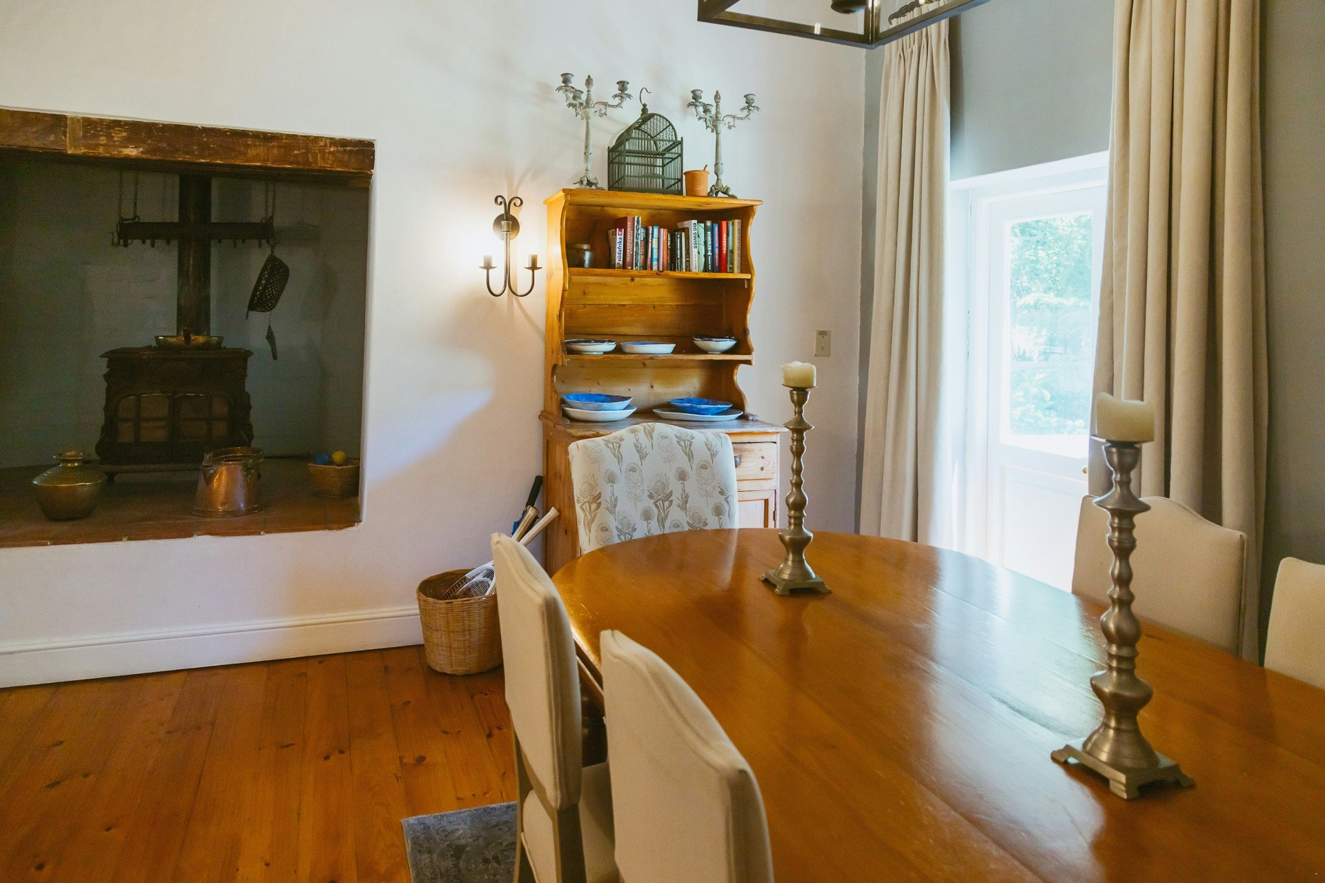 There is also a historic, 3-bedroom self-catering villa. This secluded, beautifully appointed, original Cape farmhouse has a large covered terrace, fabulous private swimming pool and stunning views of the Franschhoek Mountains. Two bedrooms downstairs each has its own full bathroom, of which one is en suite. The large, open loft room with its lovely mountain hues of white and blue offers an en-suite shower room. Its only access is via an outside staircase, which makes it ideal for independent teenagers and adults. Downstairs, the lovely open spaces allow for quality family times. The kitchen is fully equipped and also offers a Nespresso machine. The house comes with a washing machine and ironing facilities, iPod docking station, satellite TV & DVD player, wood-burning fireplace, gas BBQ, loose standing fans and heaters and there are also hairdryers. In- & outside dining areas make for memorable mealtimes. Speak to us prior to arrival about the continental breakfast that can be arranged at an extra fee.