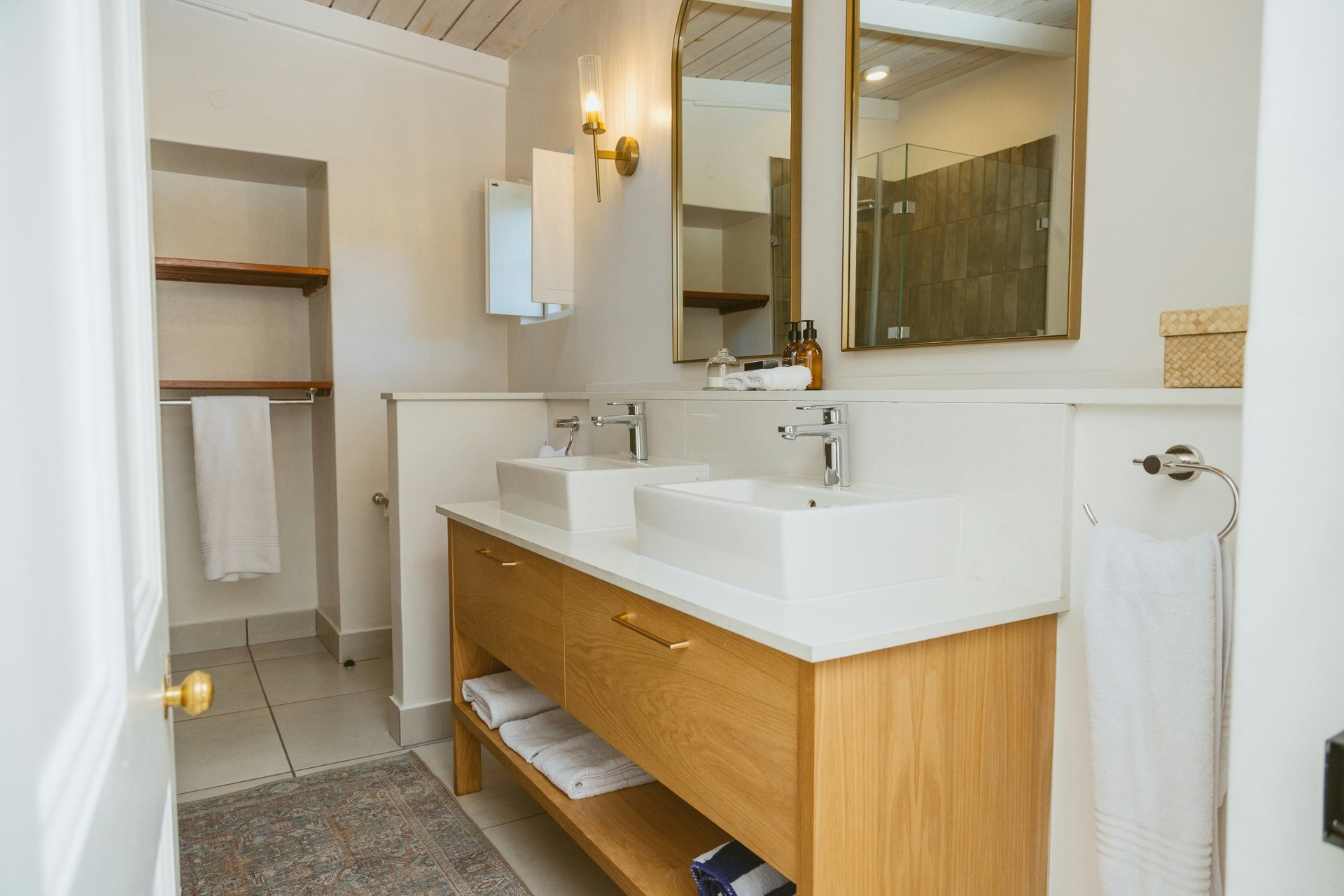 The loft rooms are light and stylish with great mountain and vineyard views while the pool rooms overlook the plum orchards and majestic mountains beyond. The bathrooms are lovely and most have separate showers, double basins and heated towel rails. Underfloor heating, ceiling fans and air-conditioning ensure year-round comfort. The hopelessly romantic honeymoon suite has an oversized bath, double showers and a king-size bed beneath a hand-painted, pastoral ceiling of clouds and birds.