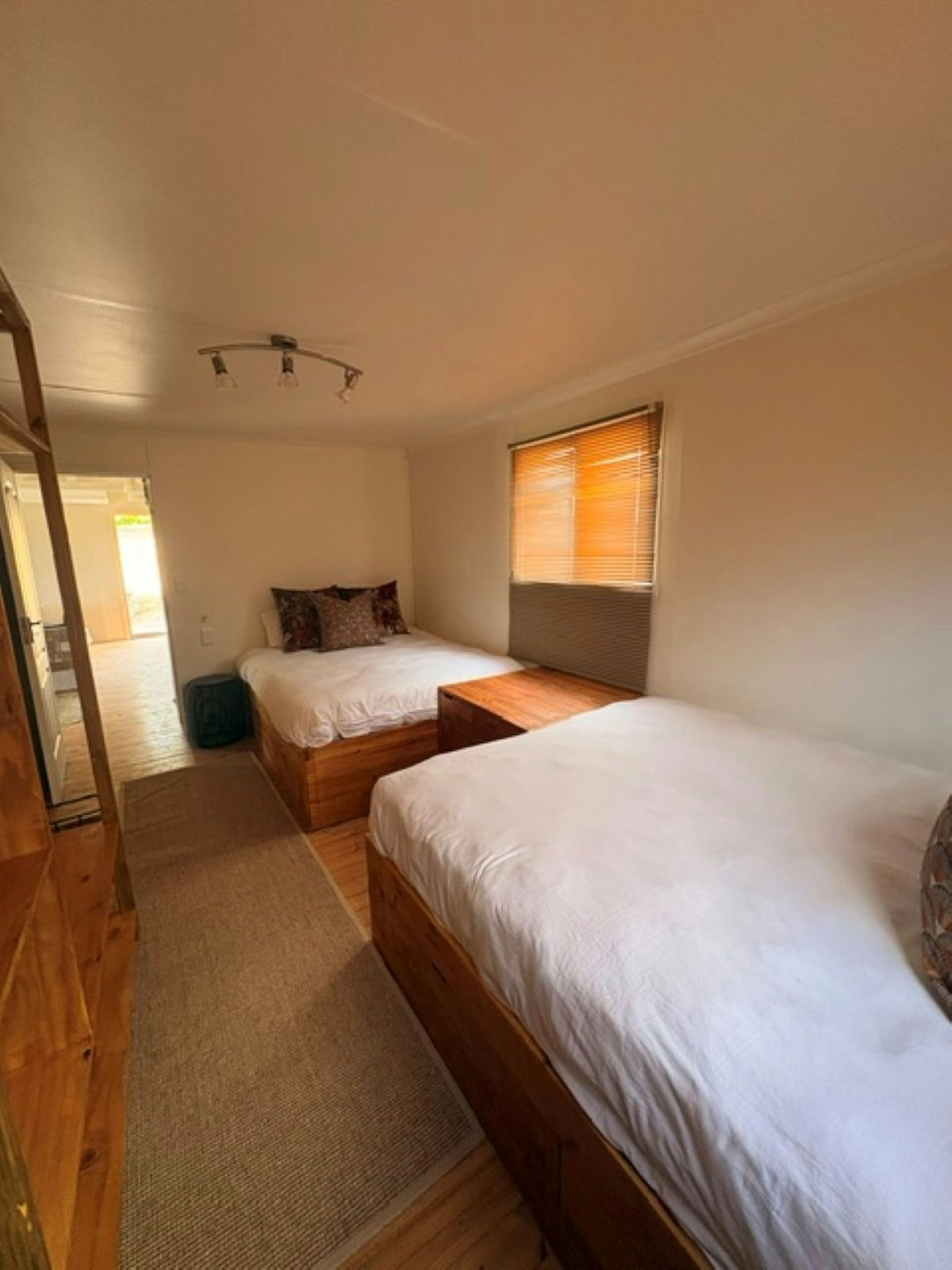 The Autumn Lane Soleil Suite's main bedroom has a queen-size bed. The second bedroom has 3 child-only beds. The bathroom is fitted with a bath, a shower, a toilet and a wash basin. The unit has a full kitchen consisting of a fridge-freezer, microwave, and stove-oven as well as tea-and-coffee-making facilities. Guests can enjoy a meal at the 6-seater dining table or unwind in the lounge. There is a TV with Netflix and DStv for entertainment. There are indoor braai facilities as well as a fire pit and splash pool. Guests must bring their own wood.