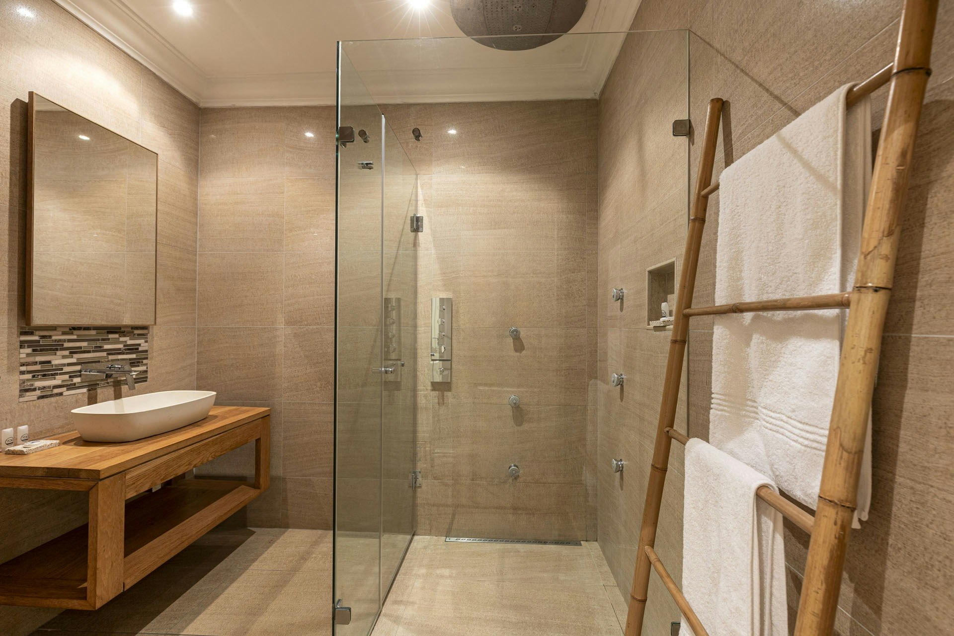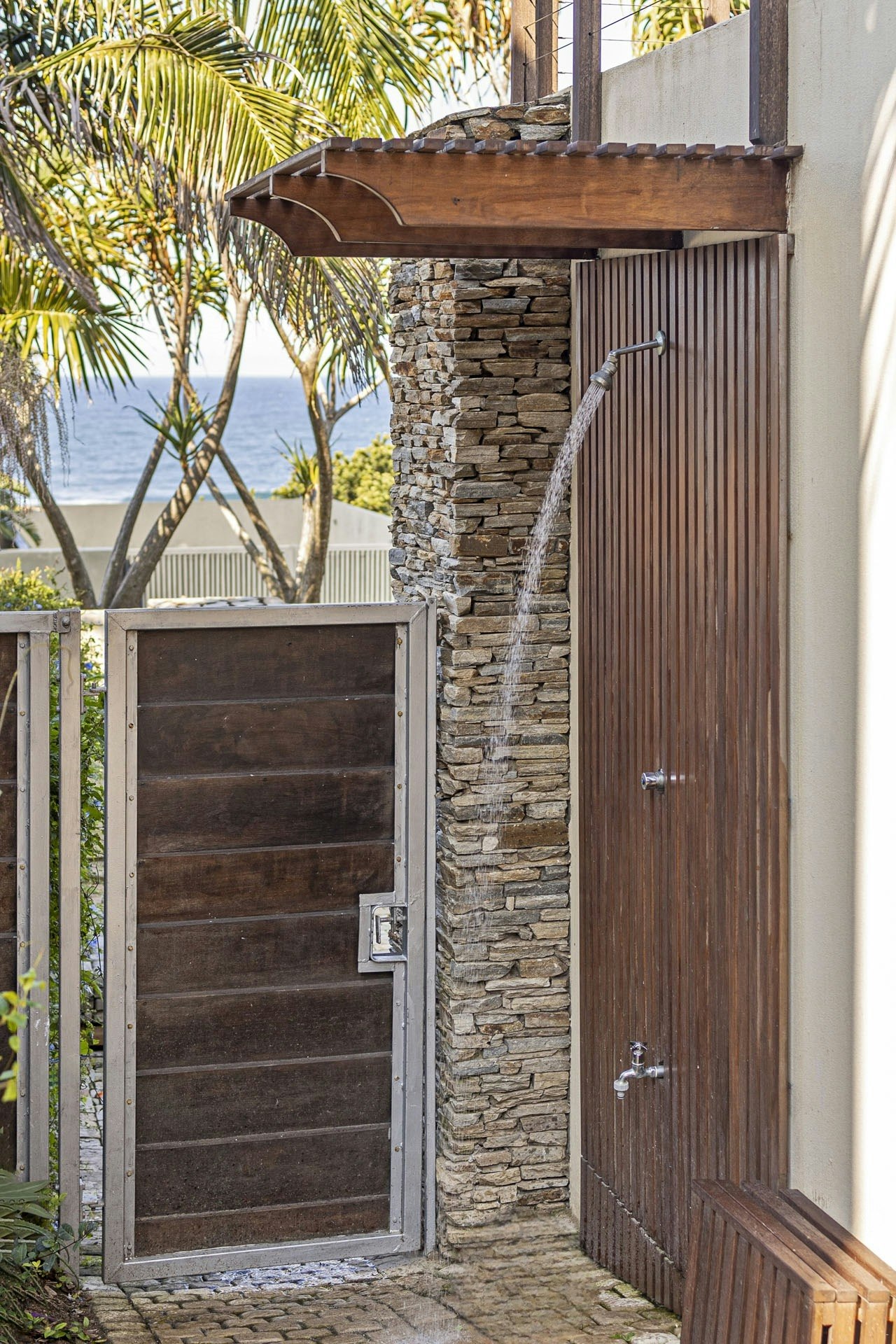Ballito Beach House Villa has a double-storey main house with 4 bedrooms and a separate cottage. The main bedroom has a queen-size bed and an en-suite bathroom fitted with a shower, bath, toilet and basin. The 2 other bedrooms each have a double-size bed and an en-suite bathroom with a shower, toilet and basin. The third bedroom has a double bed and shares a bathroom with a shower, toilet and basin.