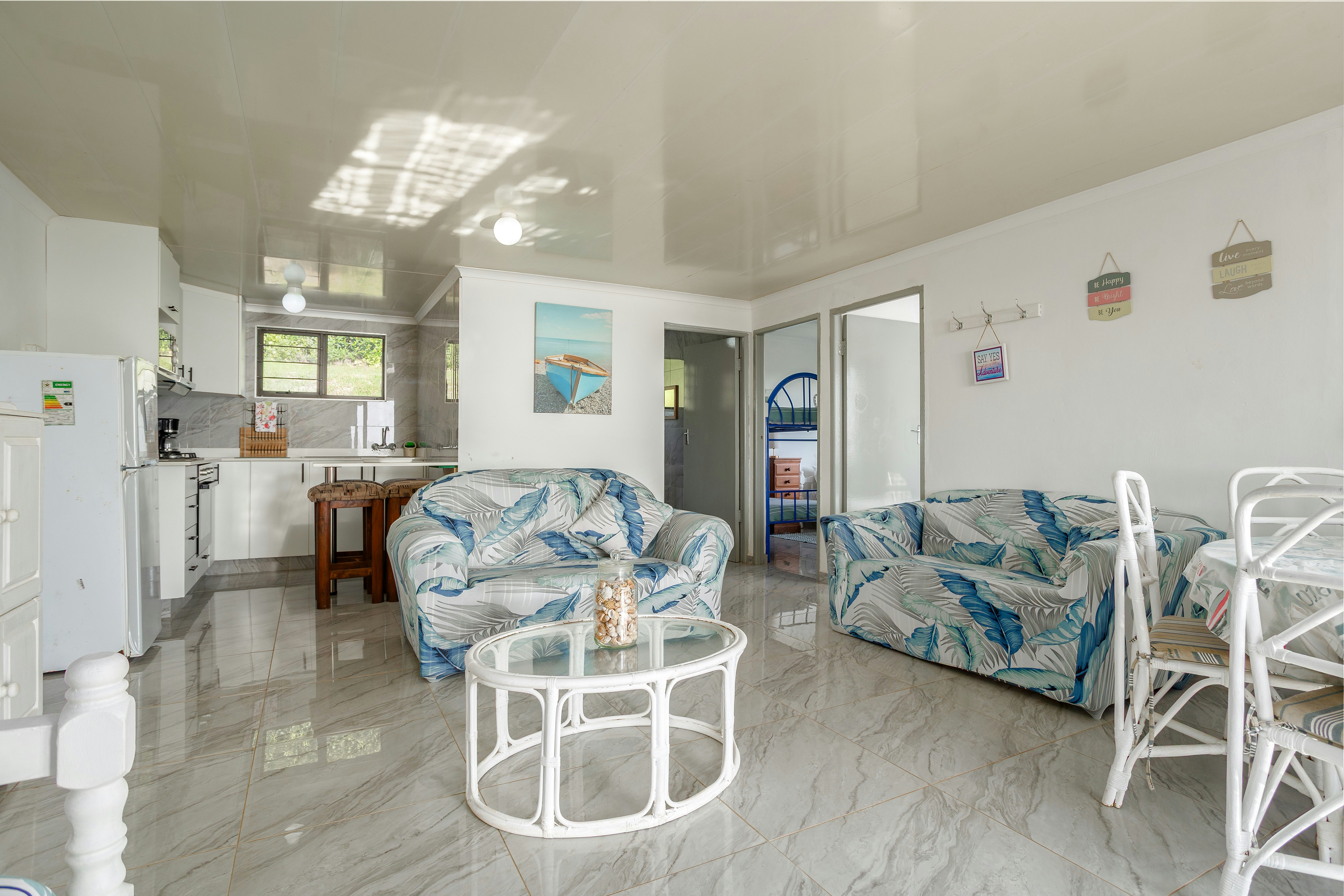 The living area is furnished with comfortable couches and a TV, including a 6-seater dining table perfect for meals.