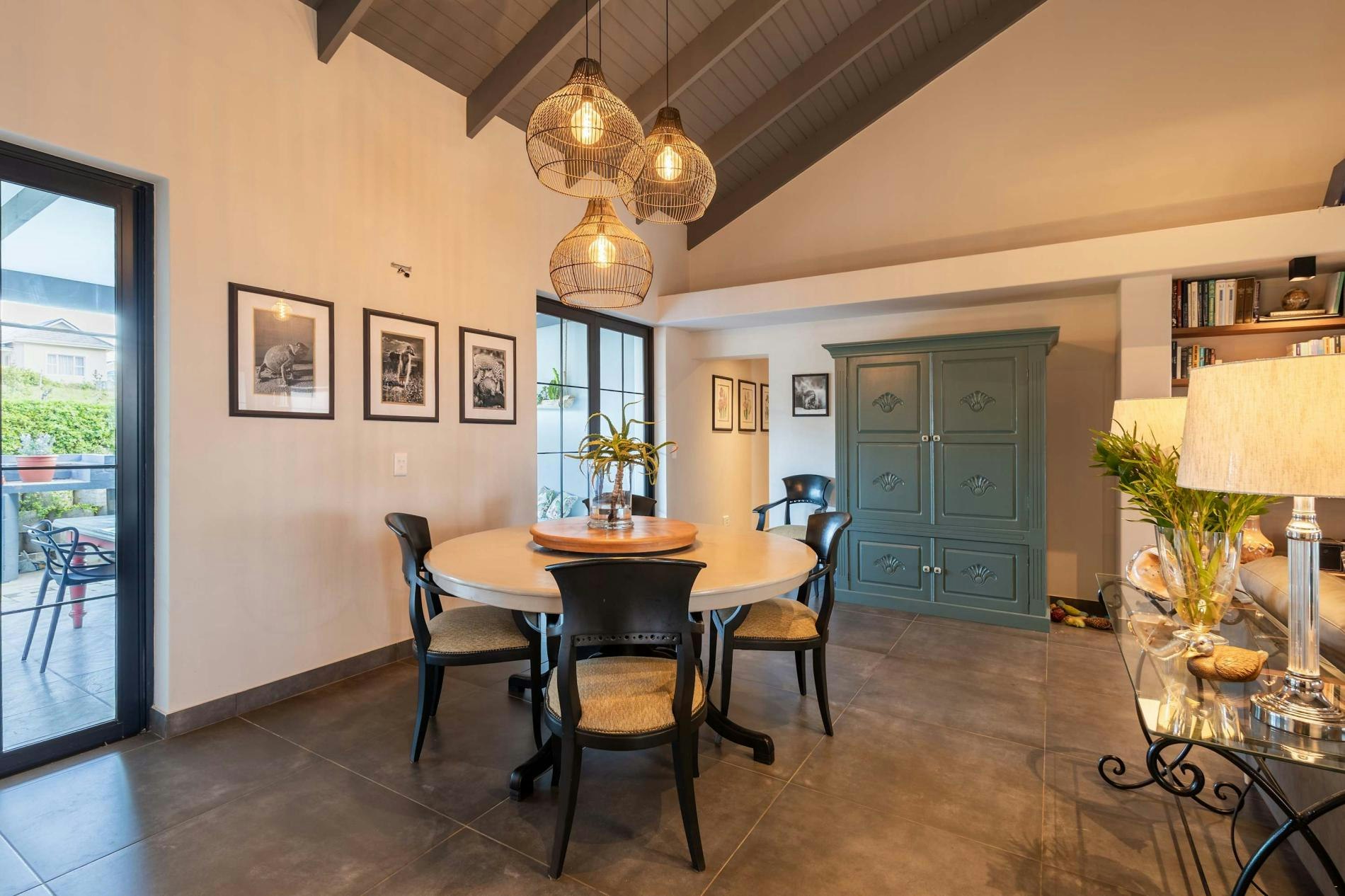 The kitchen is fully equipped with a stove. oven, microwave, cutlery, crockery, utensils, kettle, toaster, fridge-freezer, Nespresso Machine, kitchen island, and breakfast nook, walking into the open-plan living area that offers a fireplace, comfortable seating, a TV with streaming sites, a library that leads out onto a patio with outdoor furniture that overlooks the hills. The dining table can seat up to 6 guests, with doors leading out to another patio furnished with an outdoor dining table.