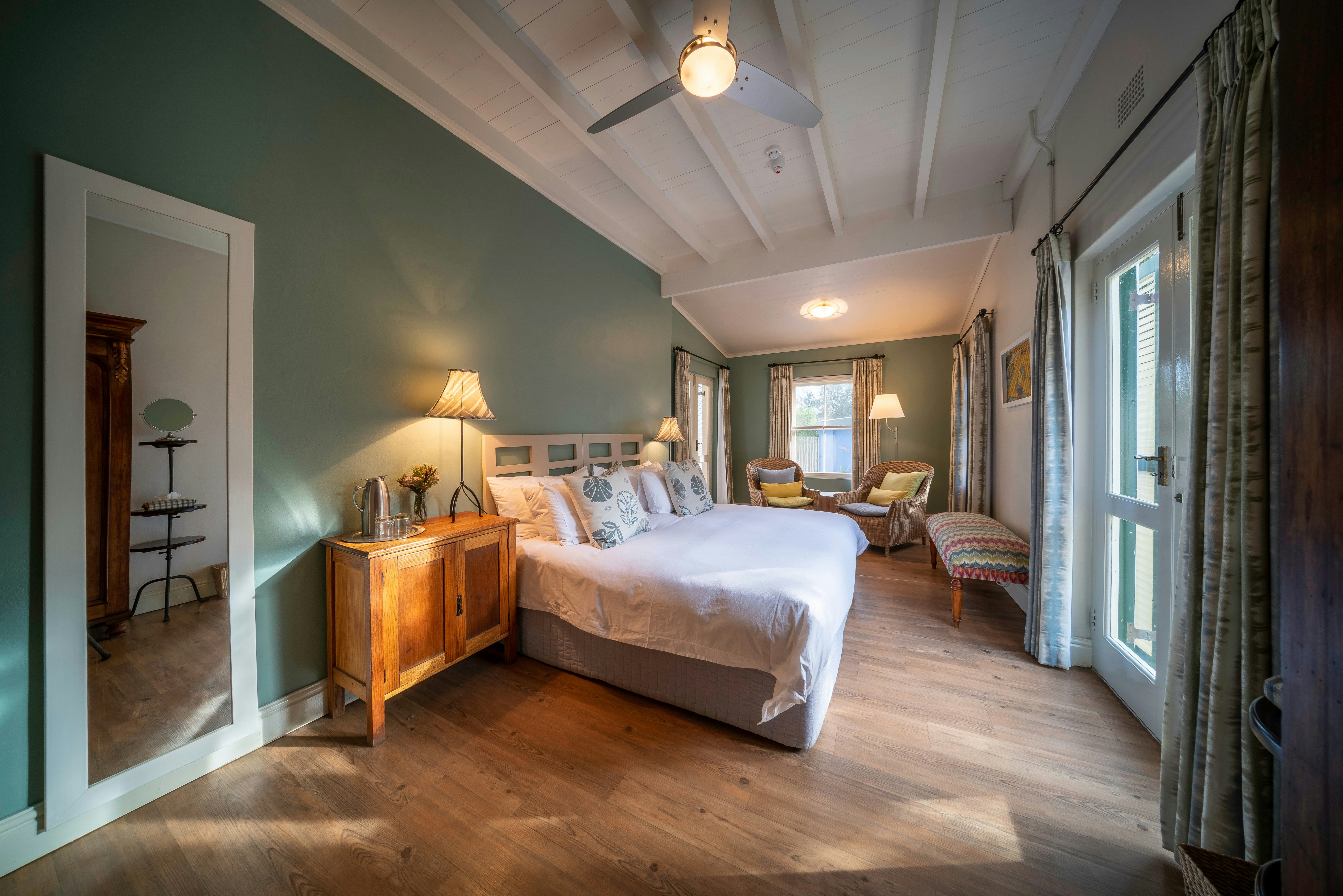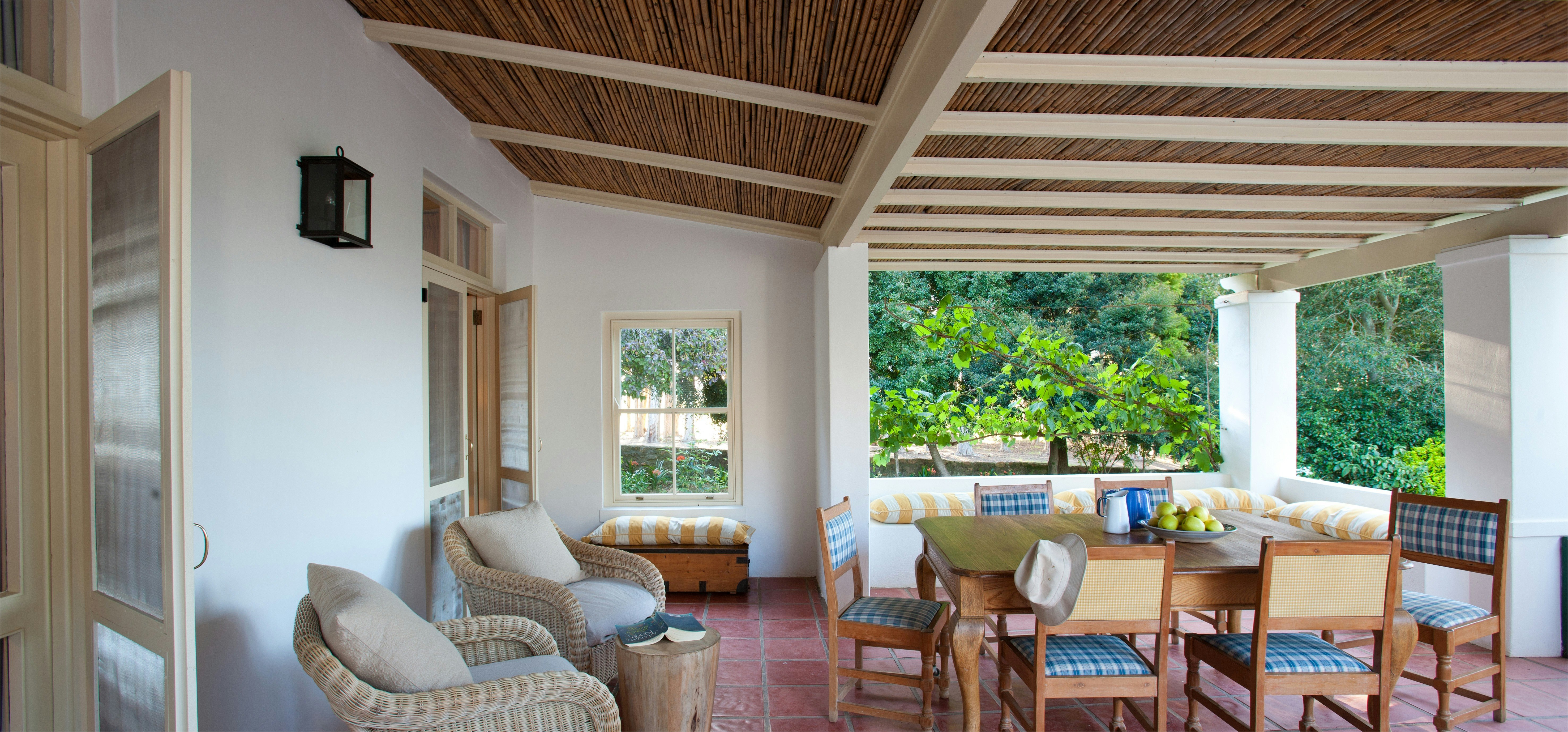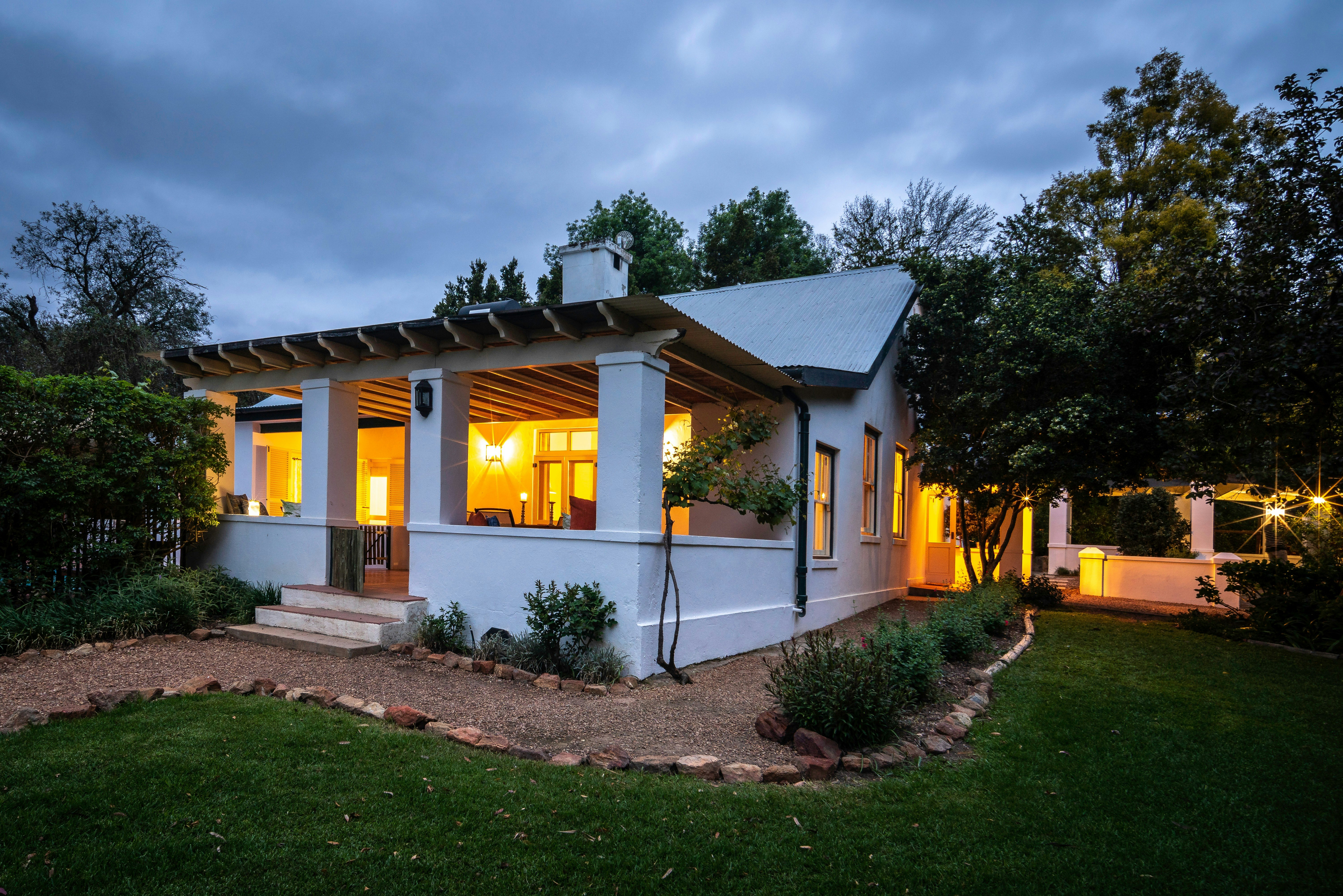 There are 4 double rooms with private bathrooms in the well-furnished farmhouse, and 2 separate suites outside, each with its own secluded verandah looking over the veld and up to the mountains. These rooms are furnished with either twin beds or a king-size bed; fitted with crisp cotton bedding and elegant fabrics. Complimentary toiletries are available in the Victorian-style bathrooms.