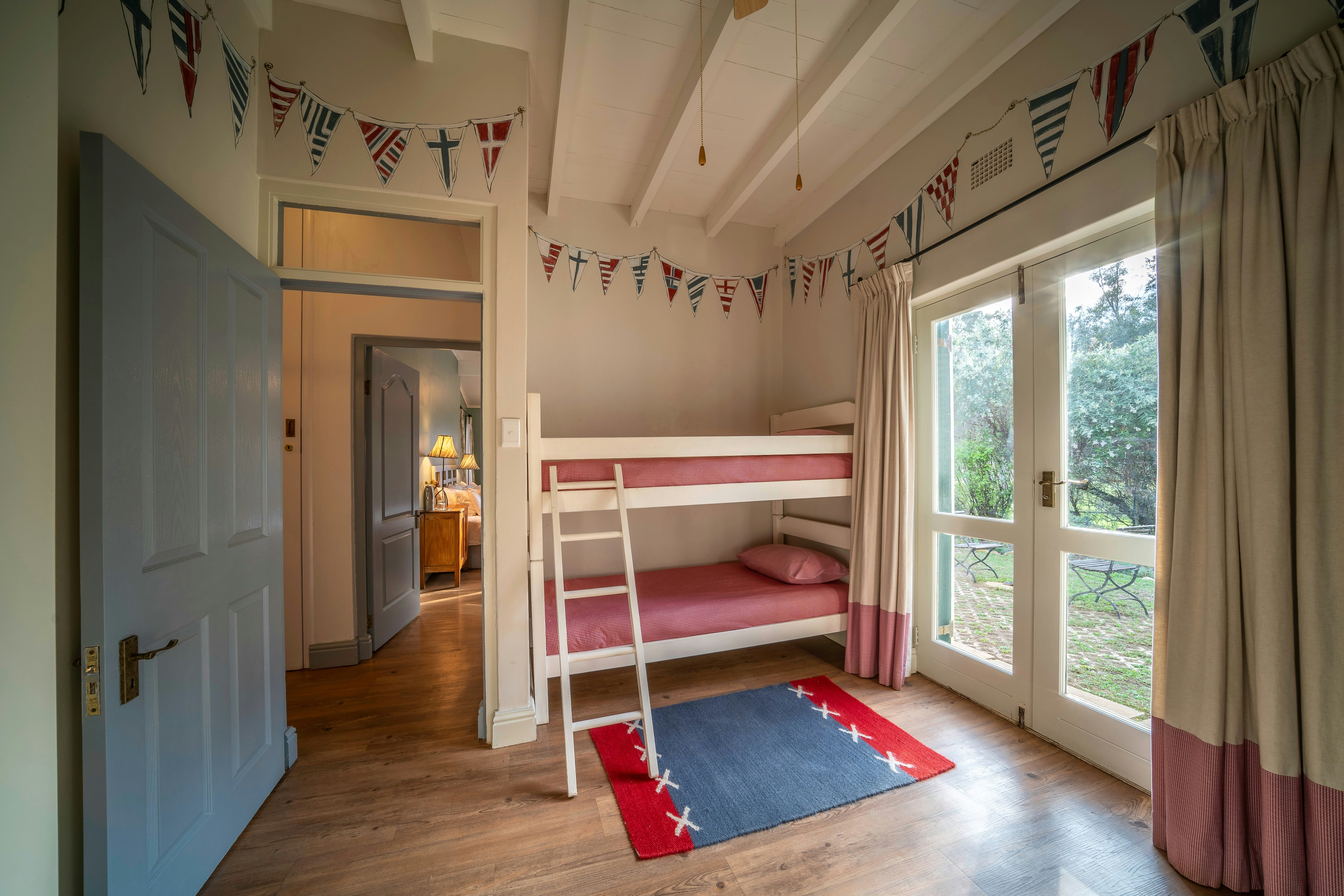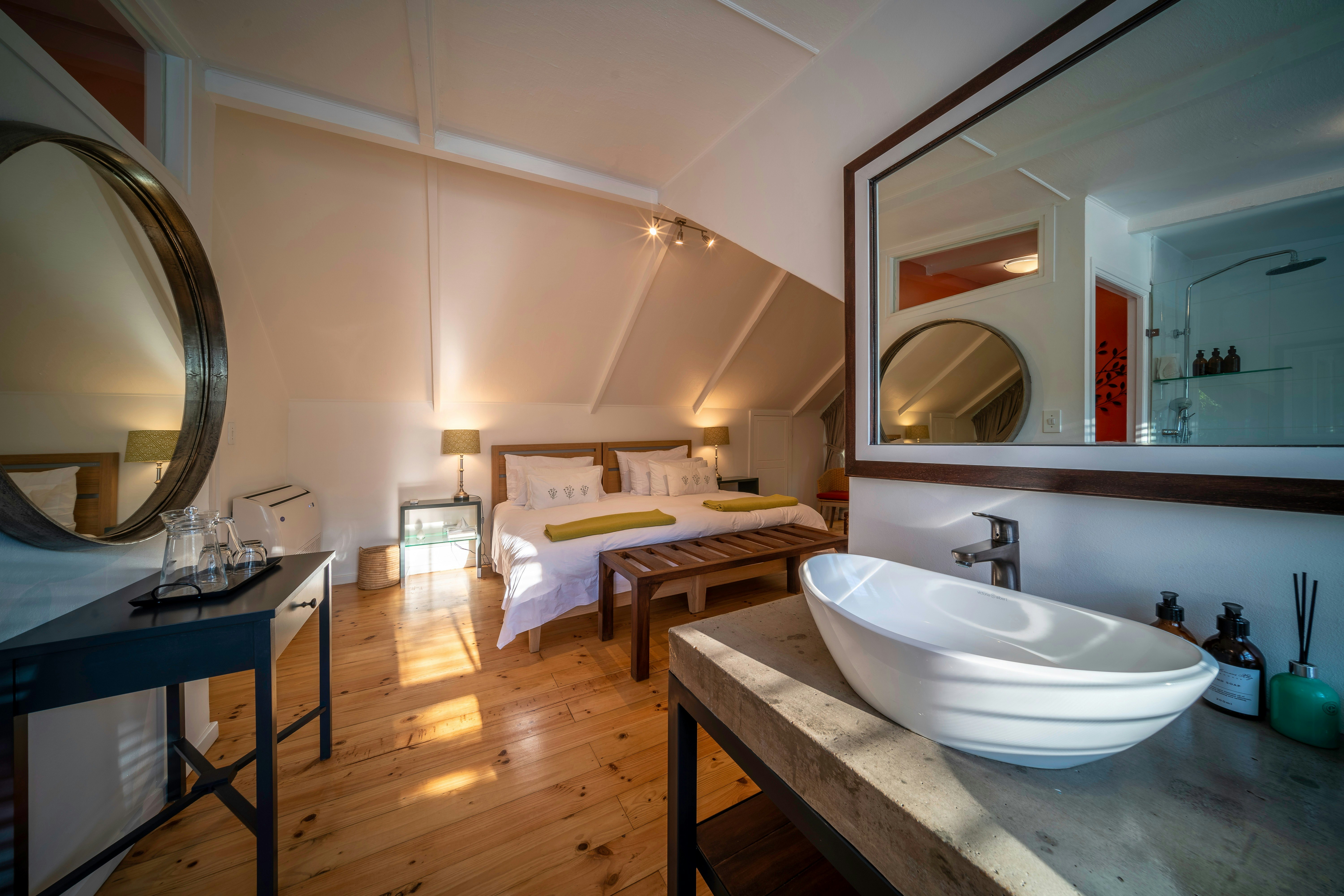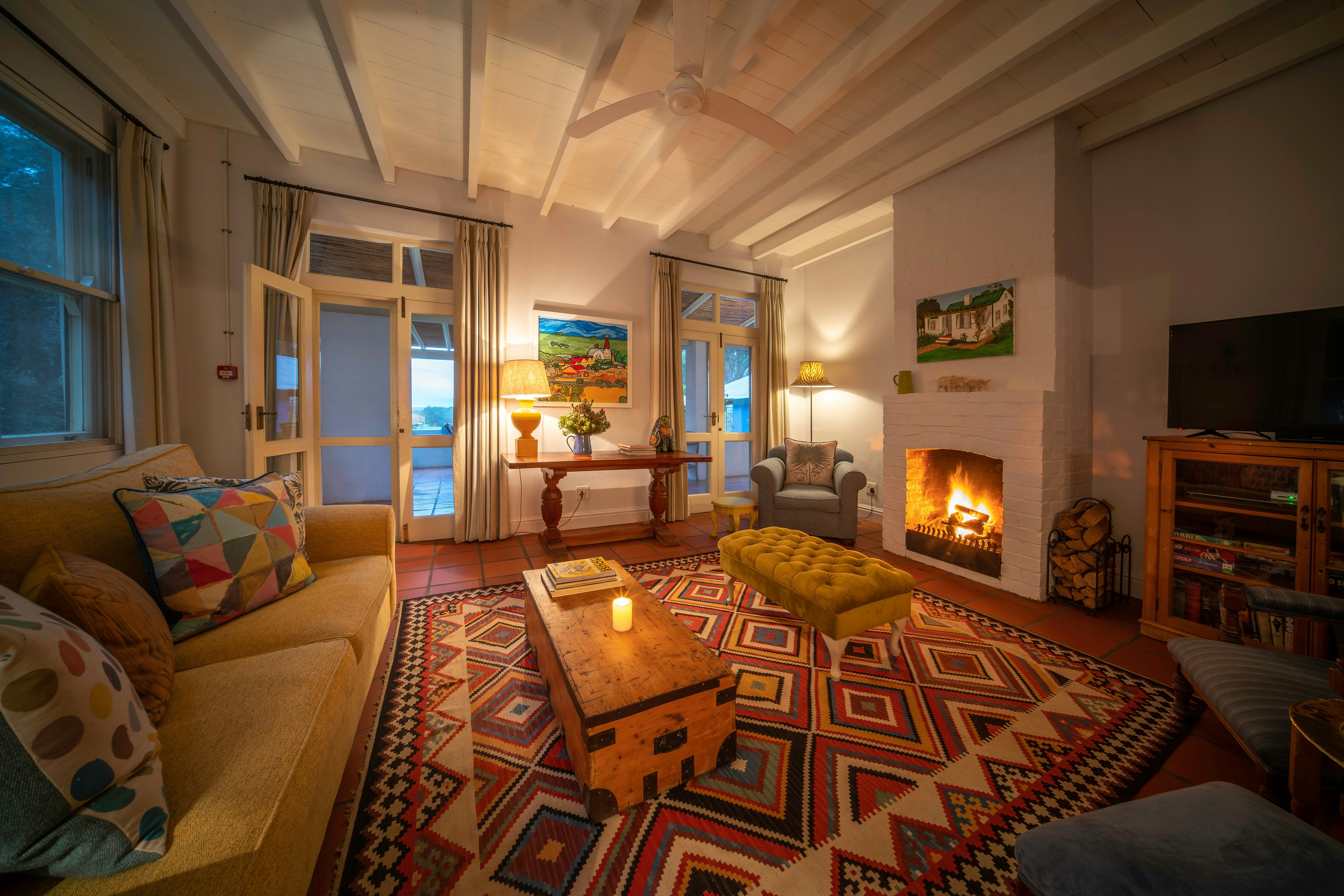 There are 4 double rooms with private bathrooms in the well-furnished farmhouse, and 2 separate suites outside, each with its own secluded verandah looking over the veld and up to the mountains. These rooms are furnished with either twin beds or a king-size bed; fitted with crisp cotton bedding and elegant fabrics. Complimentary toiletries are available in the Victorian-style bathrooms.